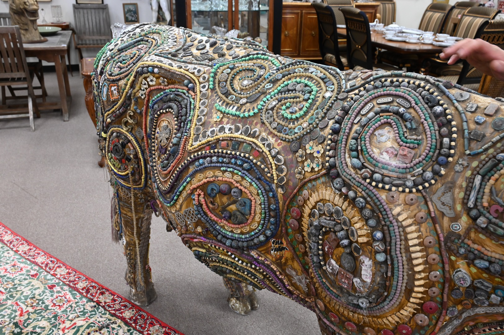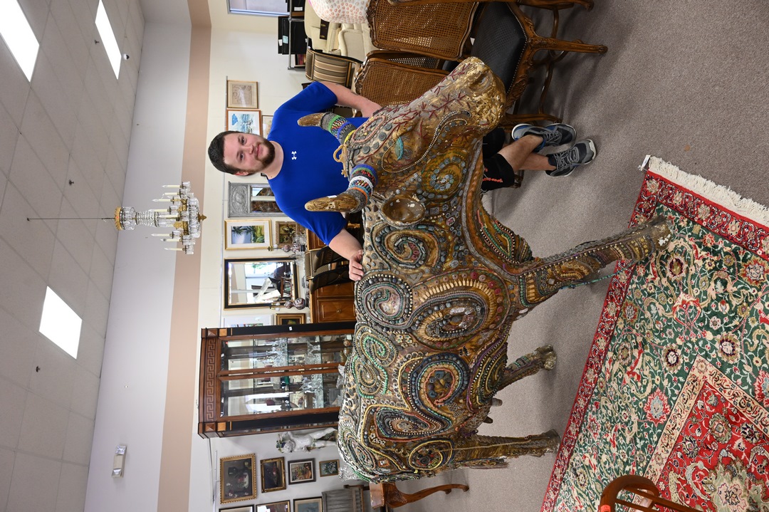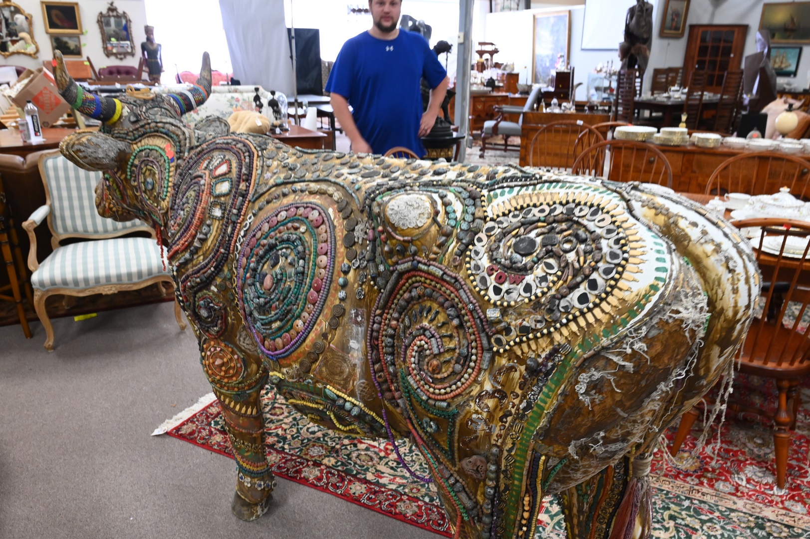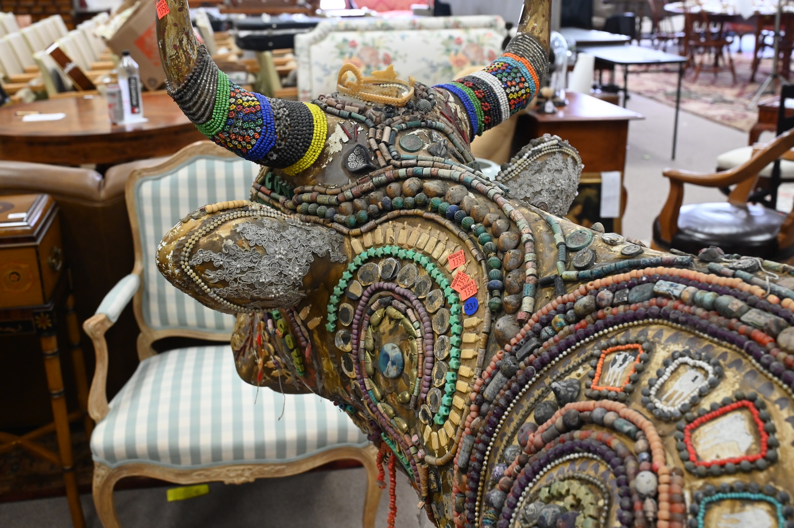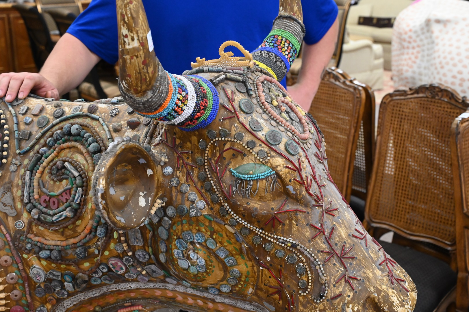 Fiberglass Cow Sculpture, having gold painted body with applied beadwork ornamentation, height 57 inches, width 95 inches, depth 27 inches.