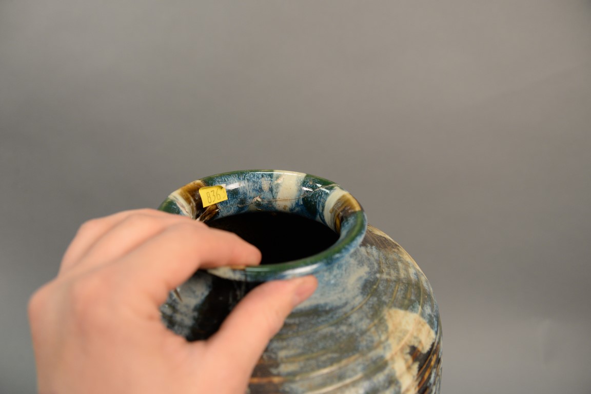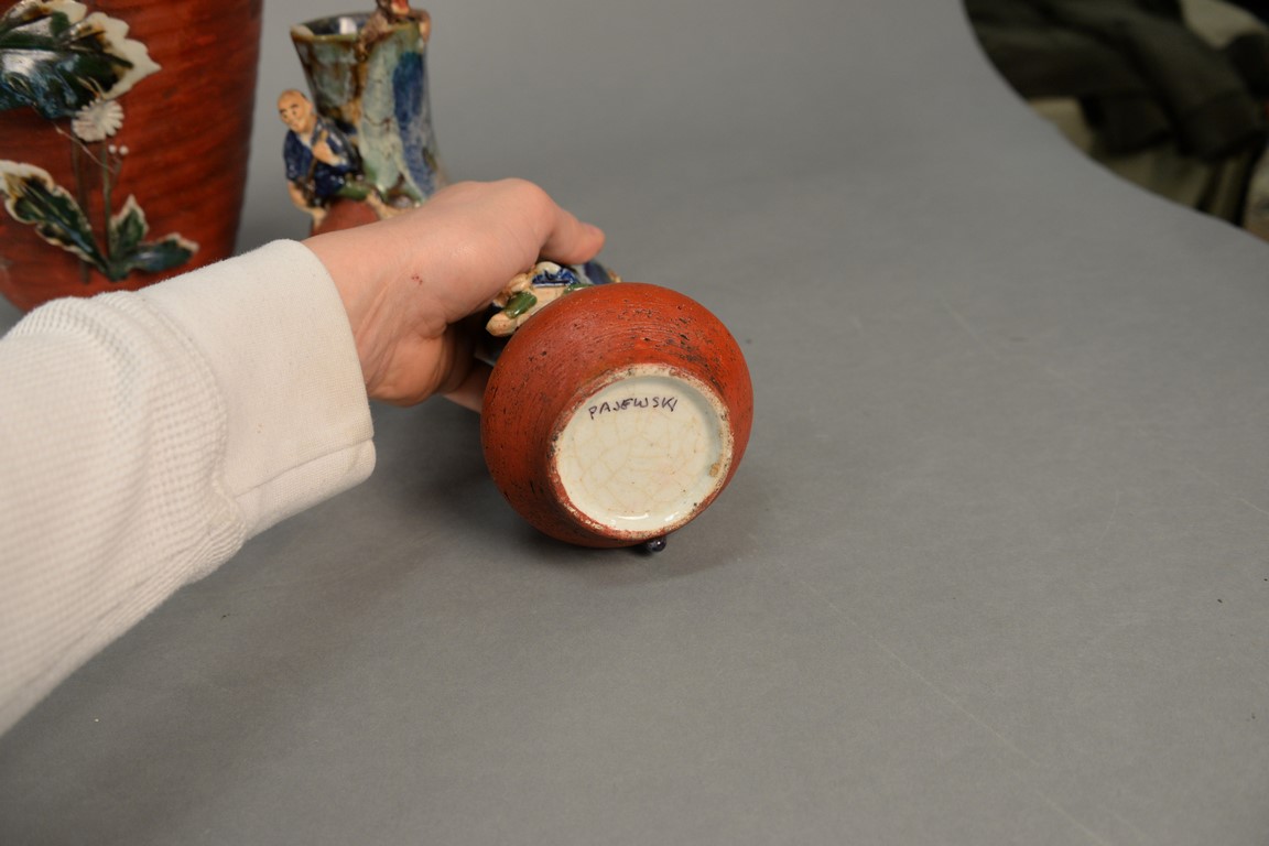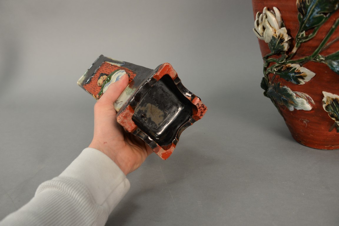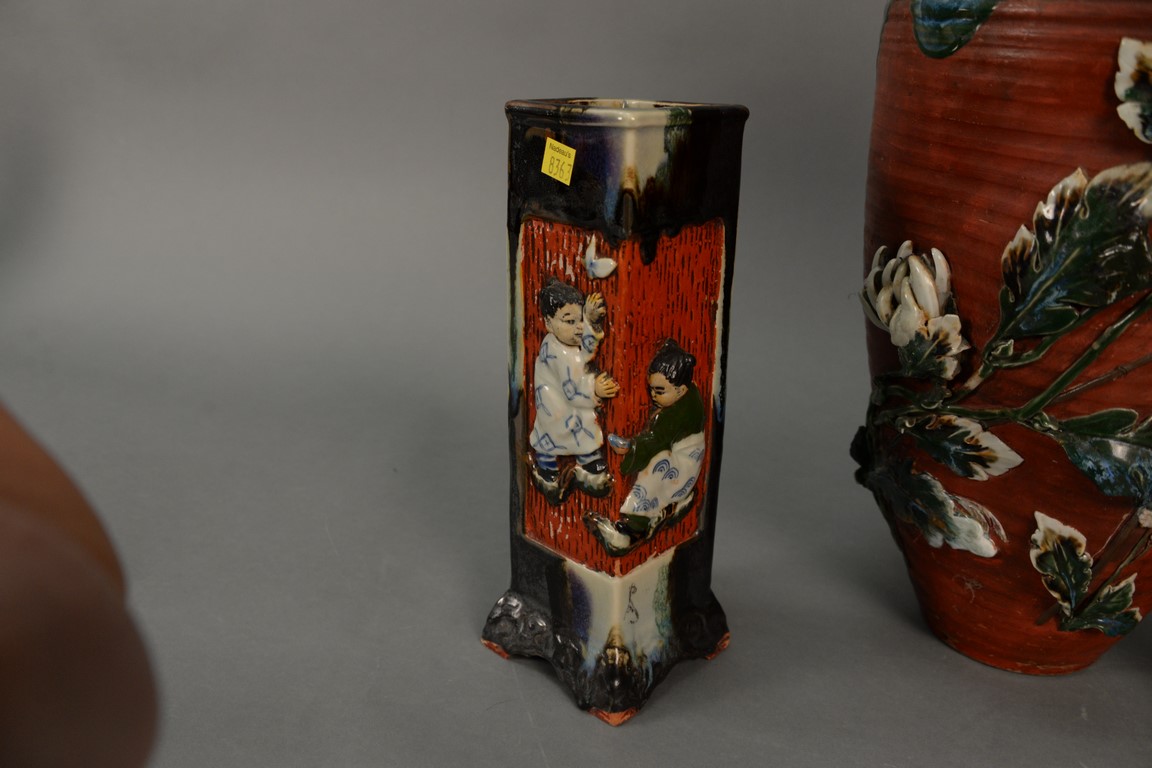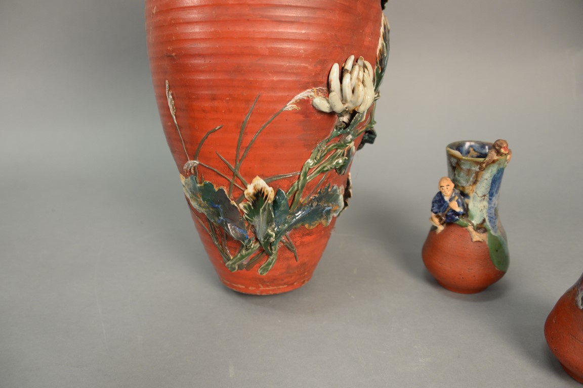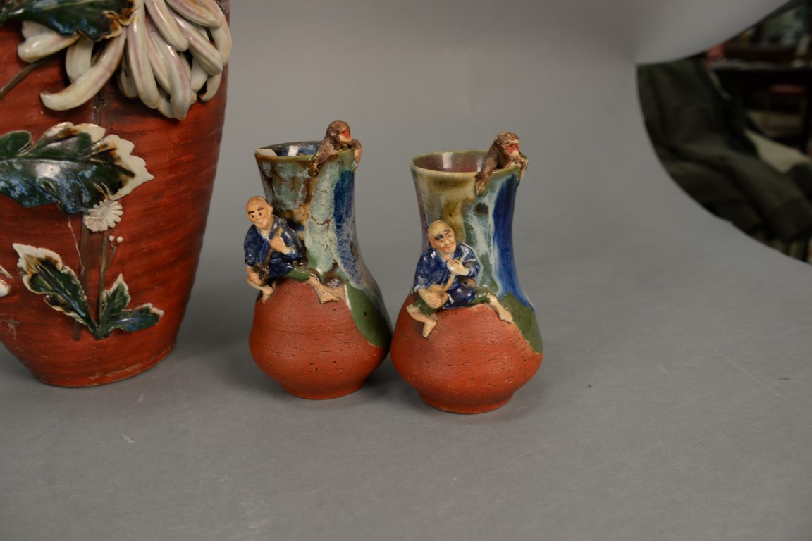 Lot 258: Four Japanese three dimensional vases including a large vase with molded flowers and three smaller vases with molded figures. heigh…