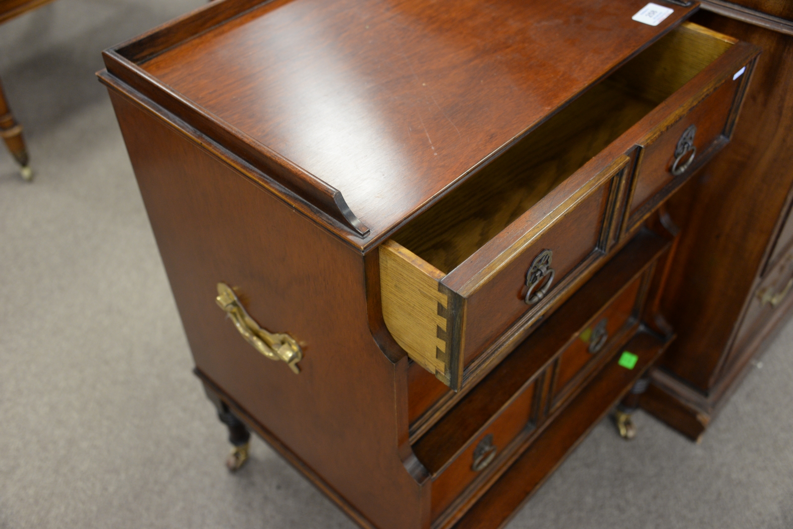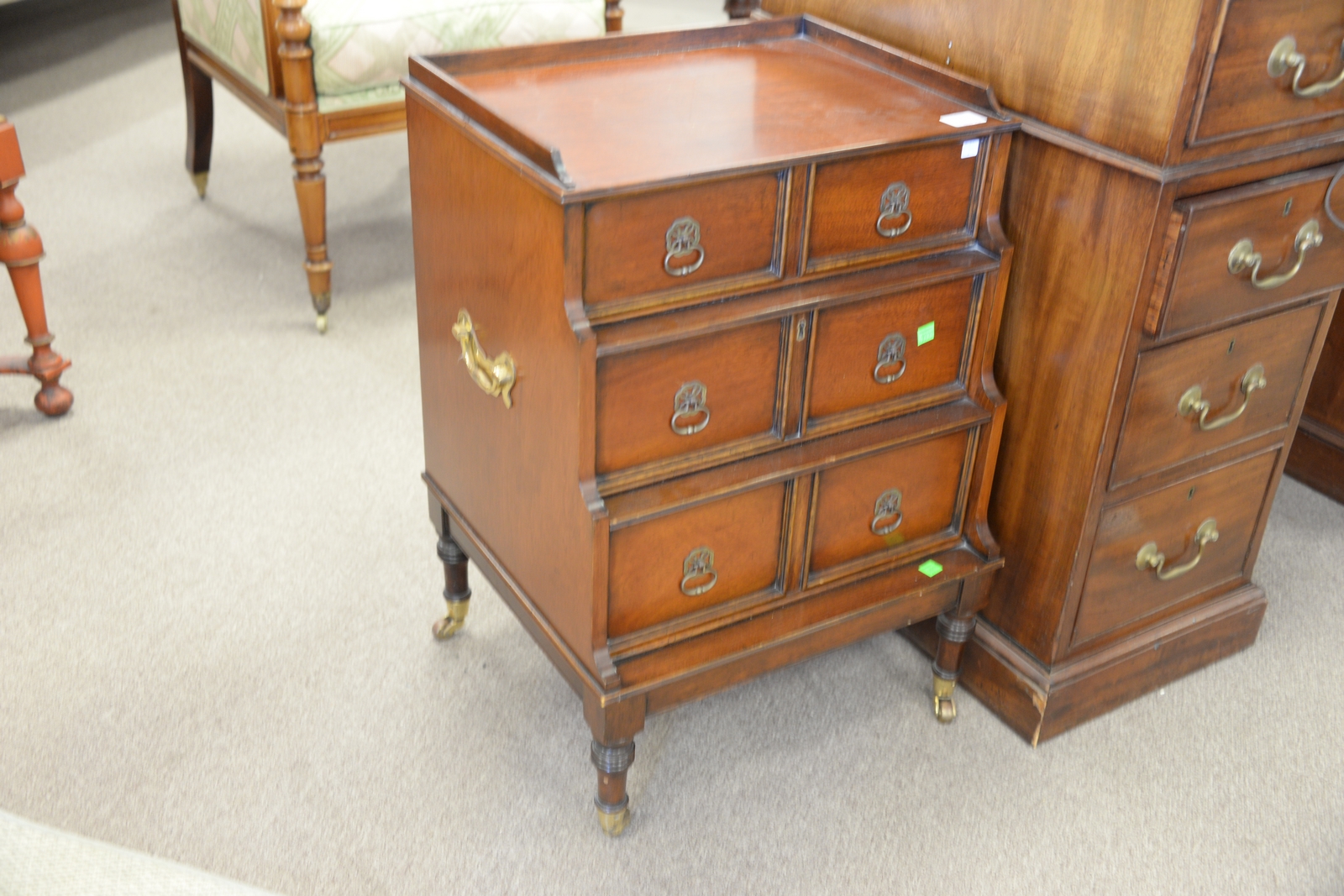 Lot 258: George IV style mahogany cabinet of three drawers on brass wheels. ht. 27in., wd. 18 1/2 in., dp. 17in.