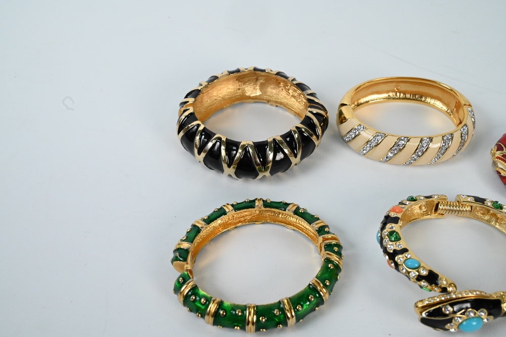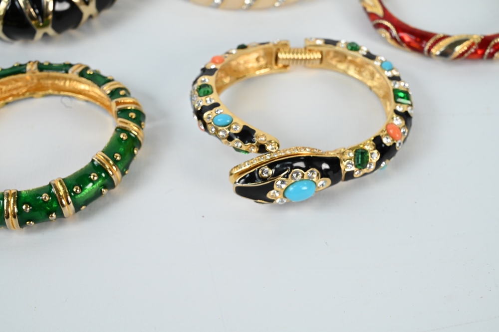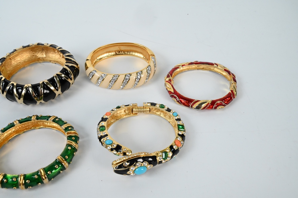 Lot 258: Group of Five Enameled Bracelets, to include Kenneth Lane enameled snake bracelet, green enameled bracelet, NLH enameled bracelet, w…