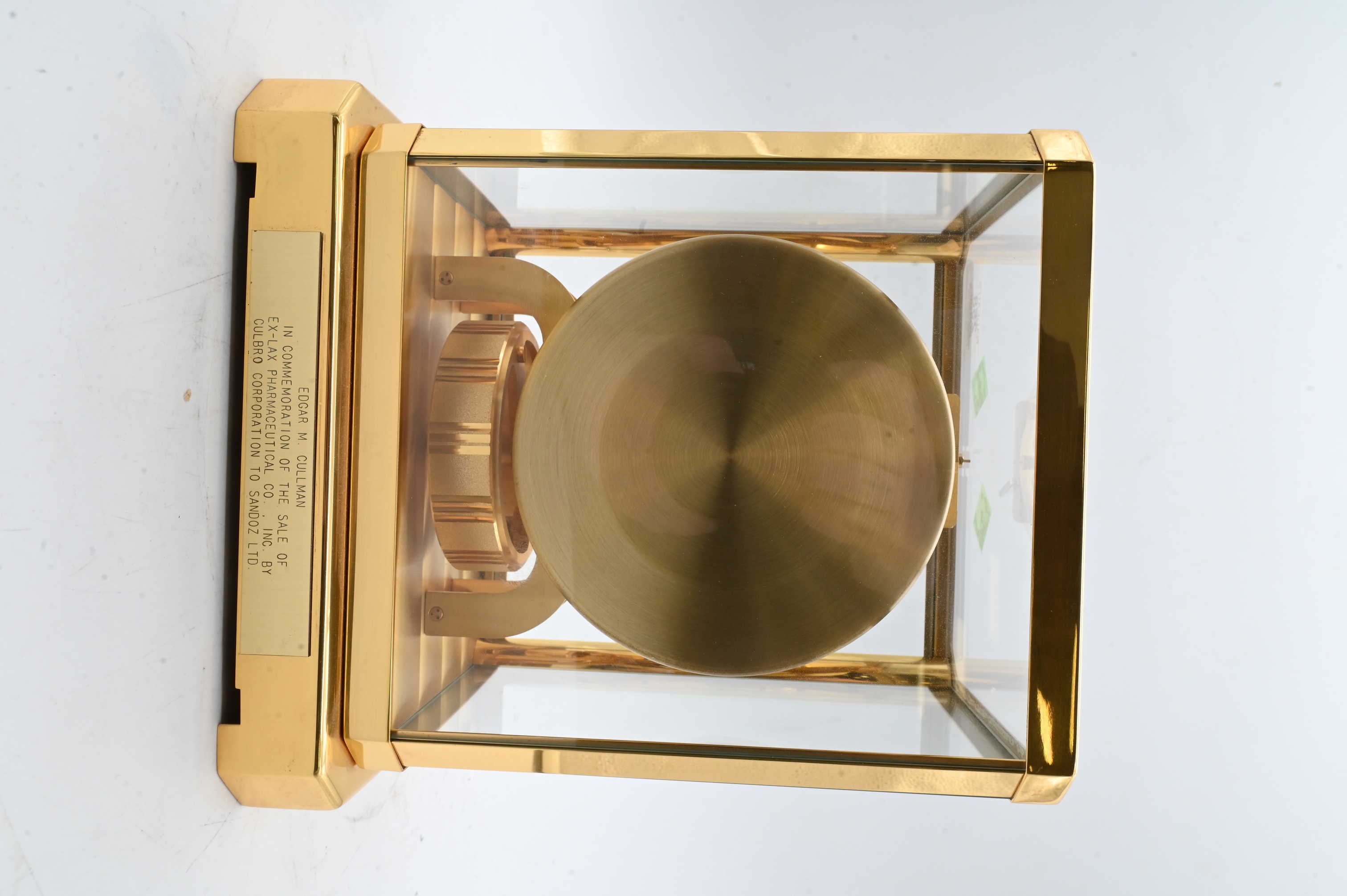 Having a brass case with glass panels enclosing the visible movement, the white dial with applied Arabic numerals and baton markers, the dial marked Atmos, raised on a shaped base