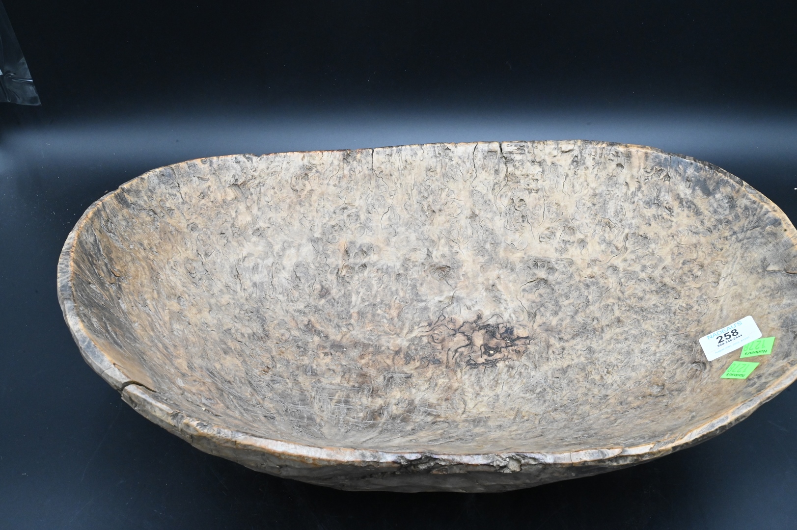 Large Burl Oblong Bowl, rough cut bottom, height 6 3/4 inches, length 20 inches. Provenance: Estate of Peter Tillou, Litchfield, Connecticut.