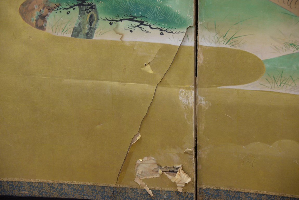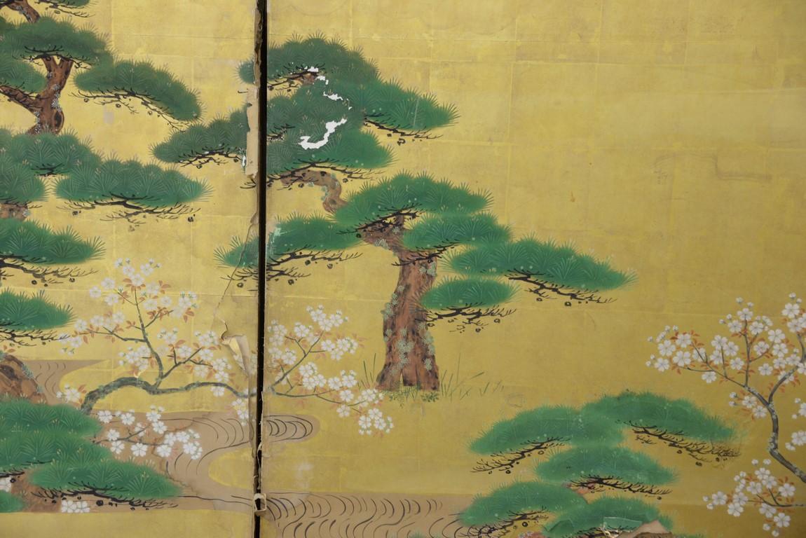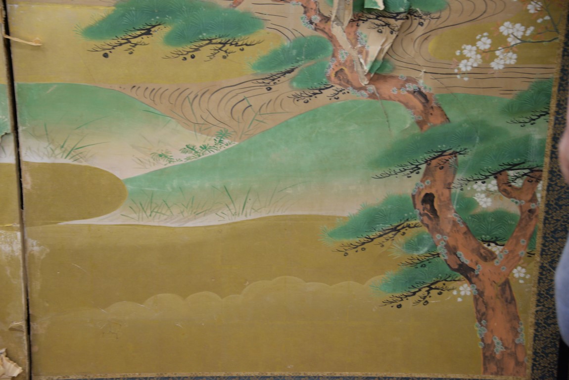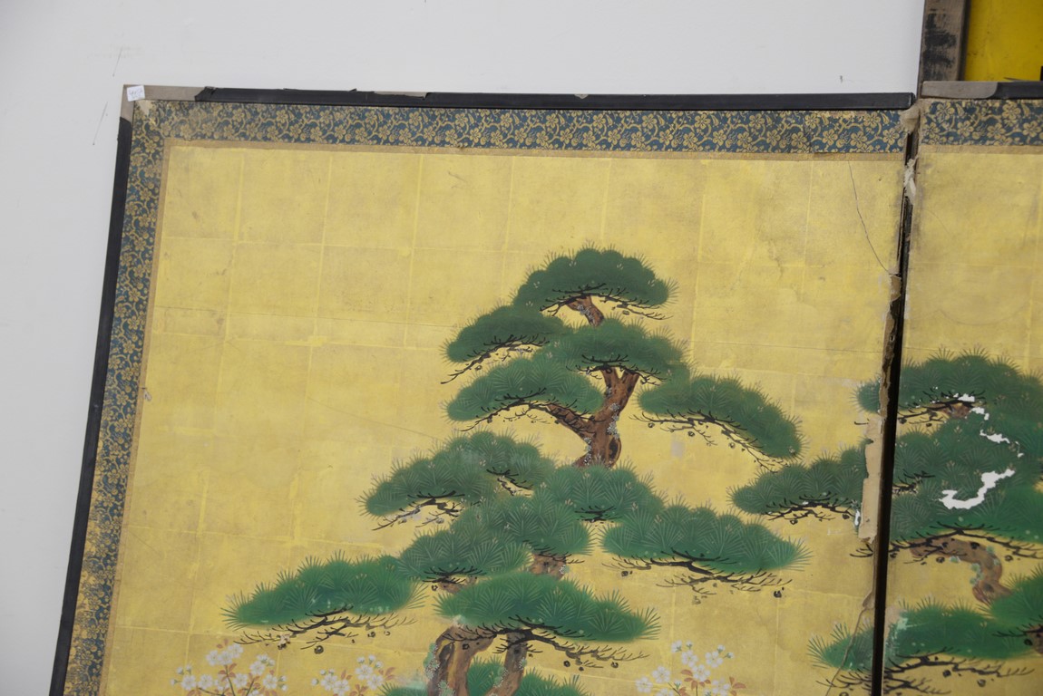 Large two part Asian painting, gilt with blossoming wild flowers.