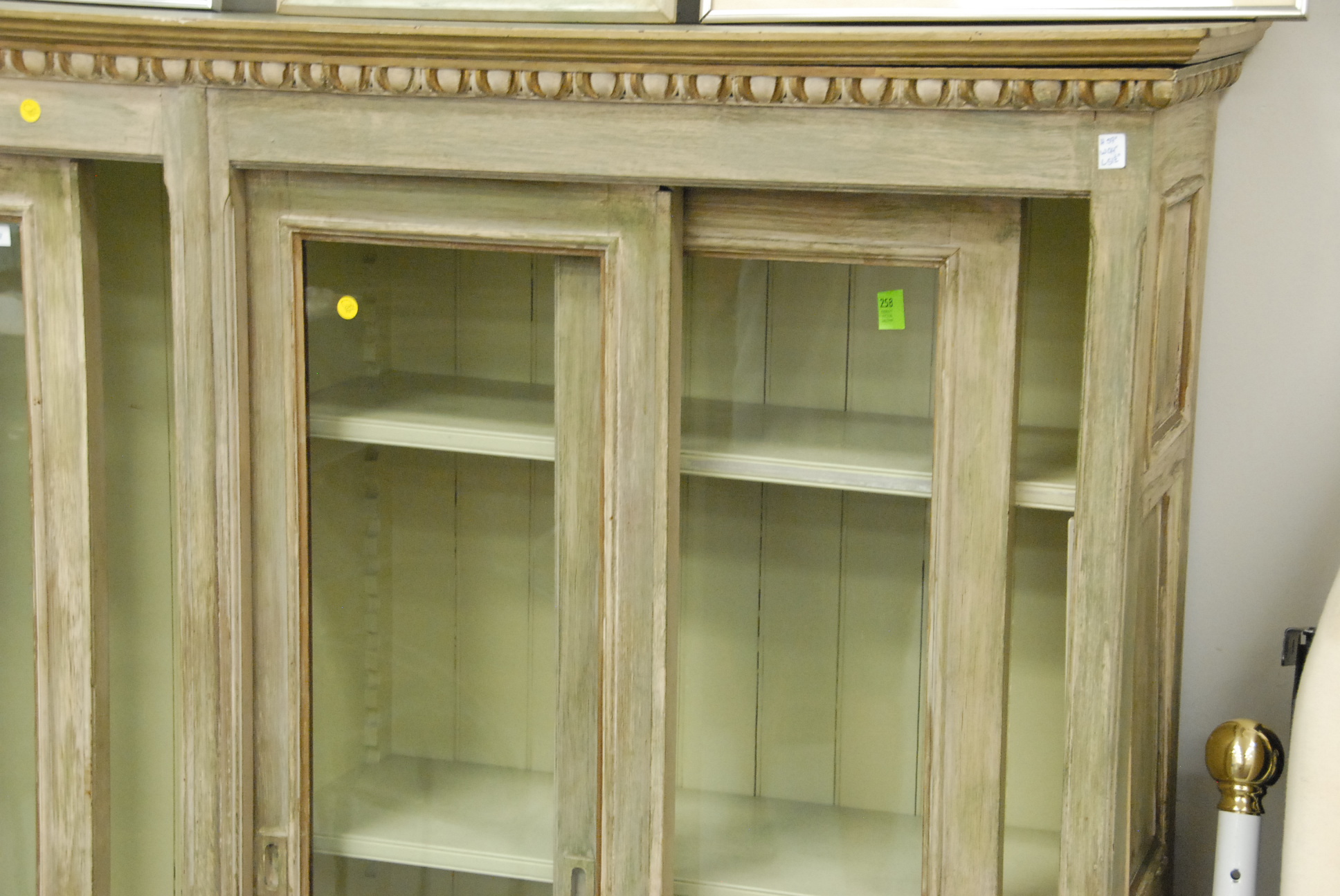 Large Victorian book case in parts with sliding glass doors, painted.