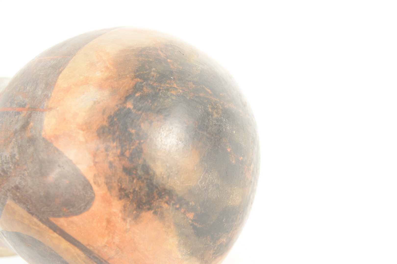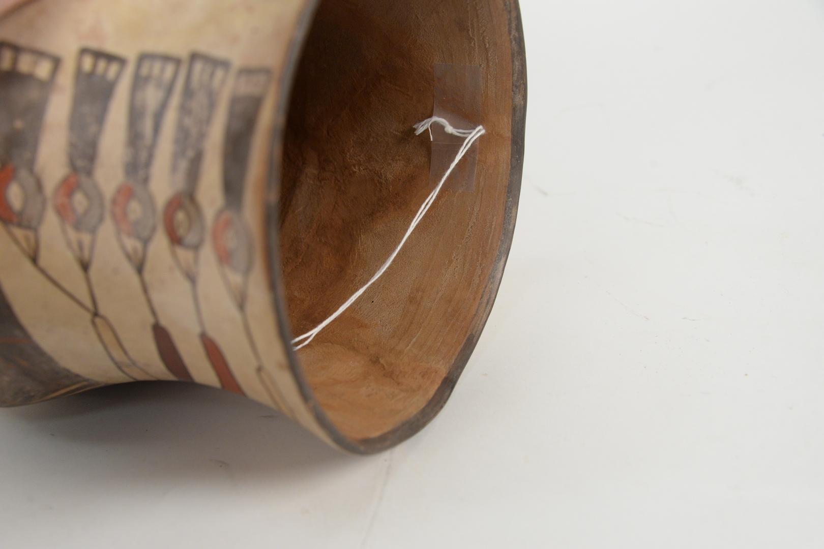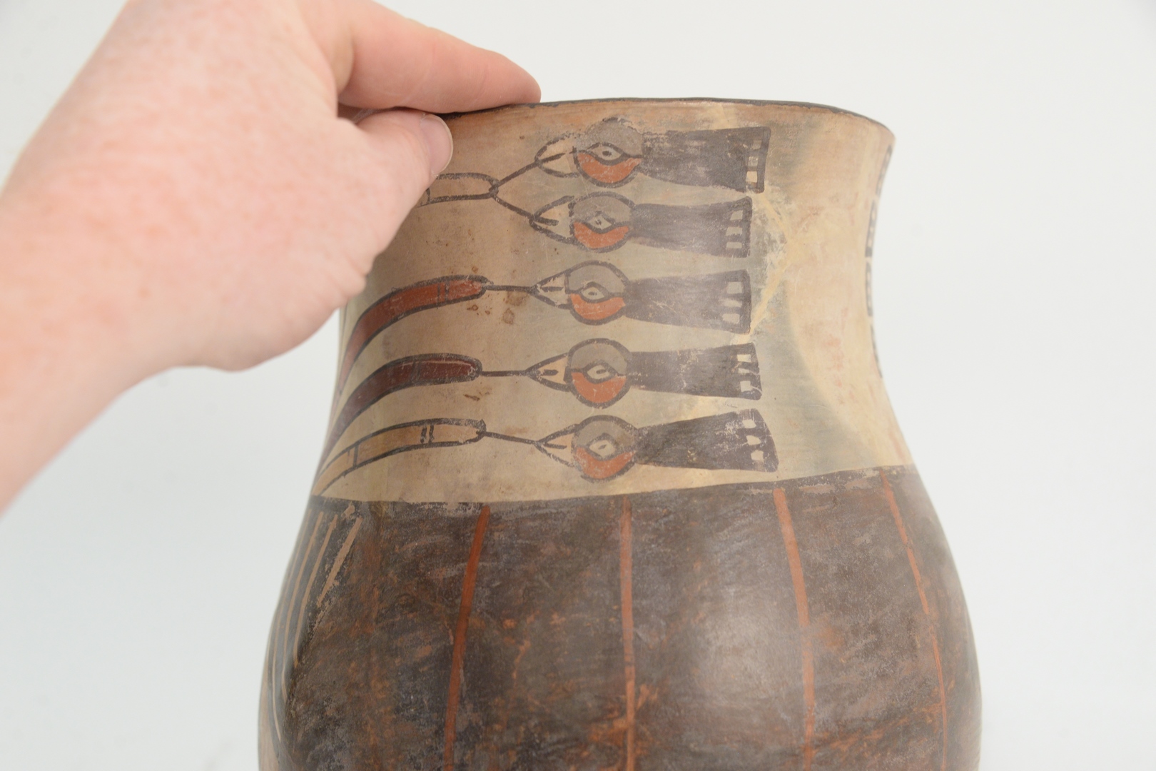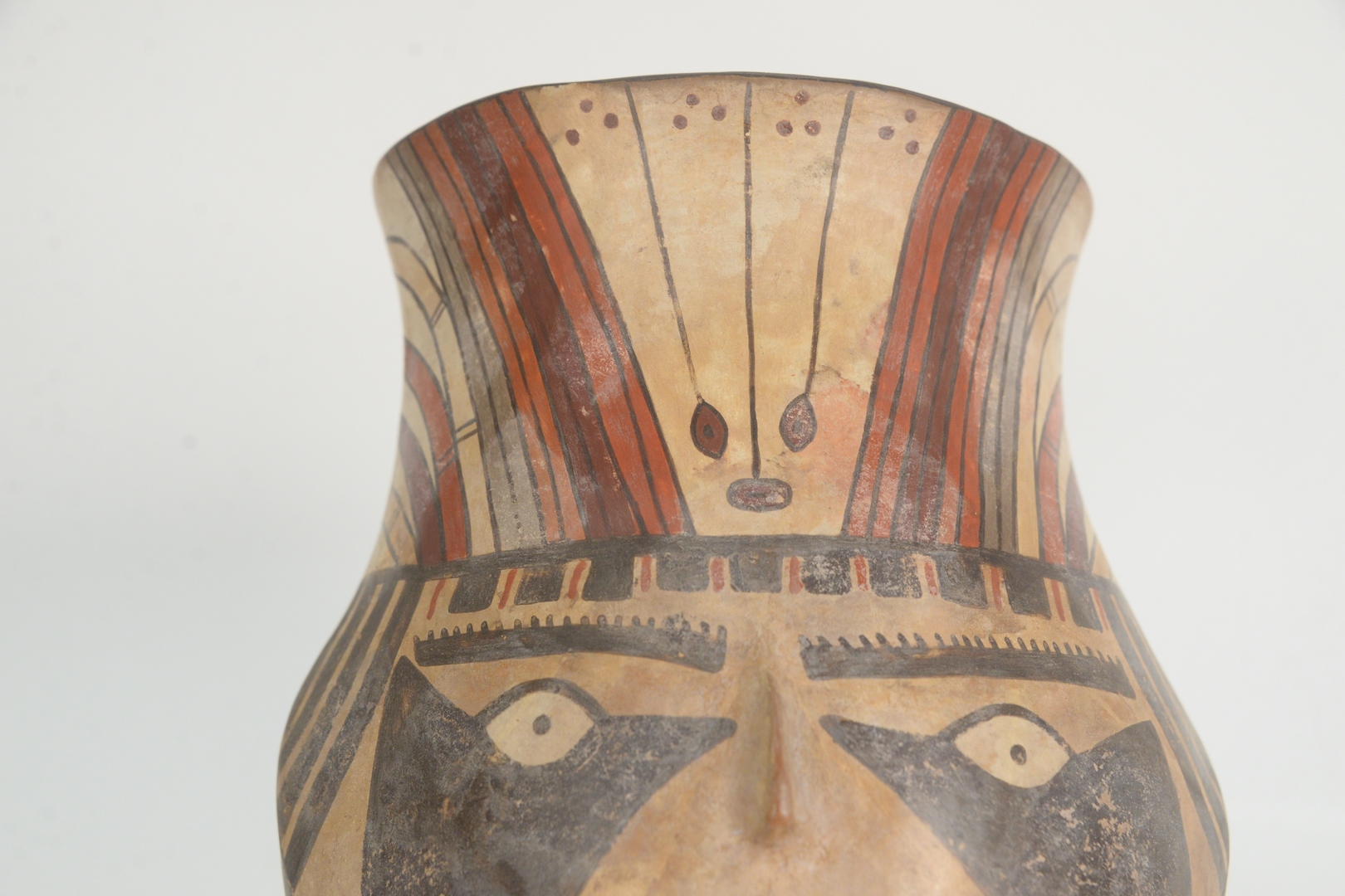 Lot 258: Pre-Columbian Pottery, portrait pot or vessel depicting polychrome head with face and headdress, height 10 1/2 inches, diameter 7 inches.