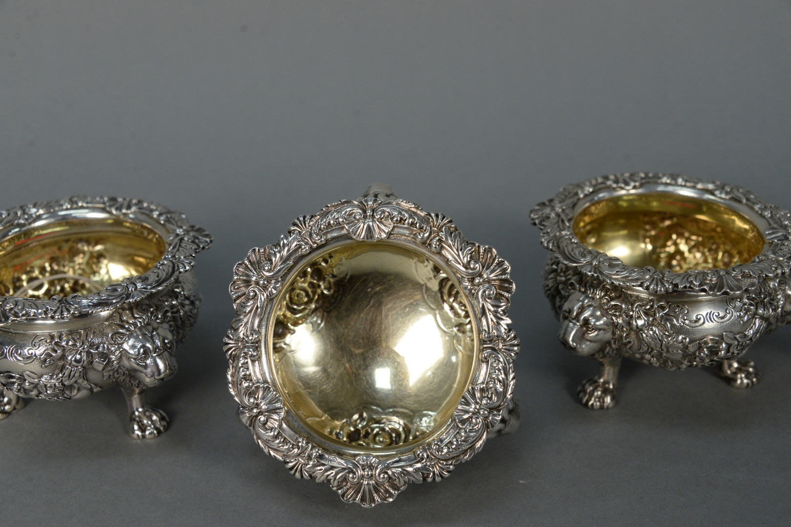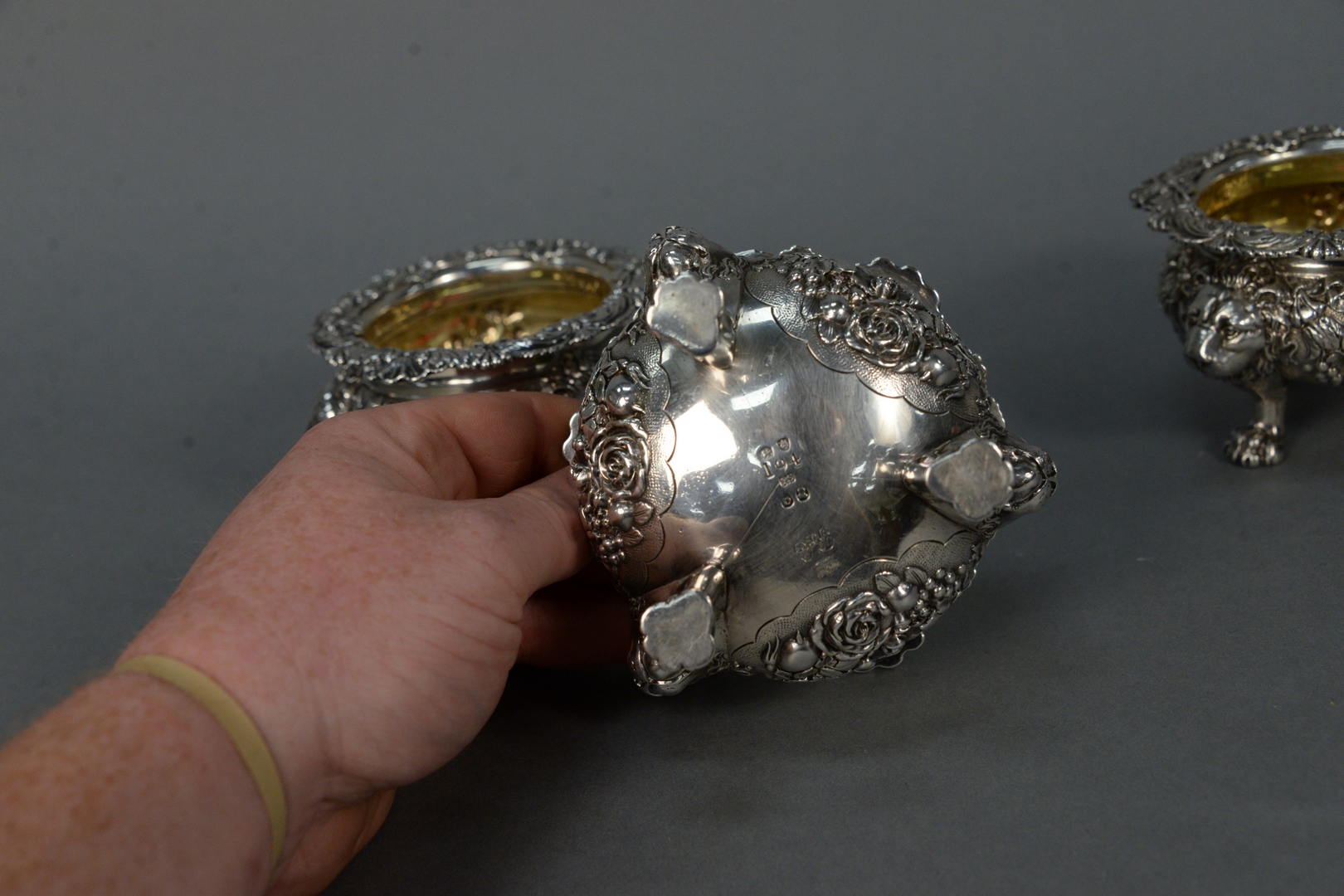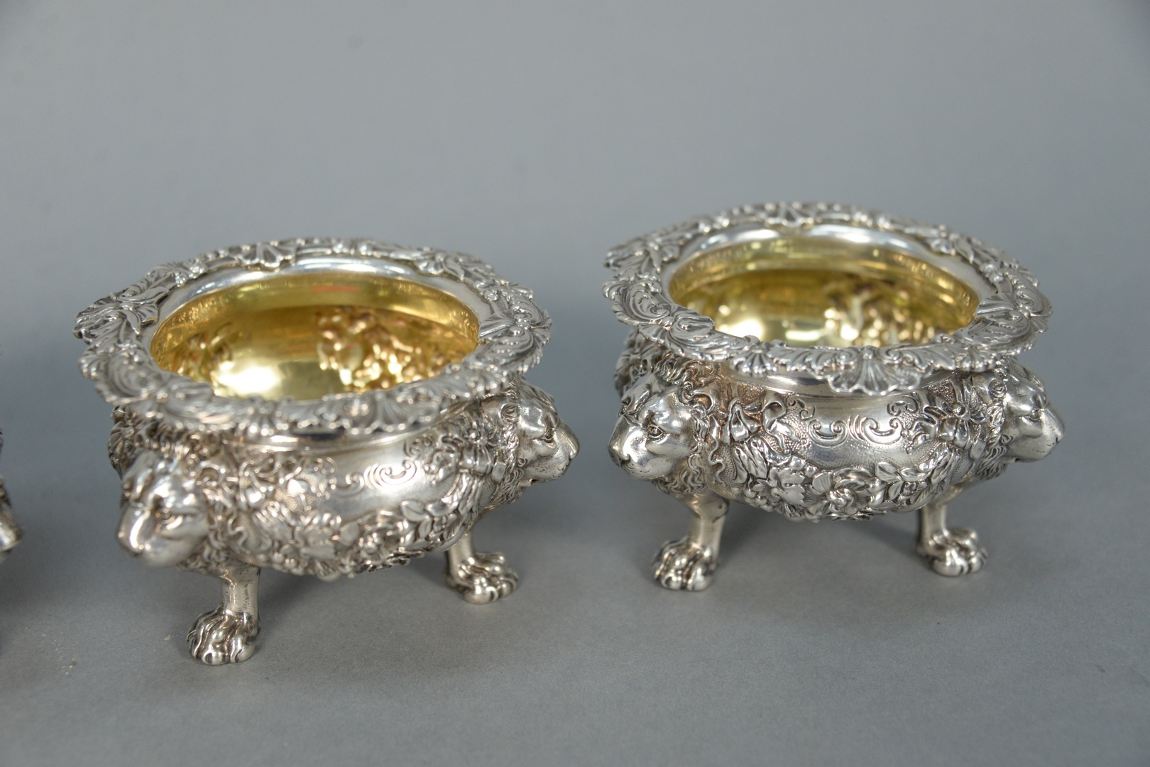 Lot 258: Set of Four Paul Storr Sterling Silver Open Salts top with scroll and shells on floral repousse bodies with lions, set on claw feet …