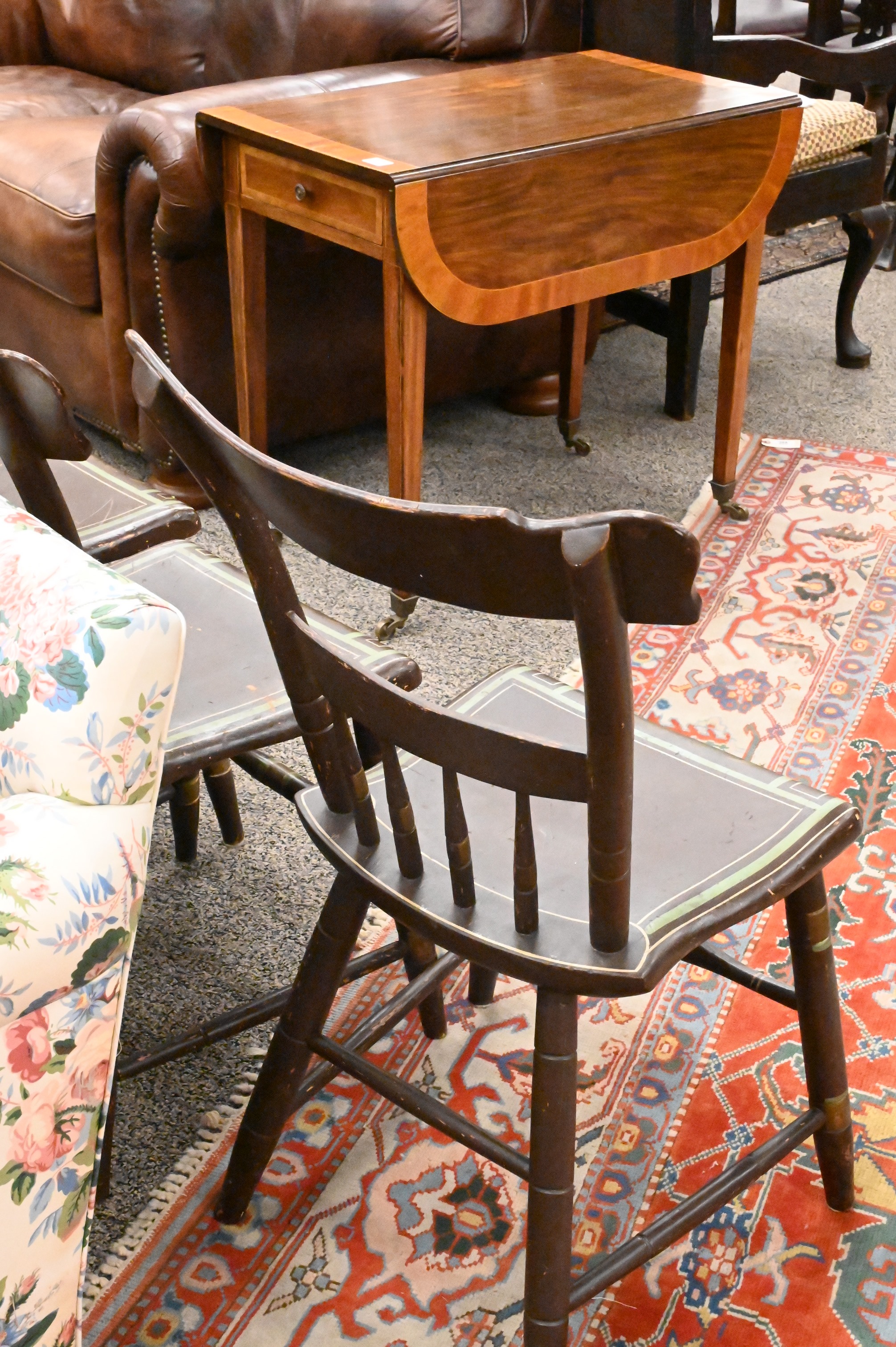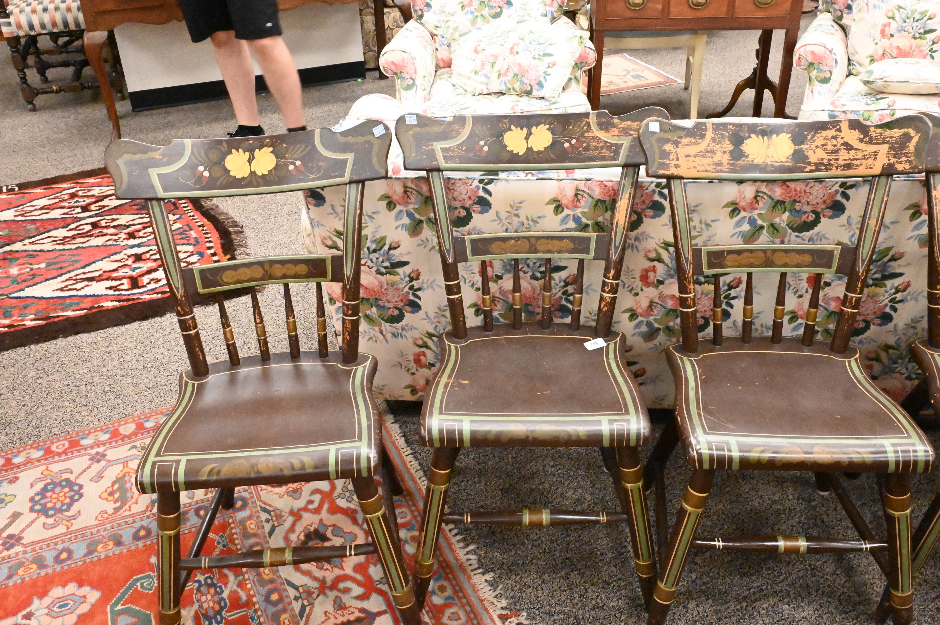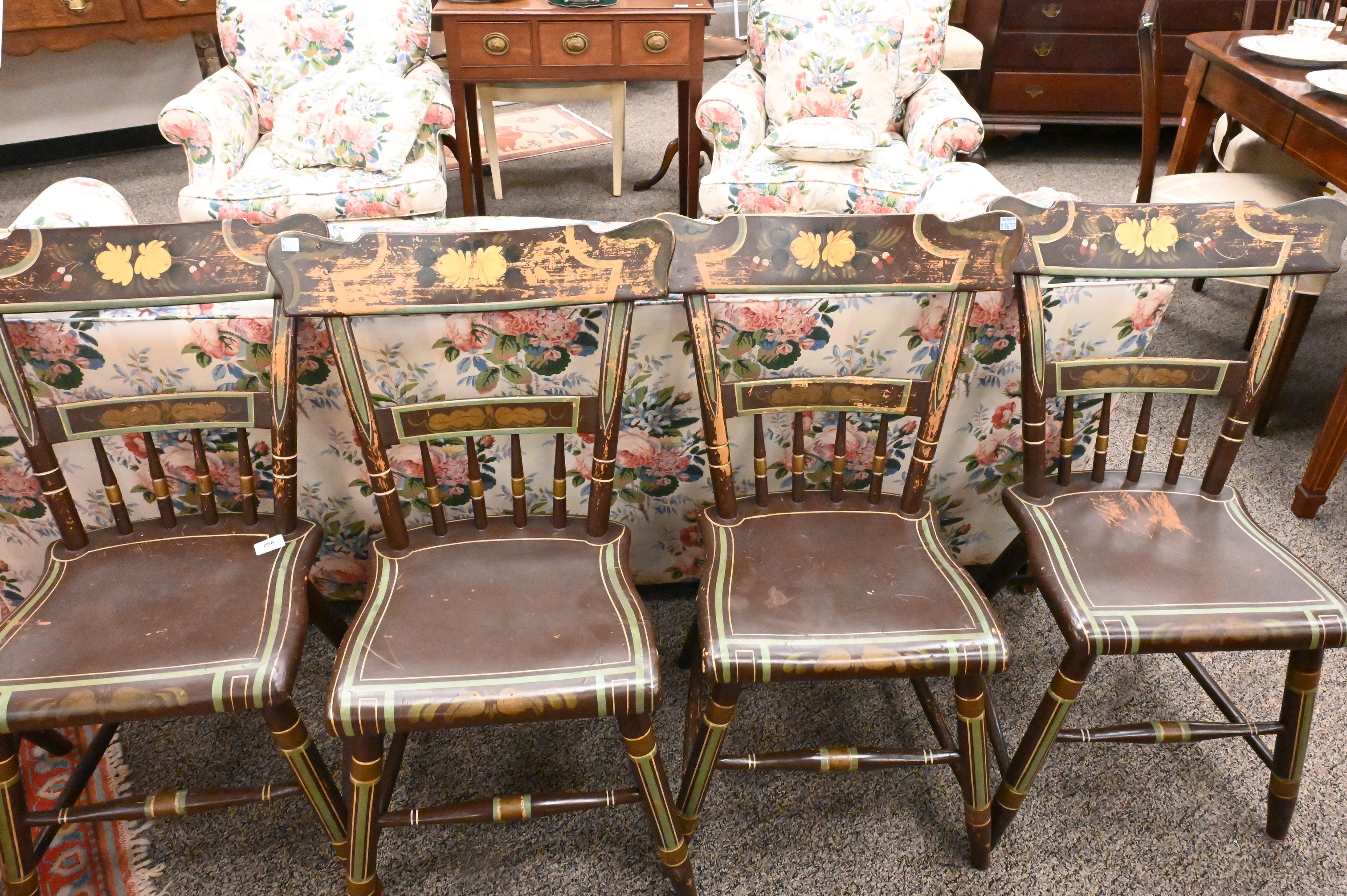 Set of Six Sheraton Plank Seat Chairs, with original paint decor, c. 1840, seat 17 inches, height 32 1/2 inches.