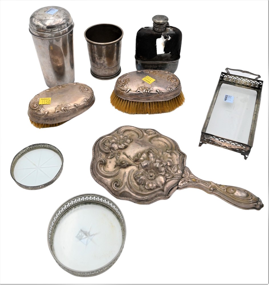 Lot 258: Sterling Silver Lot, to include cocktail shaker cup, mirror, brushes, flask, etc., 16.9 t.oz. weighable plus six pieces.