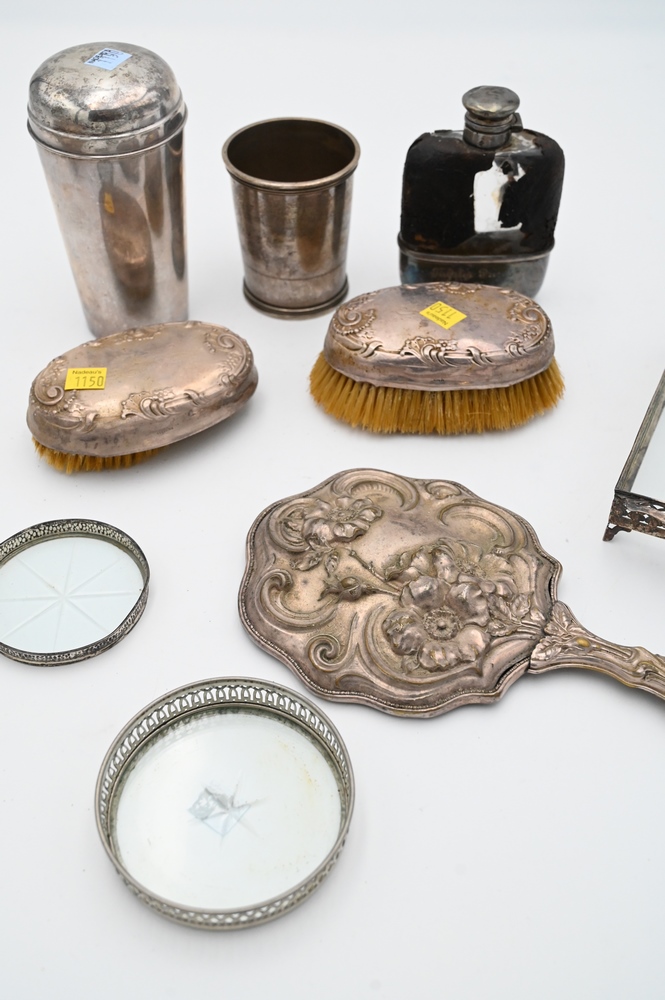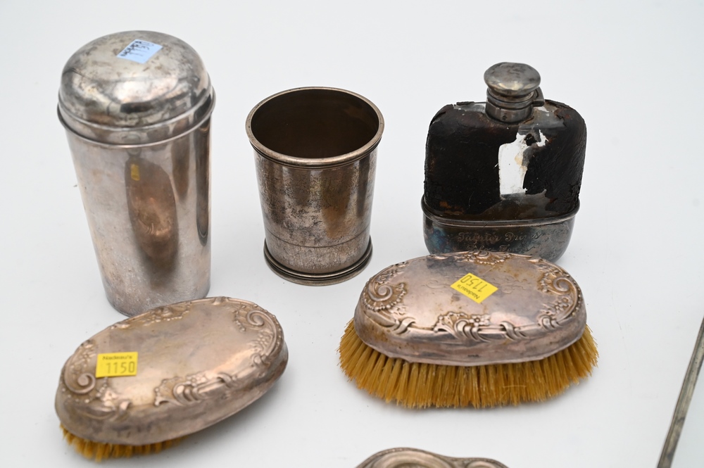 Sterling Silver Lot, to include cocktail shaker cup, mirror, brushes, flask, etc., 16.9 t.oz. weighable plus six pieces.