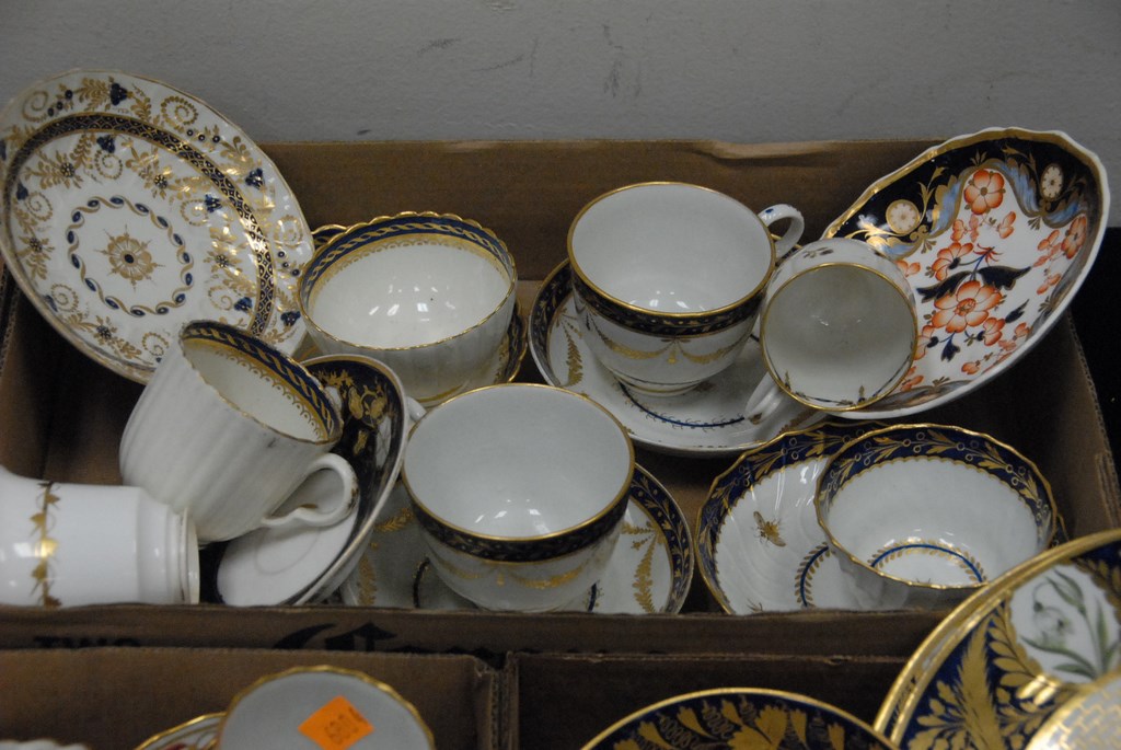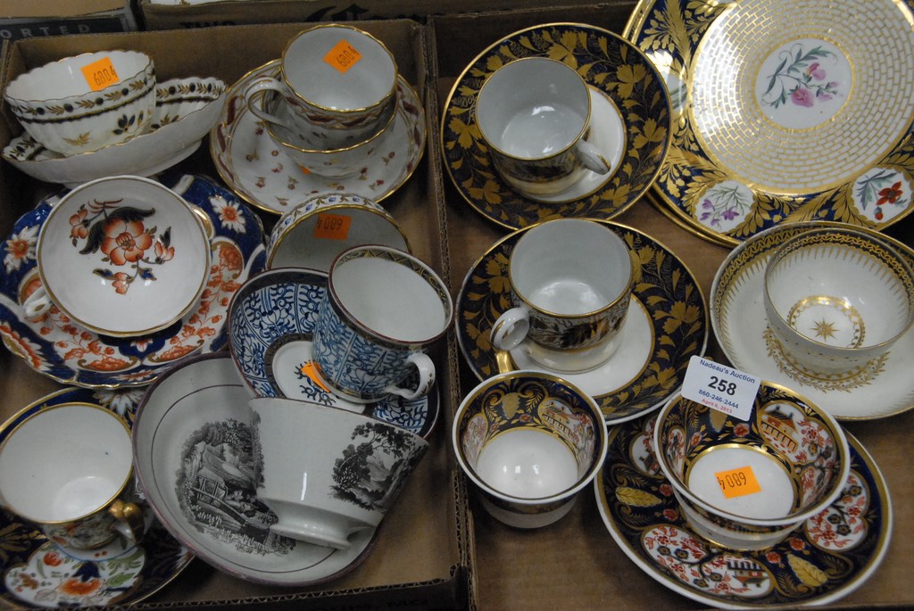 Lot 258: Three tray lots of cups and saucers including Worcester, Royal Crown Derby, and English transferware plus two plates.