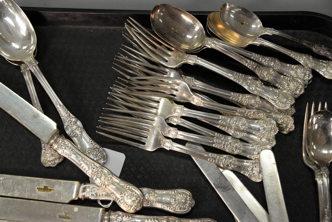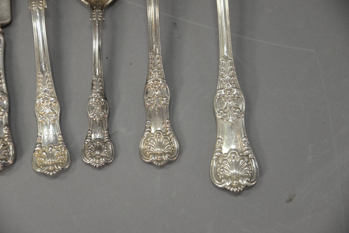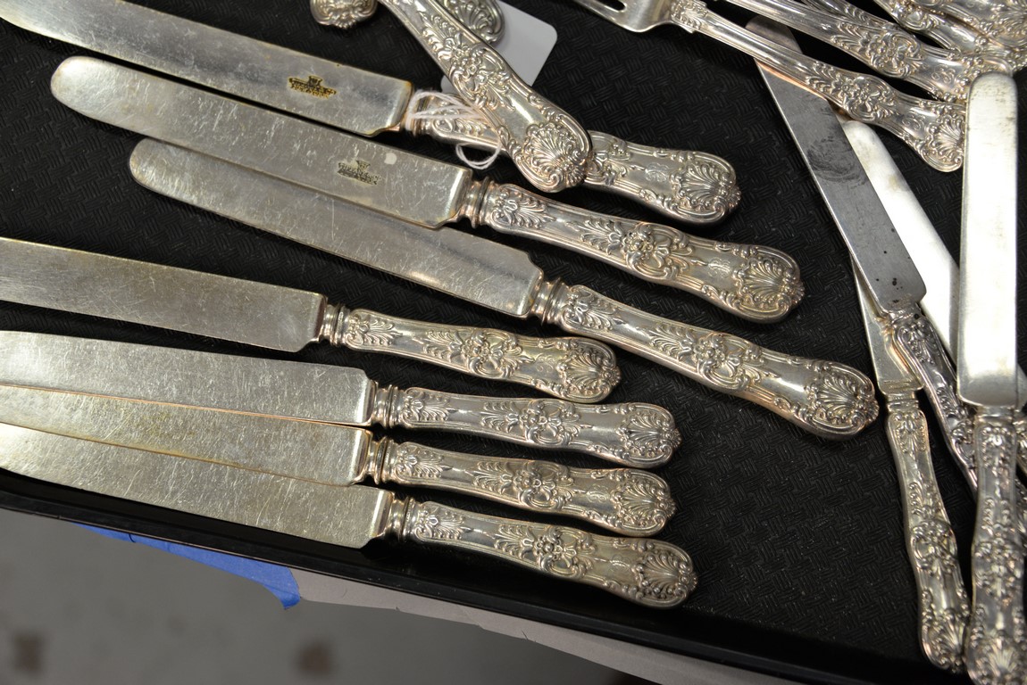 Lot 258: Tiffany & Co. English King pattern 4 tablespoons, 4 teaspoons, 8 forks, 1 serving spoon, 4 dinner knives, 4 luncheon knives, and 4 butter knives. 49.7 t oz. weighable plus 8 handles.