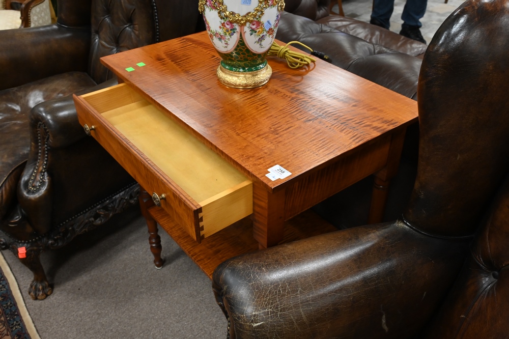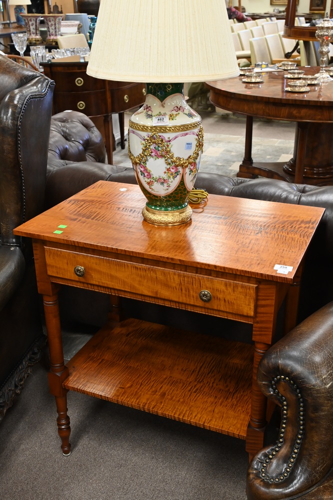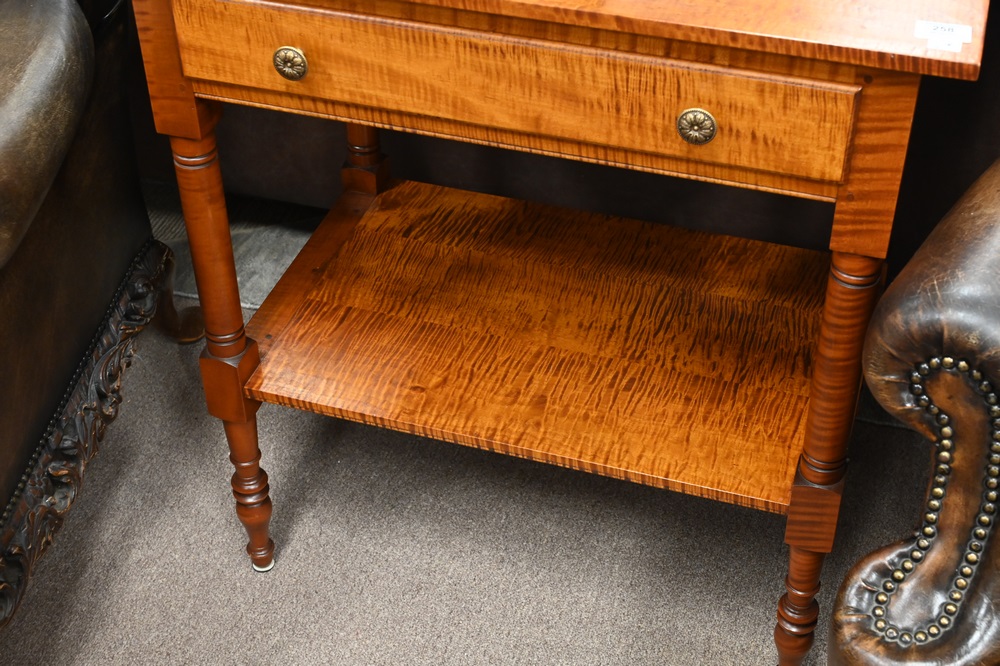 Lot 258: Tiger Maple Sheraton Style Stand, having one drawer, attributed to Leonard’s, height 30 inches, top 18 x 28 inches.
