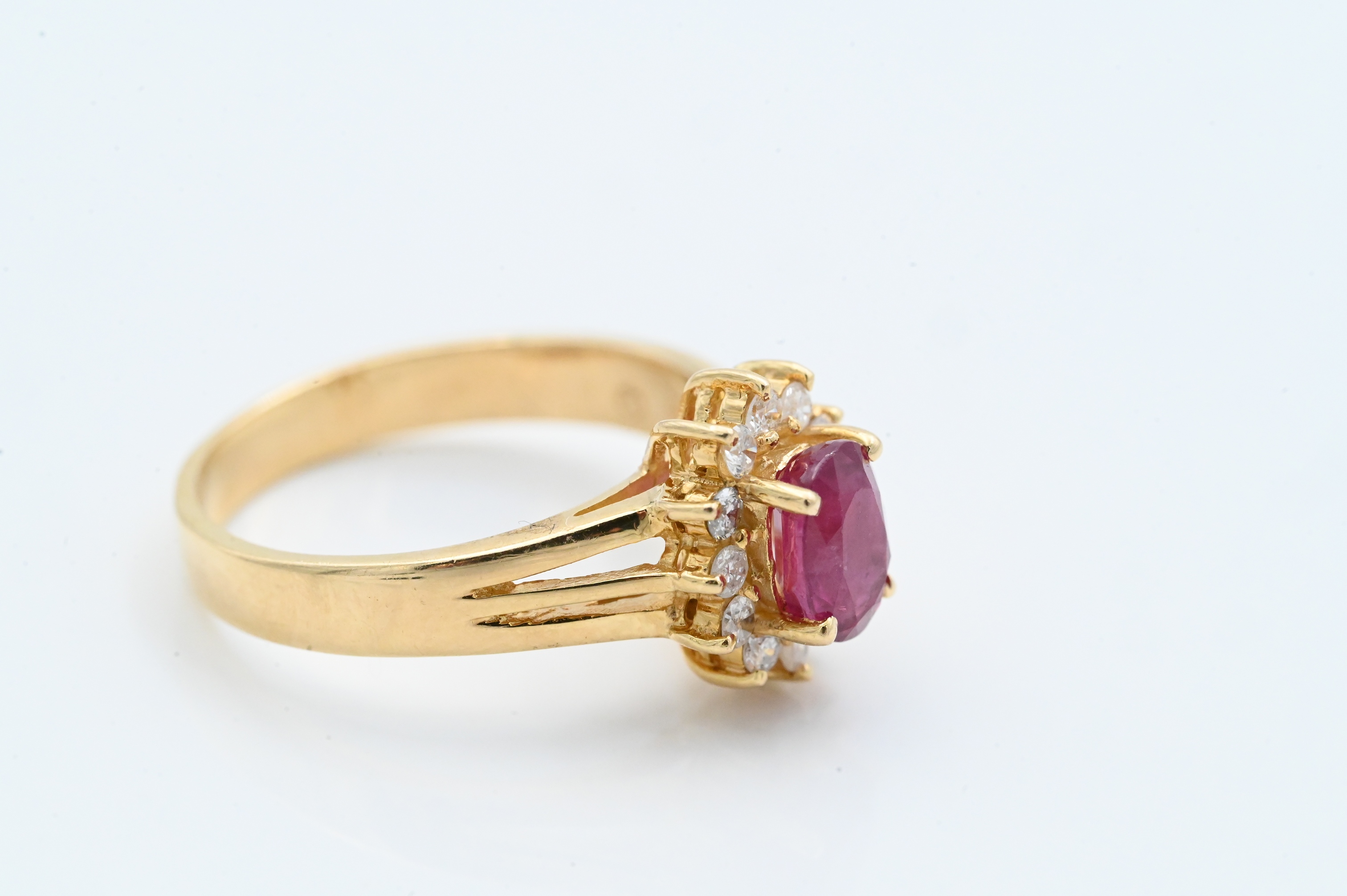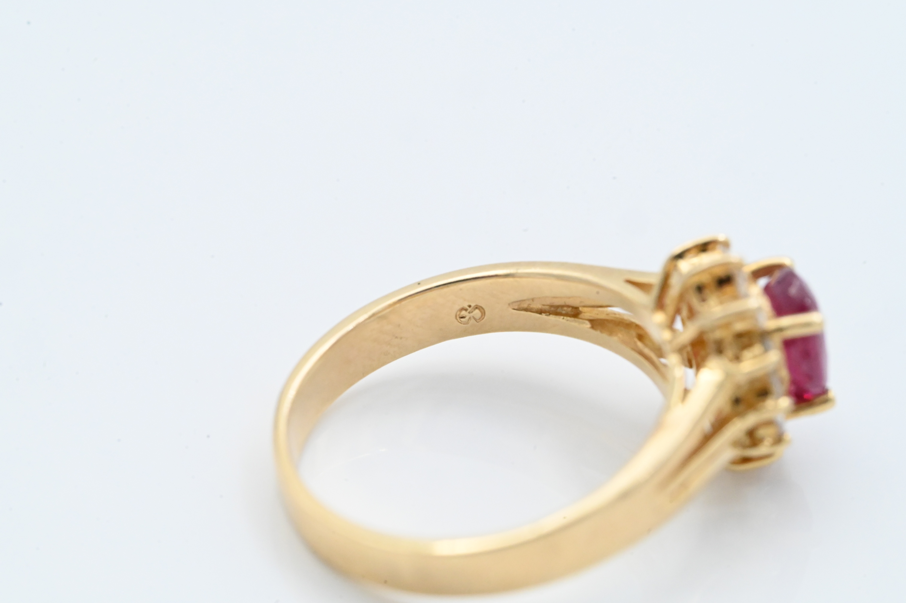 Ring centering an oval-cut red ruby measuring approximately 5 × 6.8 mm, surrounded by twelve round brilliant-cut diamonds in a cluster setting; marked “14K.”