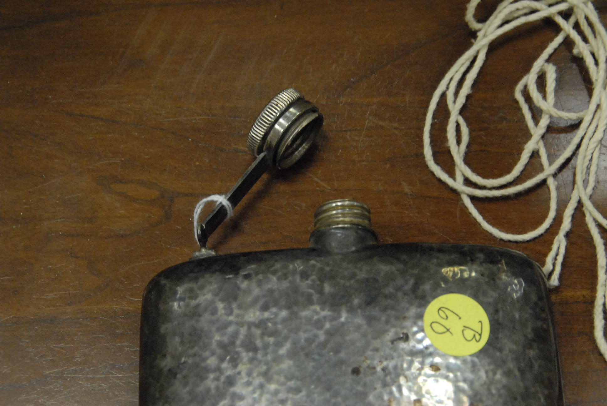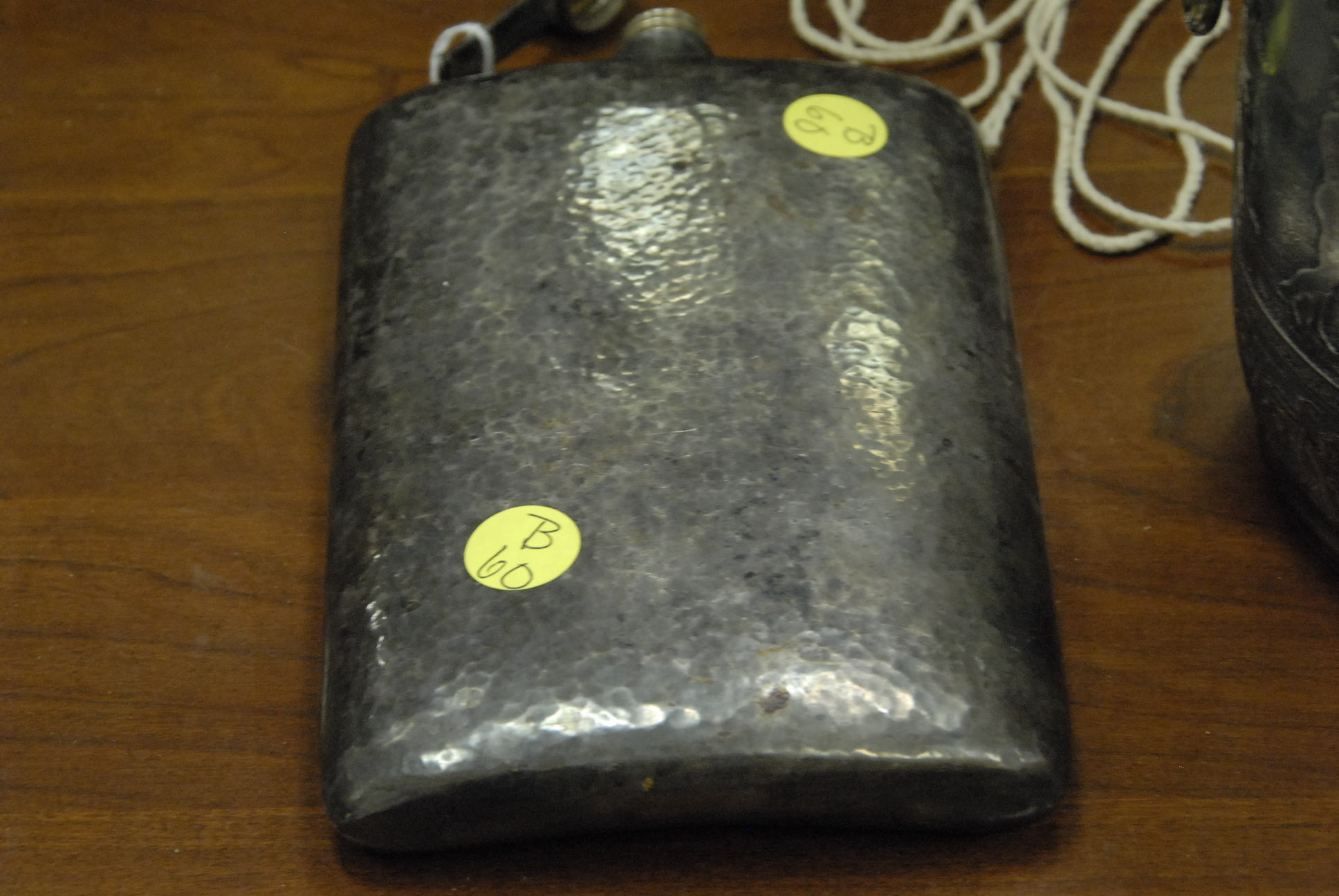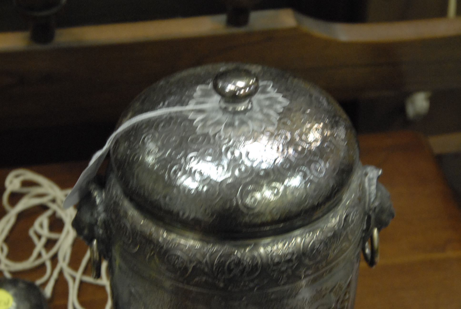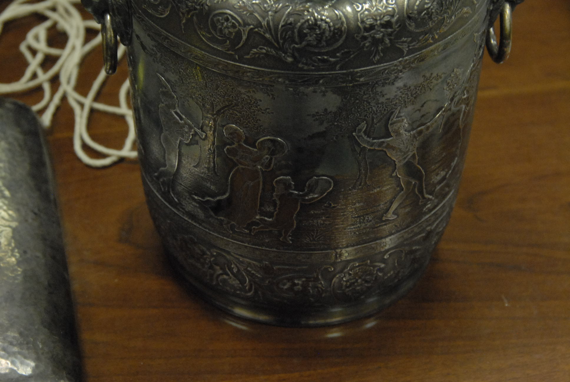 A silver plated large flask with a silver plated ice bucket with lion mask handles