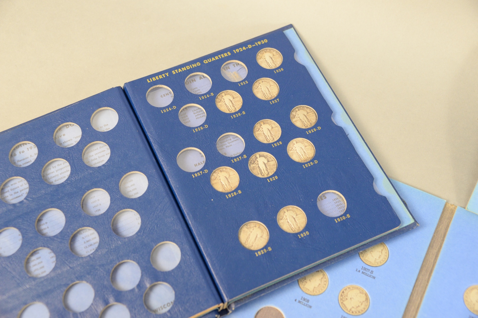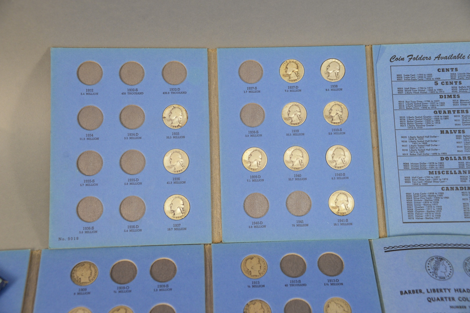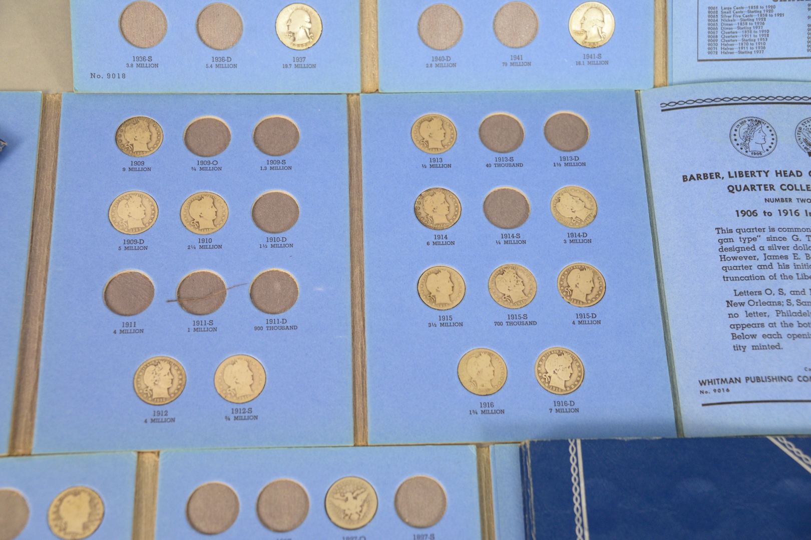 Lot 259: Coin lot to include, 7 partial albums, 20.00 face, Barber quarters standing Liberty quarters, Washington quarters.