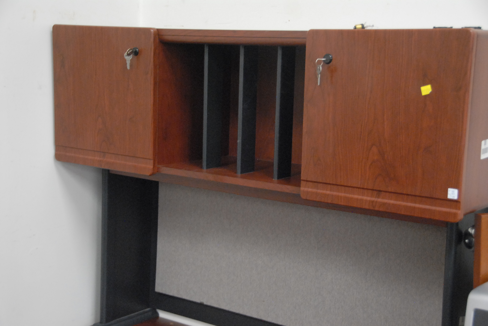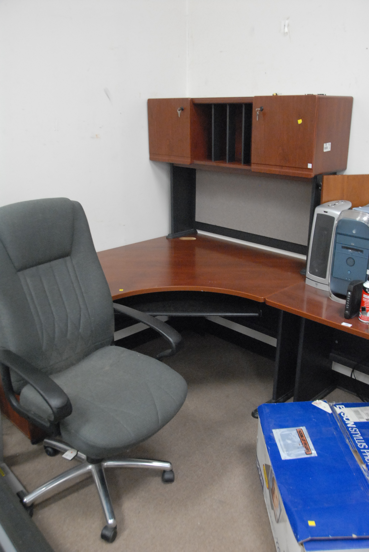 Lot 259: Corner computer desk with hutch top, side printer stand, and swivel office chair.