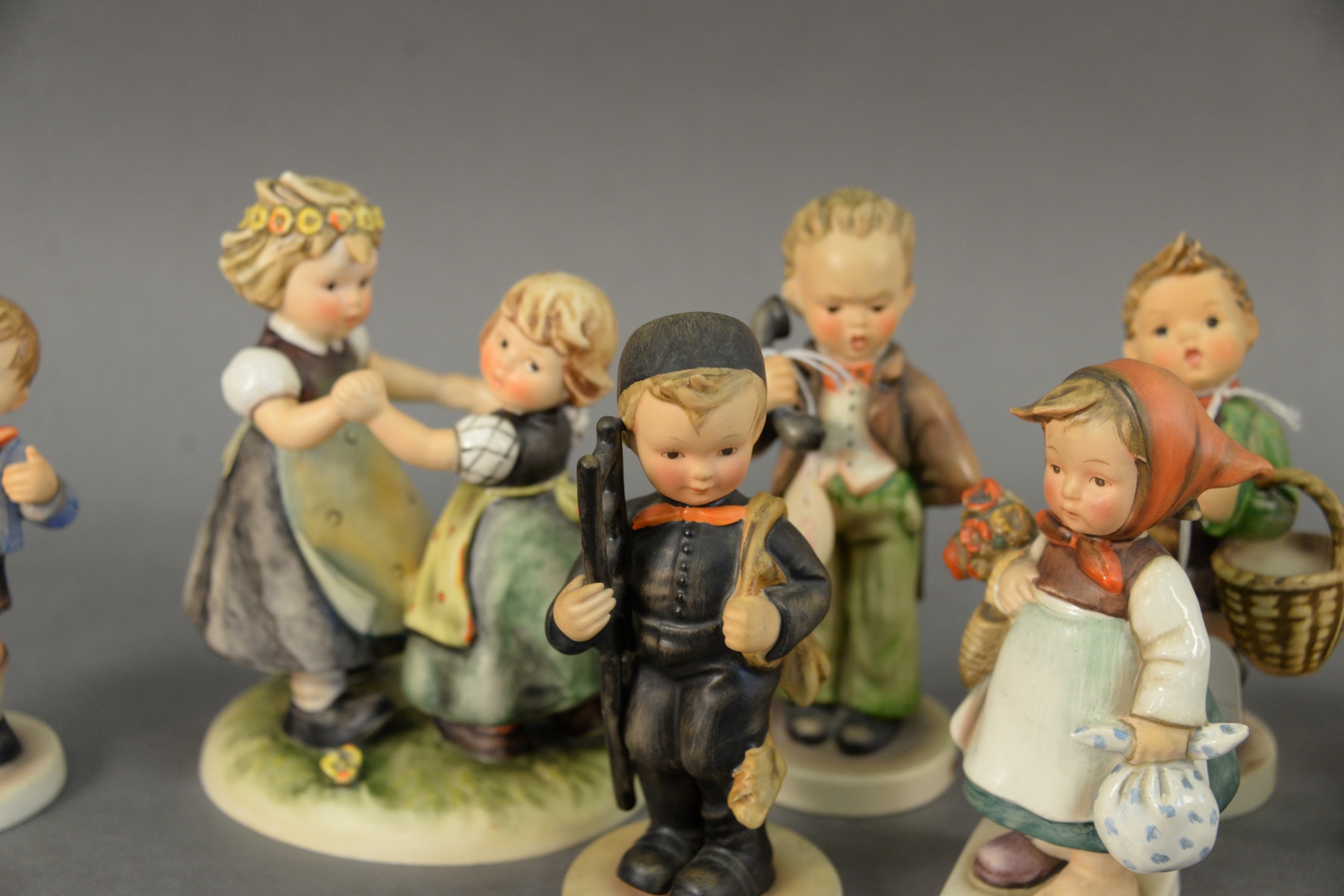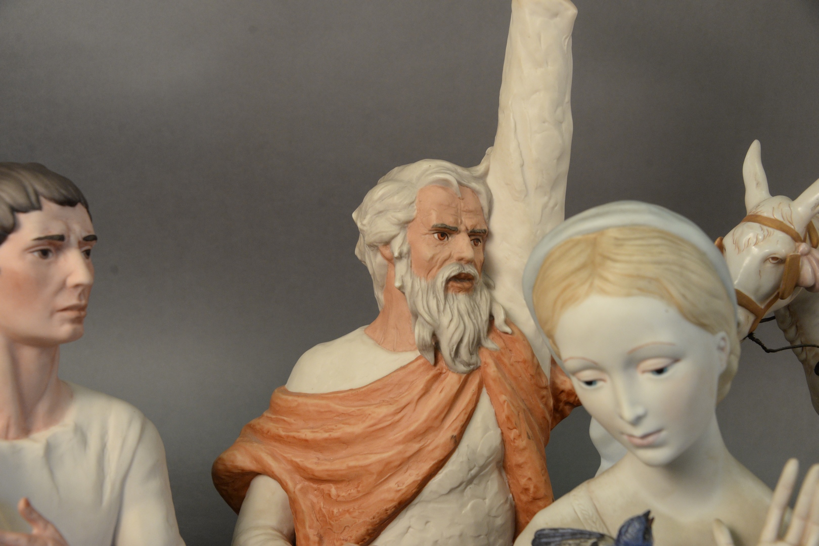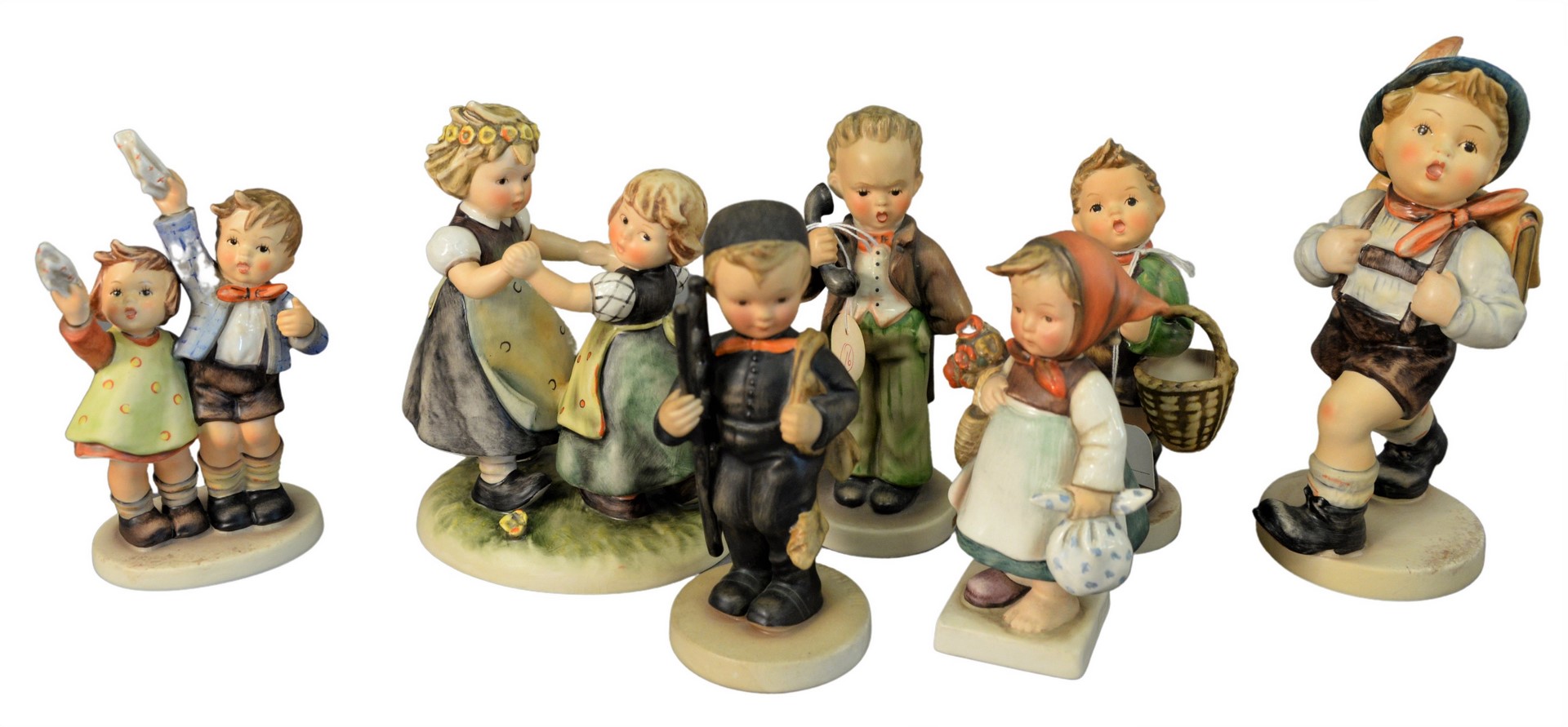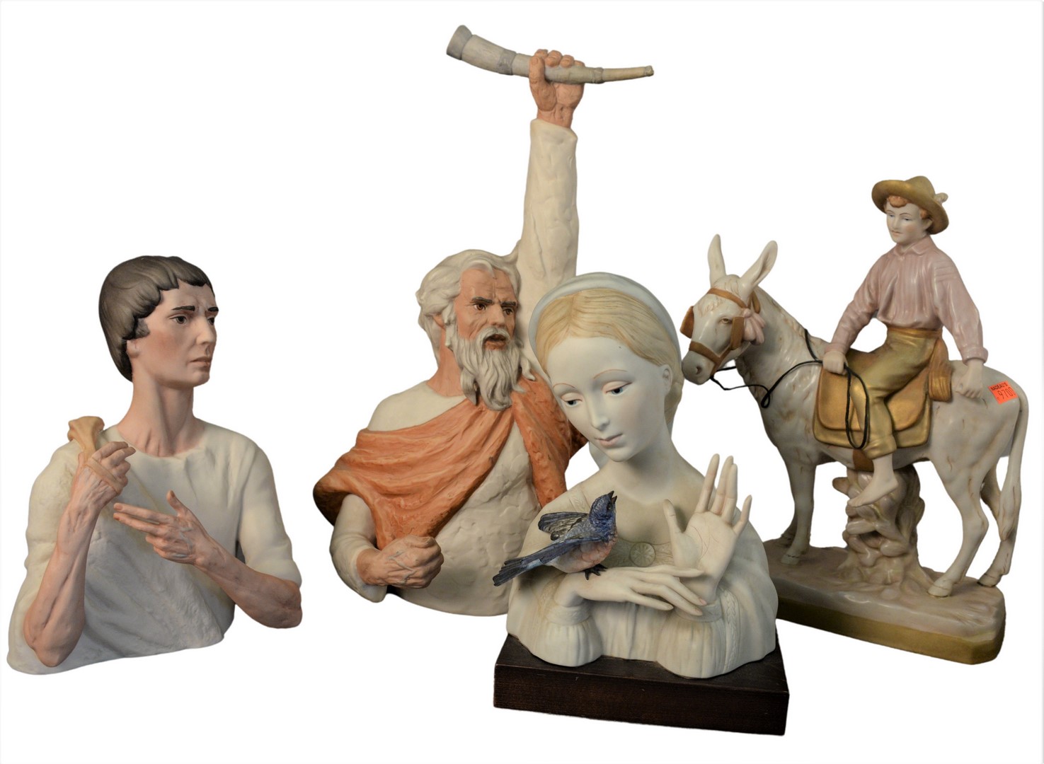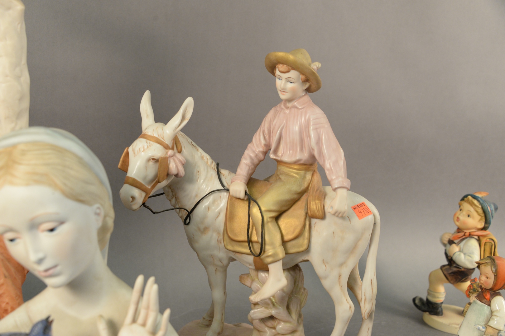 Lot 259: Eleven Piece Lot of Porcelain Figures, to include seven Hummels; a Royal Dux, young boy riding a white horse, height 14 1/2 inches; a Cybis bust of a girl holding a blue bird, each marked, along with two religious figures marked Laslo Ispanky. Provenance: Estate of James Wadhams.
