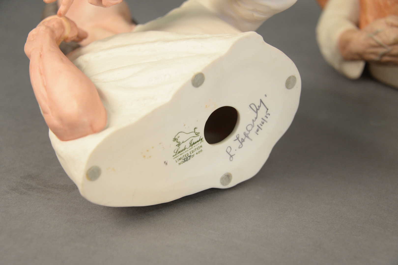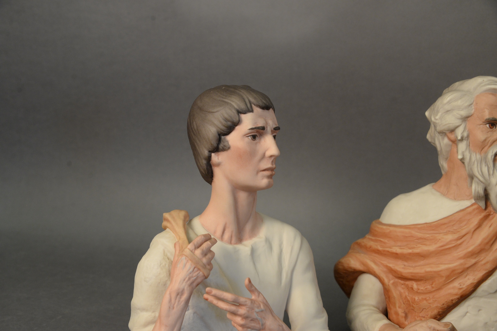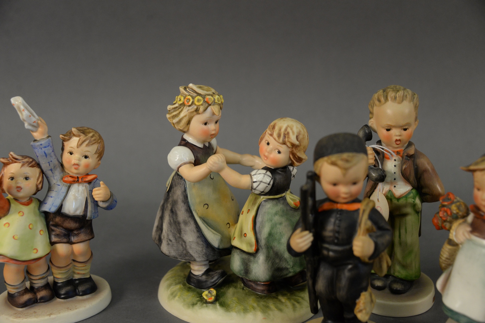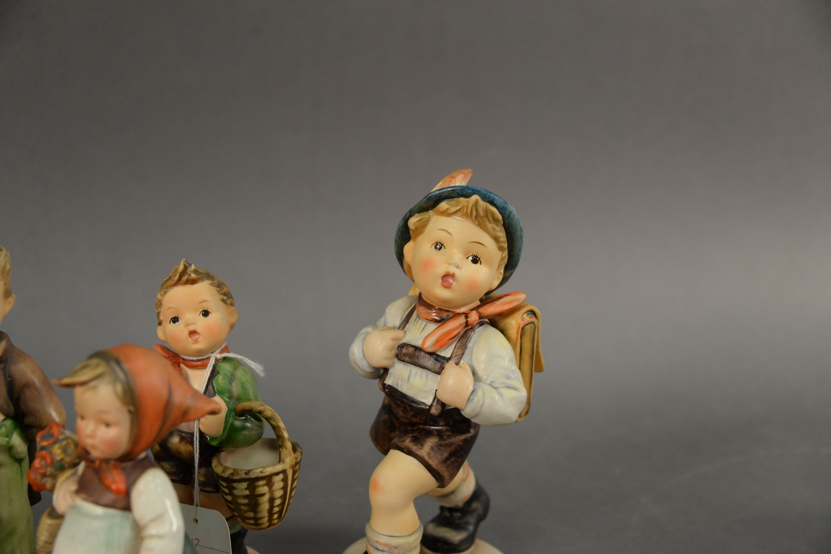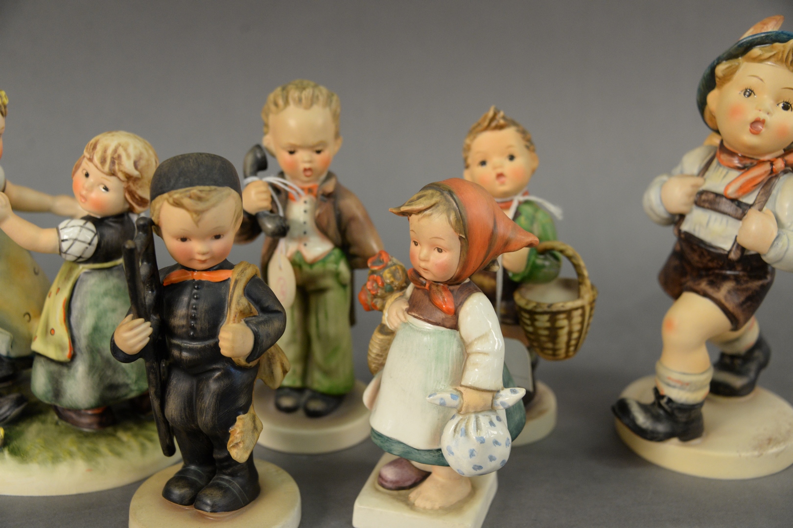Lot 259: Eleven Piece Lot of Porcelain Figures, to include seven Hummels; a Royal Dux, young boy riding a white horse, height 14 1/2 inches; a Cybis bust of a girl holding a blue bird, each marked, along with two religious figures marked Laslo Ispanky. Provenance: Estate of James Wadhams.