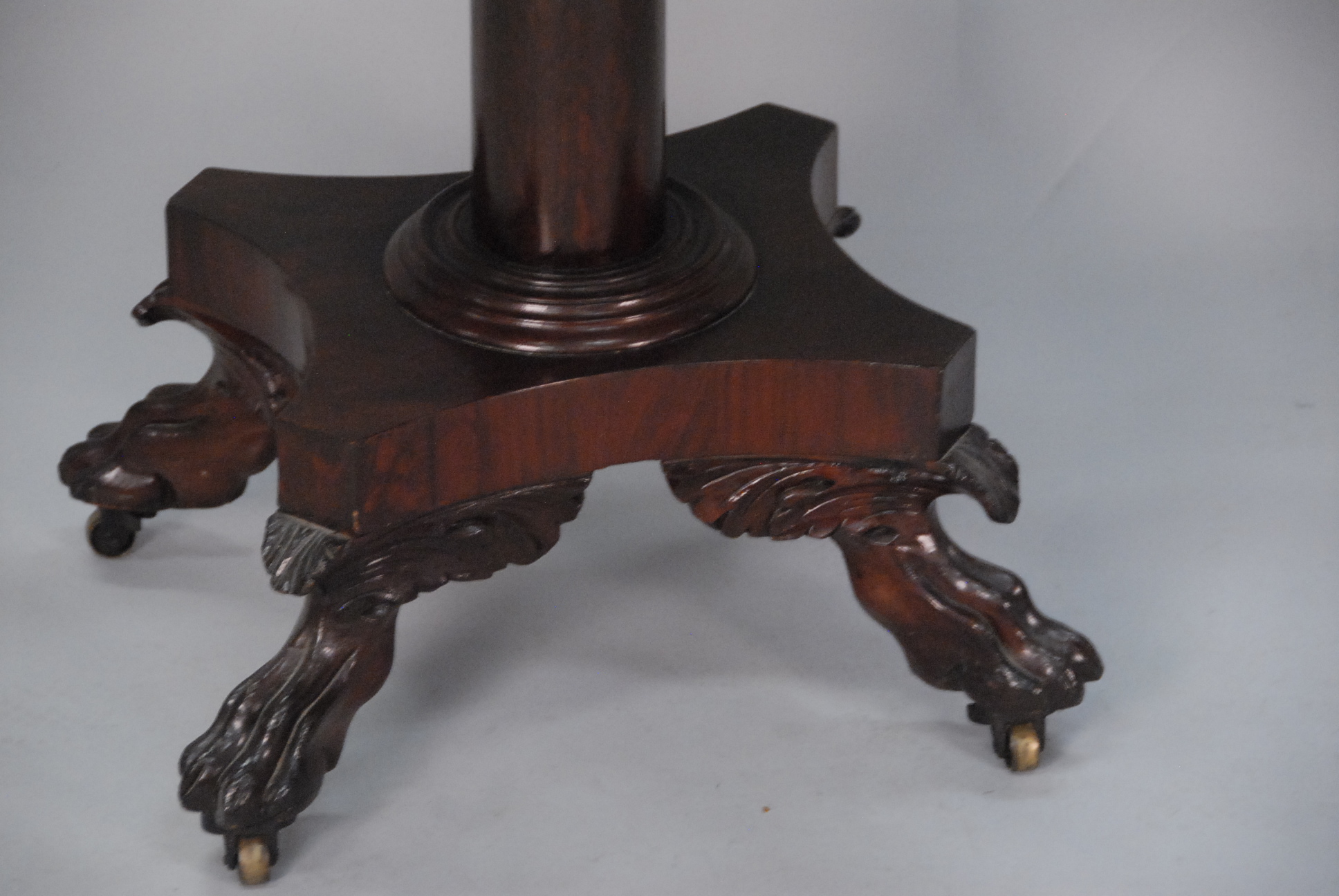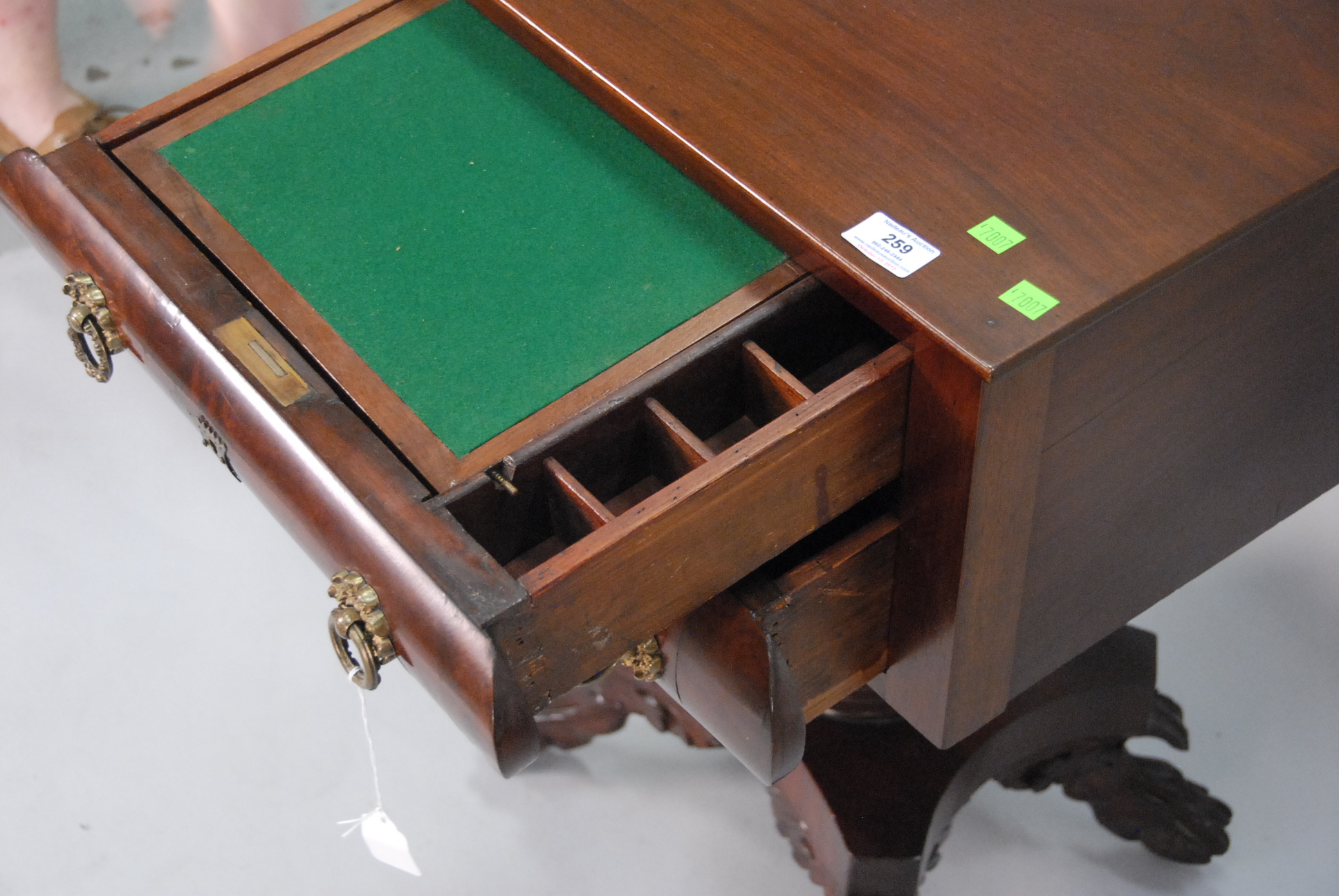Federal mahogany work table with two drawers on turned column on base ending with four paw feet, top drawer with writing surface of felt, circa 1840. ht. 29 1/2in. wd. 18 1/2in.