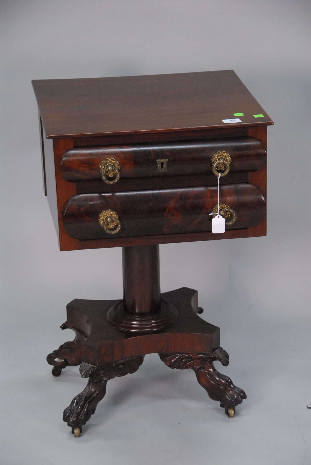 Lot 259: Federal mahogany work table with two drawers on turned column on base ending with four paw feet, top drawer with writing surface of felt, circa 1840. ht. 29 1/2in. wd. 18 1/2in.