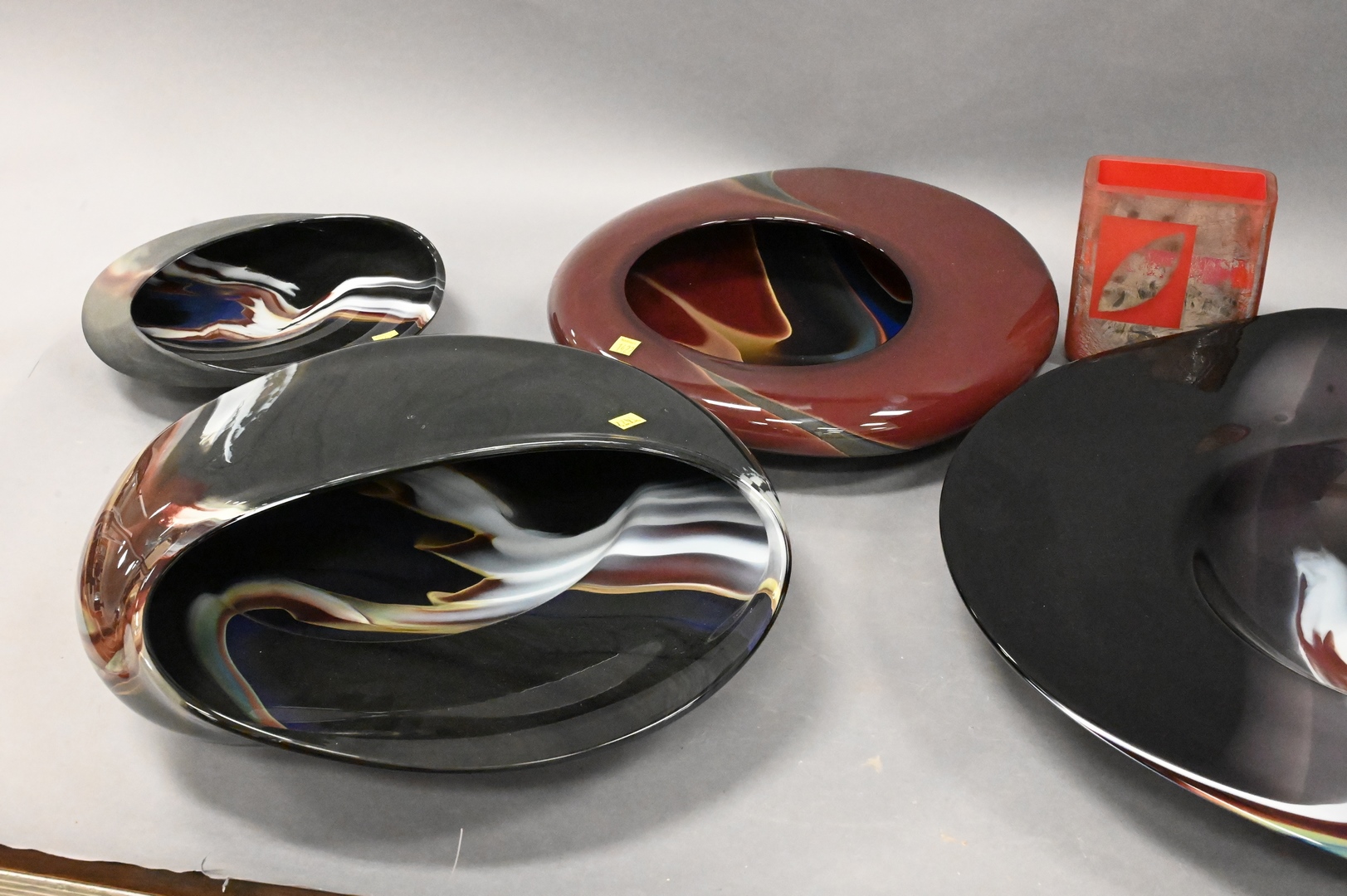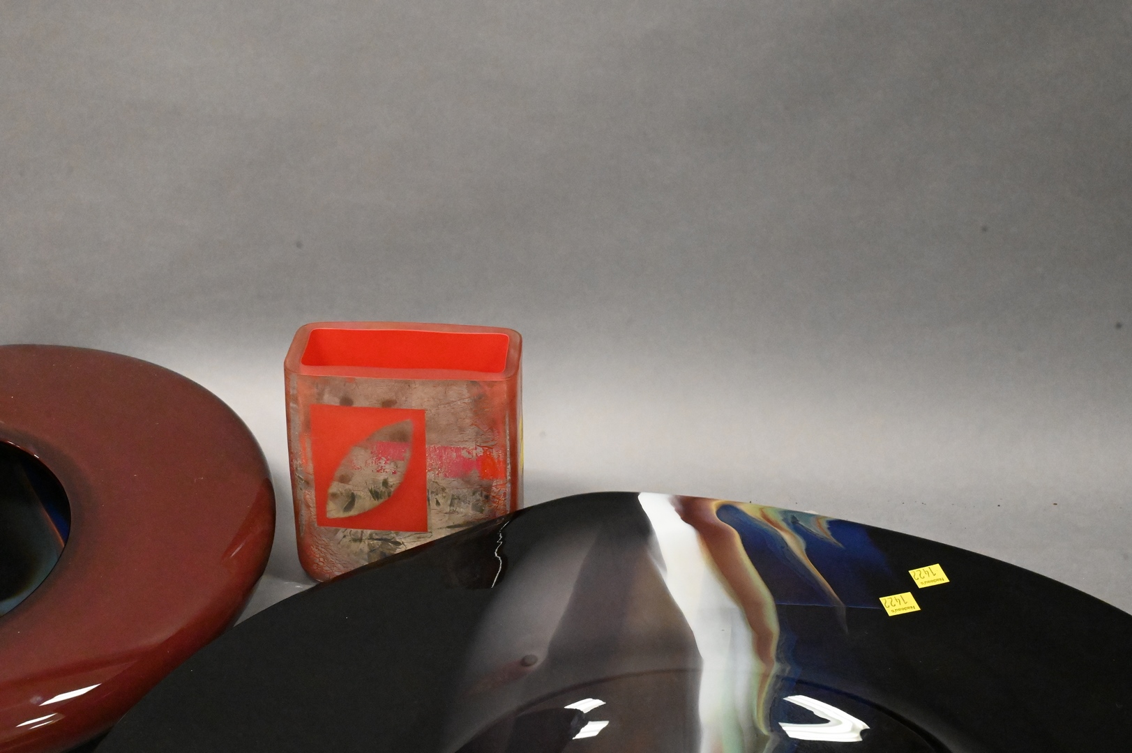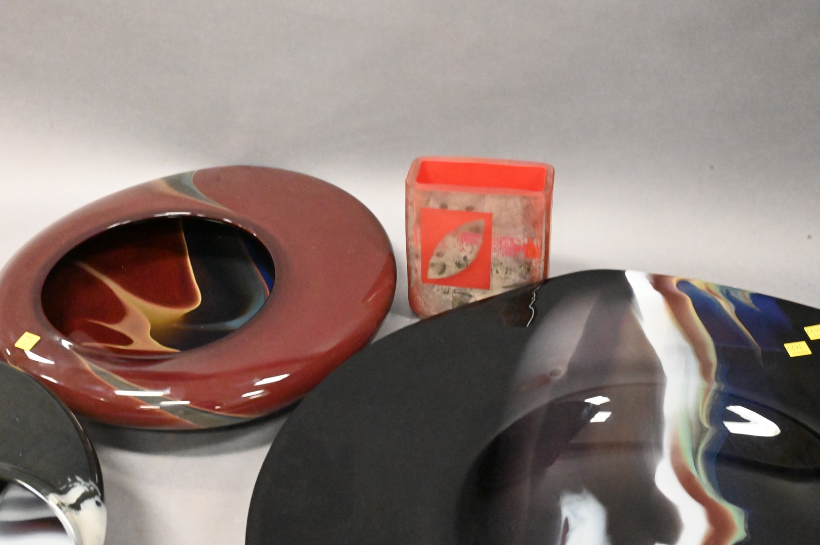 Five Art Glass Pieces, to include Adam Aaronson modern art glass vase, a large art glass charger, two large Ira Sapir art glass bowls, along with one bowl signed illegibly; largest 18″ x 20″.