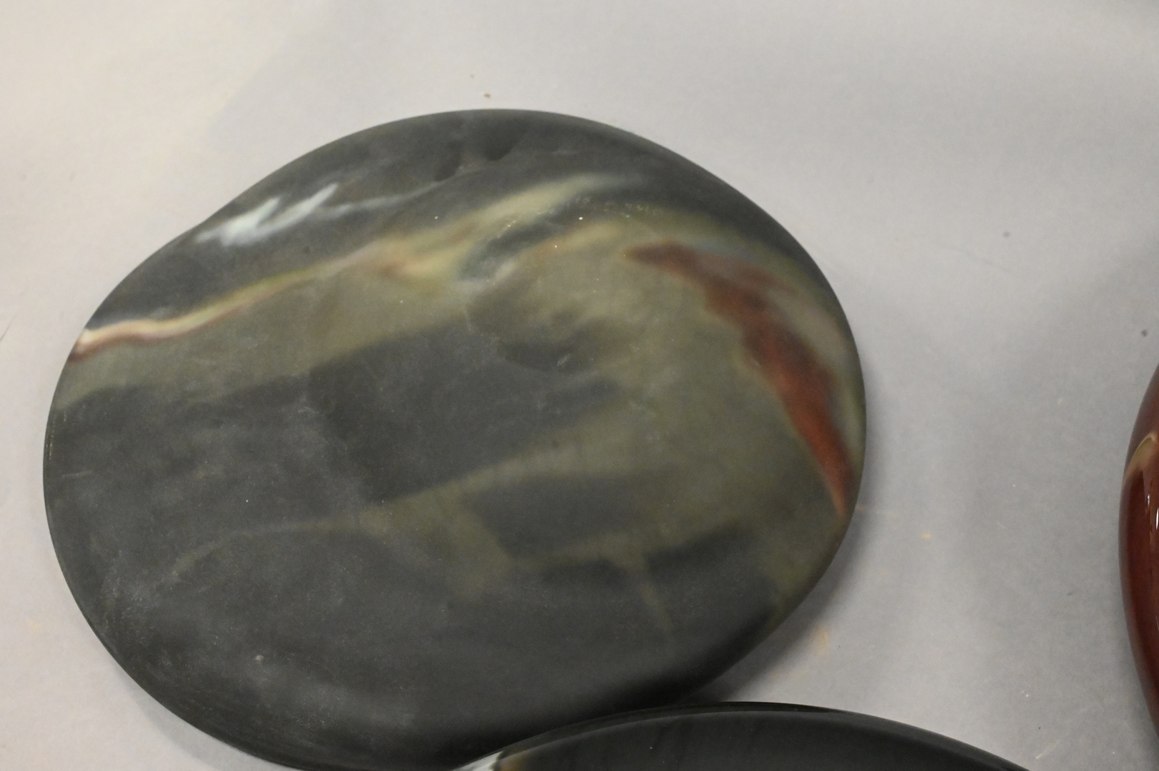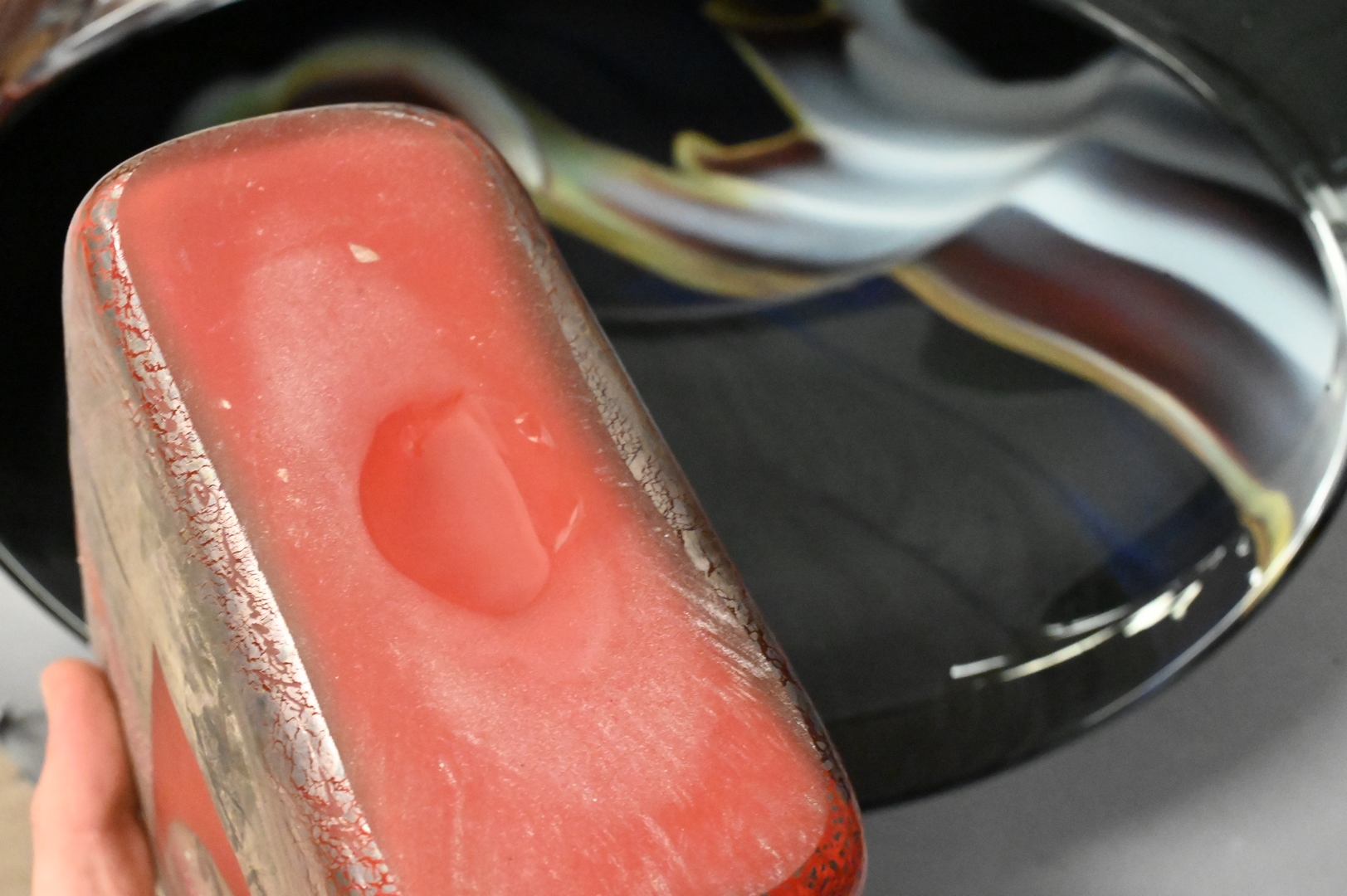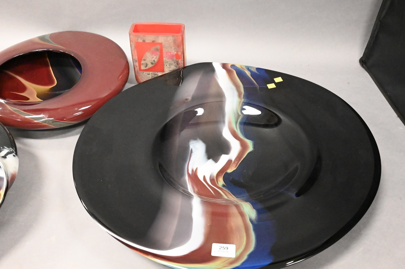 Five Art Glass Pieces, to include Adam Aaronson modern art glass vase, a large art glass charger, two large Ira Sapir art glass bowls, along with one bowl signed illegibly; largest 18″ x 20″.