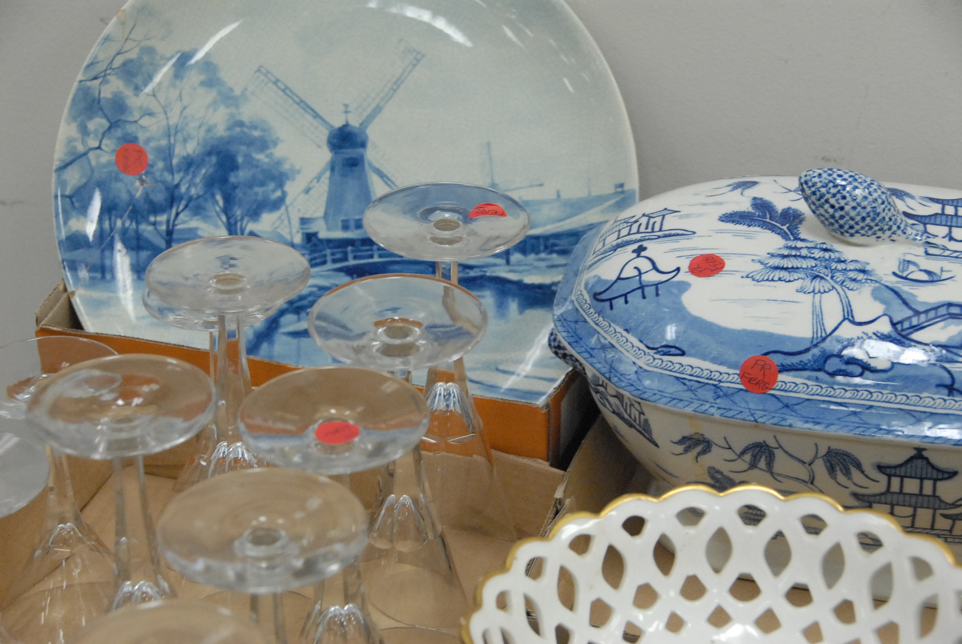 Five box lots to include a blue and white tureen, blue and white charger, an early English cup, young artist, box of crystal stems, porcelain compote, three small enameled boxes, linens, large vase, a wall pocket, and a painted paper mache box.