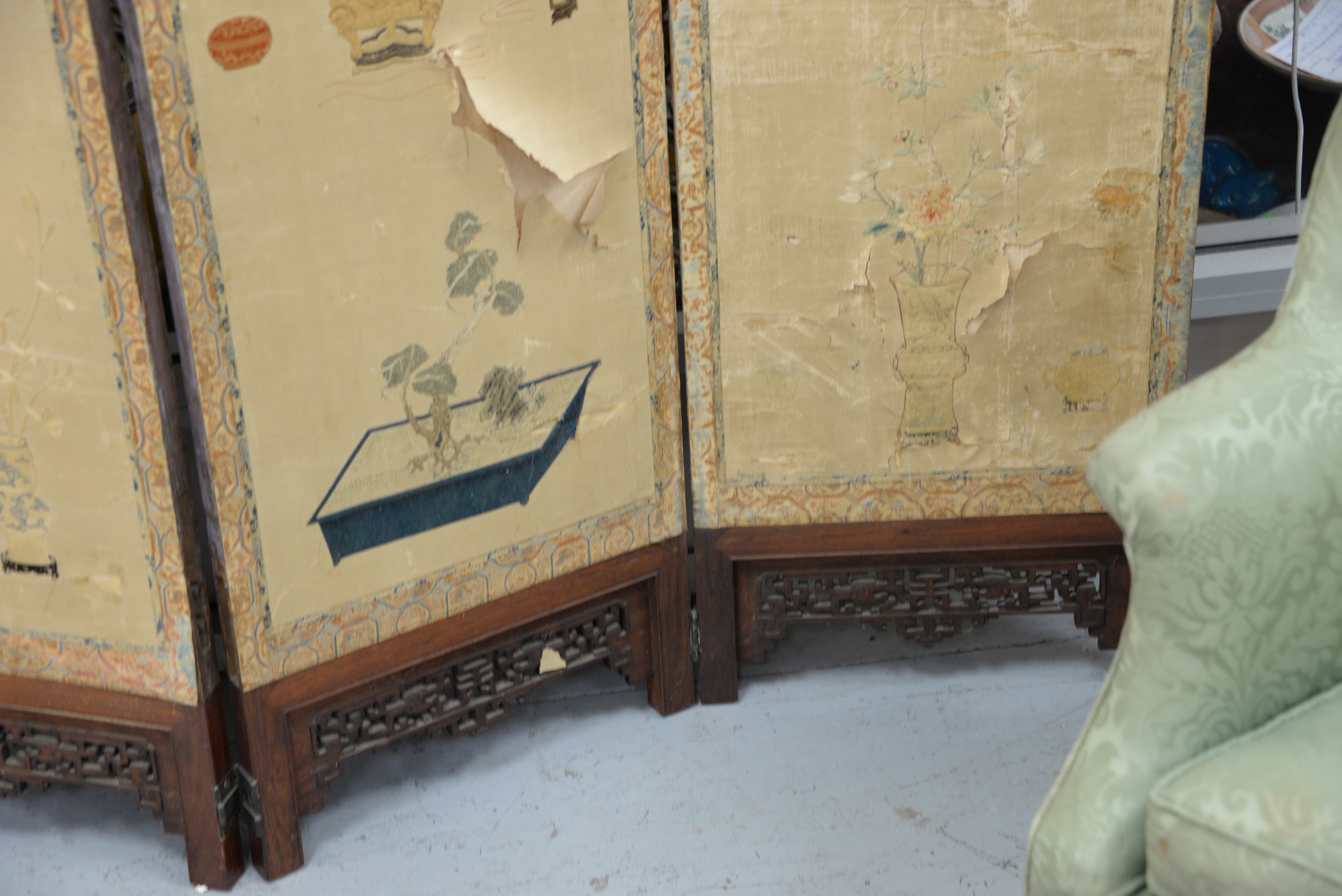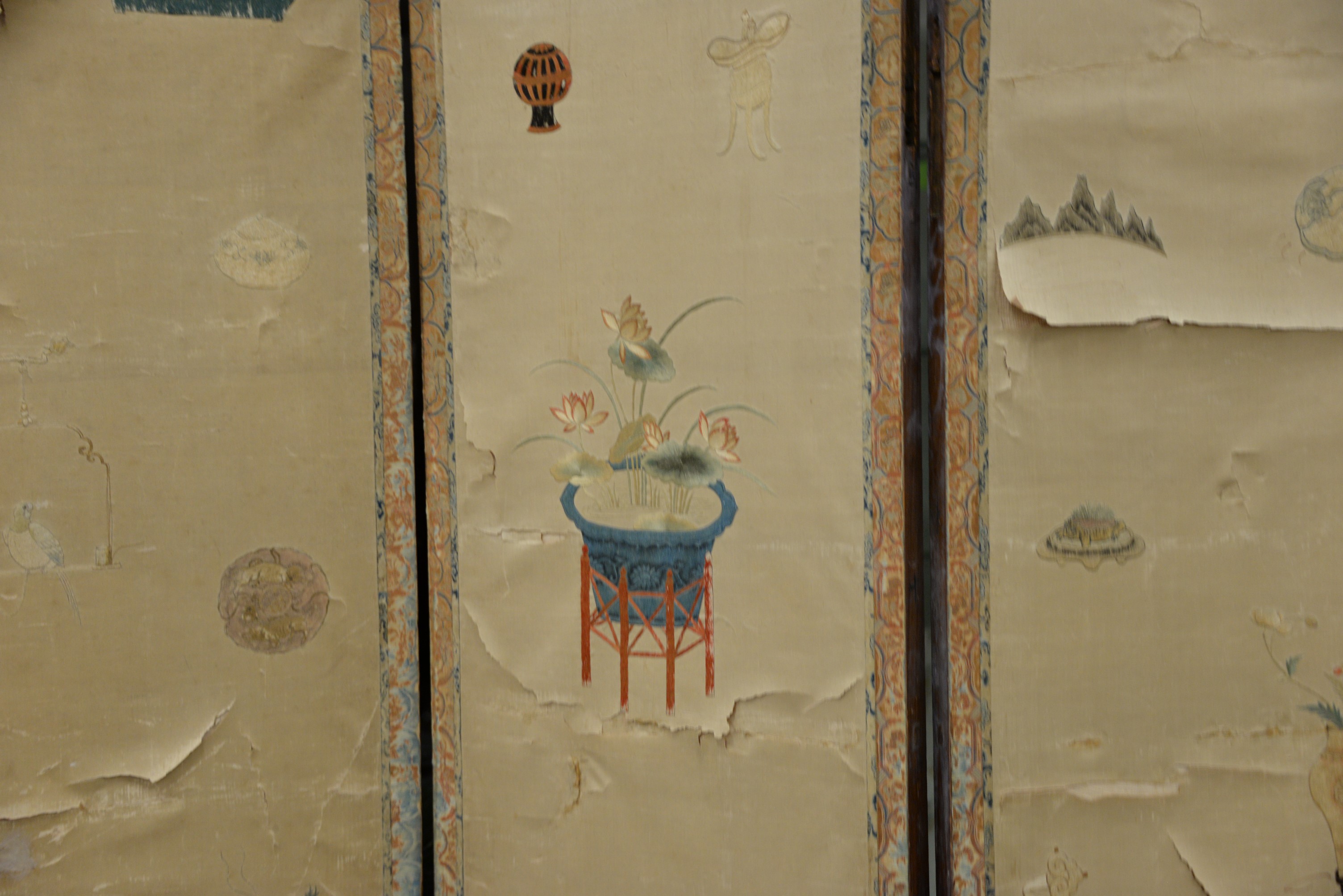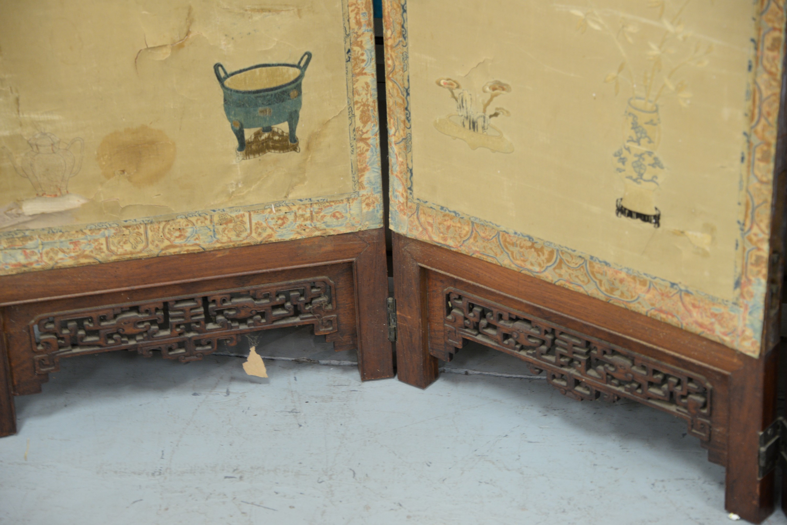 Lot 259: Four fold silk and hardwood folding screen, Qing Dynasty, silk ground embroidered with scenes depicting immortals and other figures…
