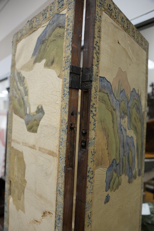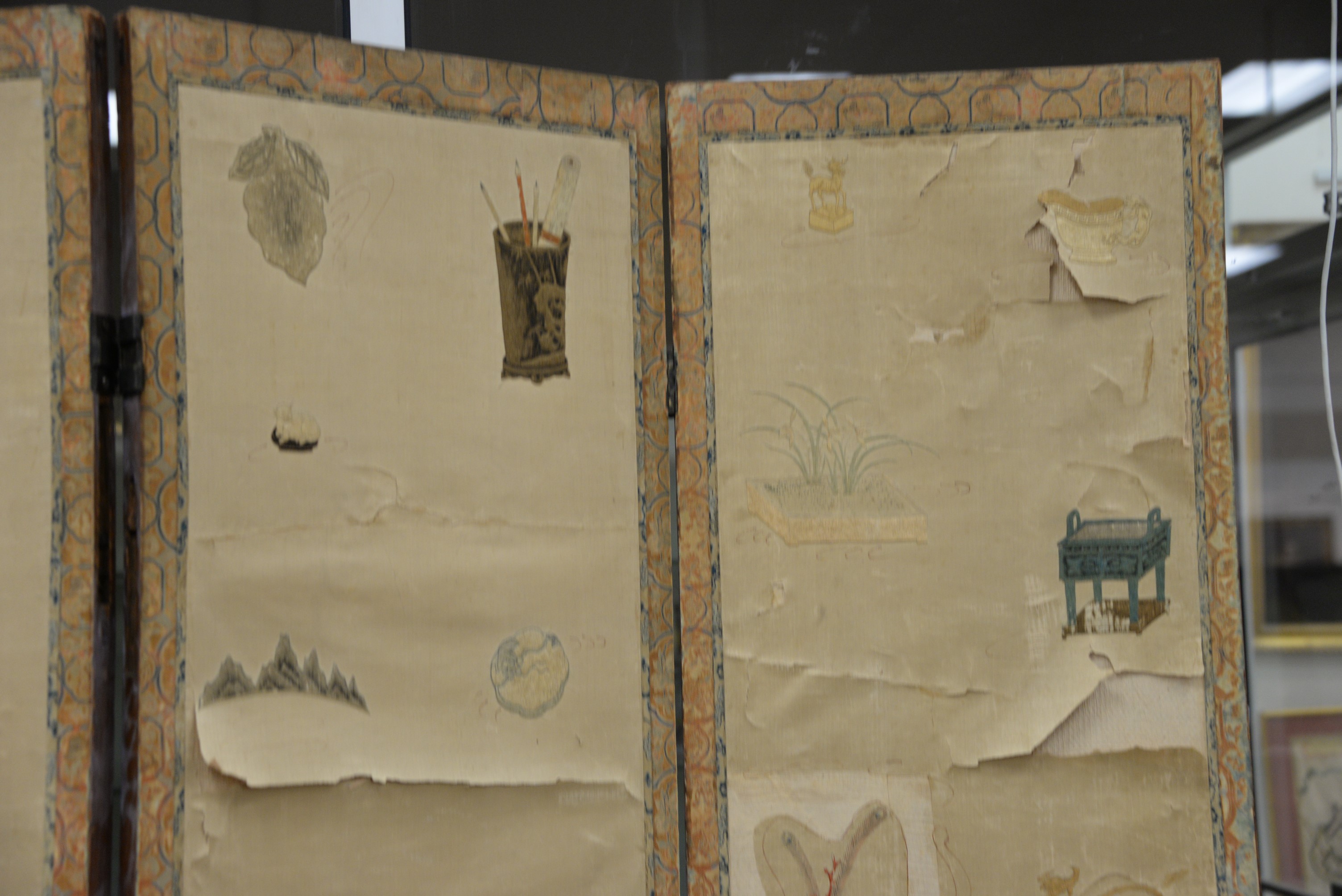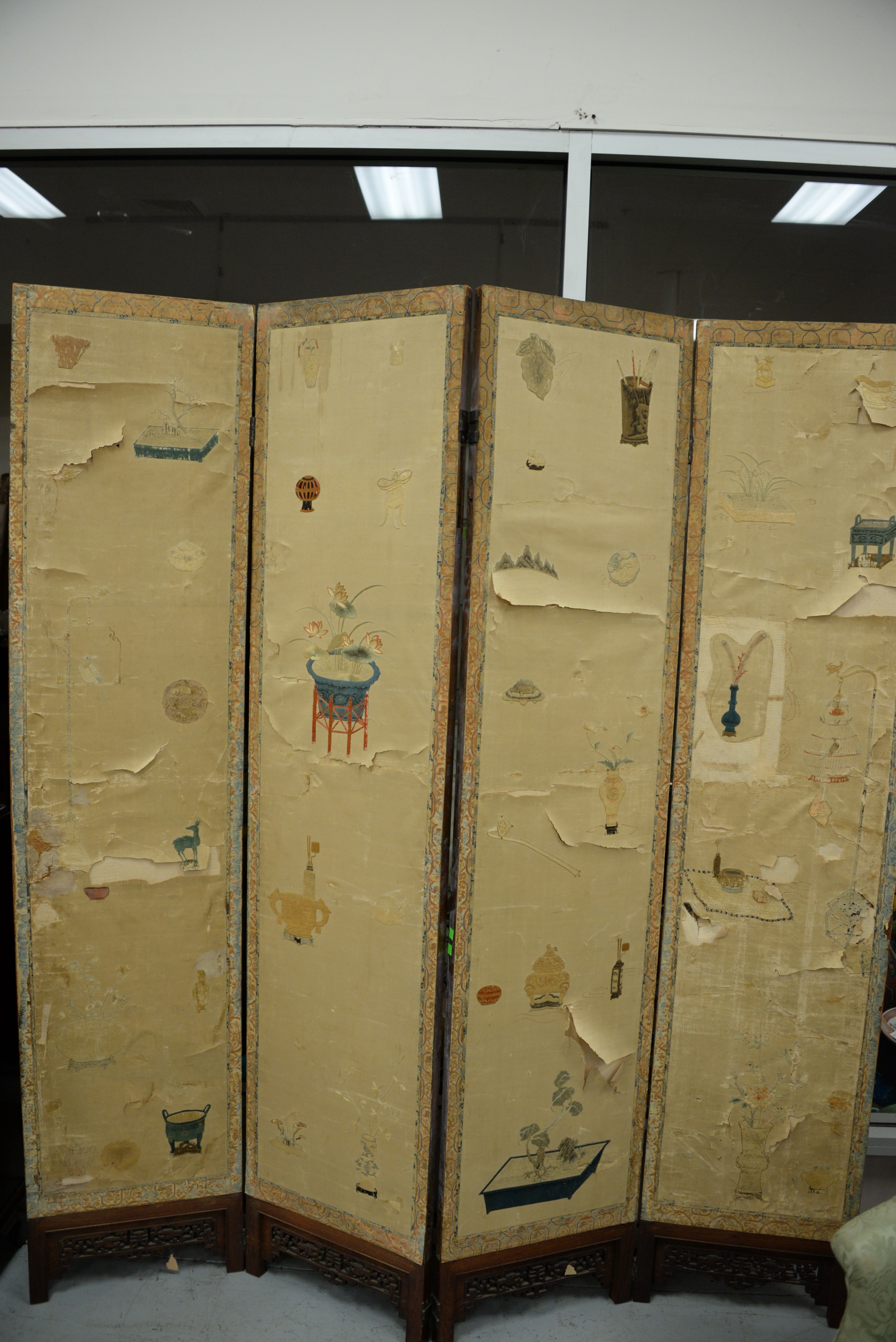 Lot 259: Four fold silk and hardwood folding screen, Qing Dynasty, silk ground embroidered with scenes depicting immortals and other figures…
