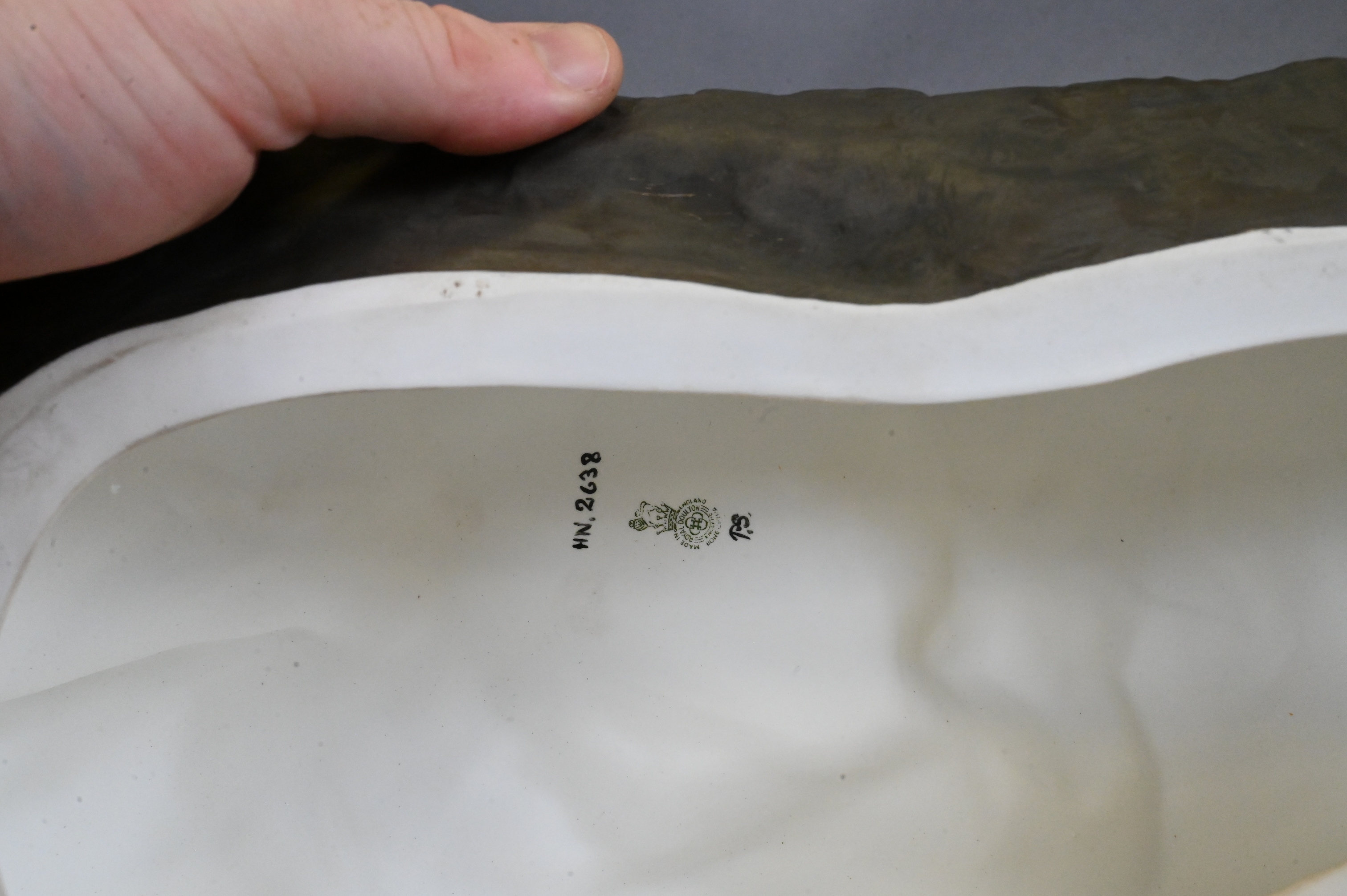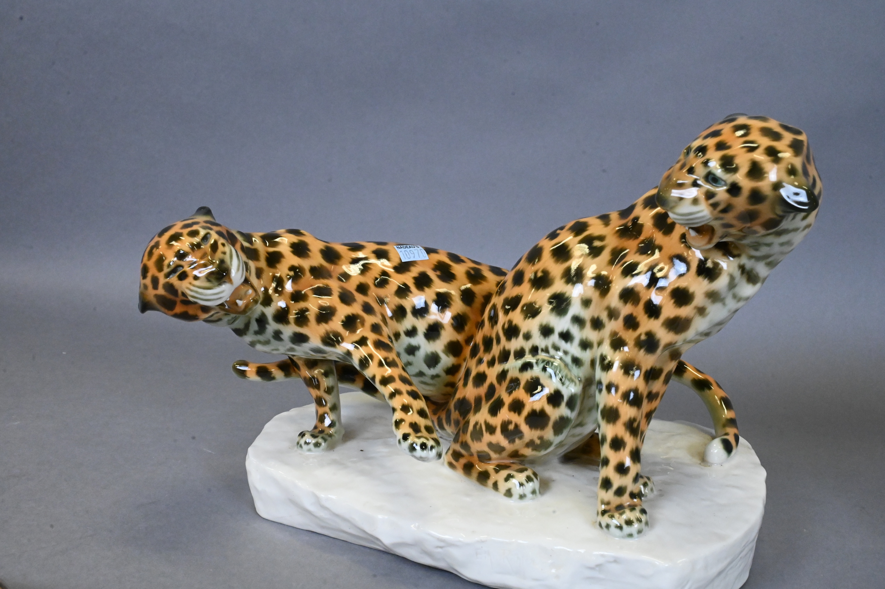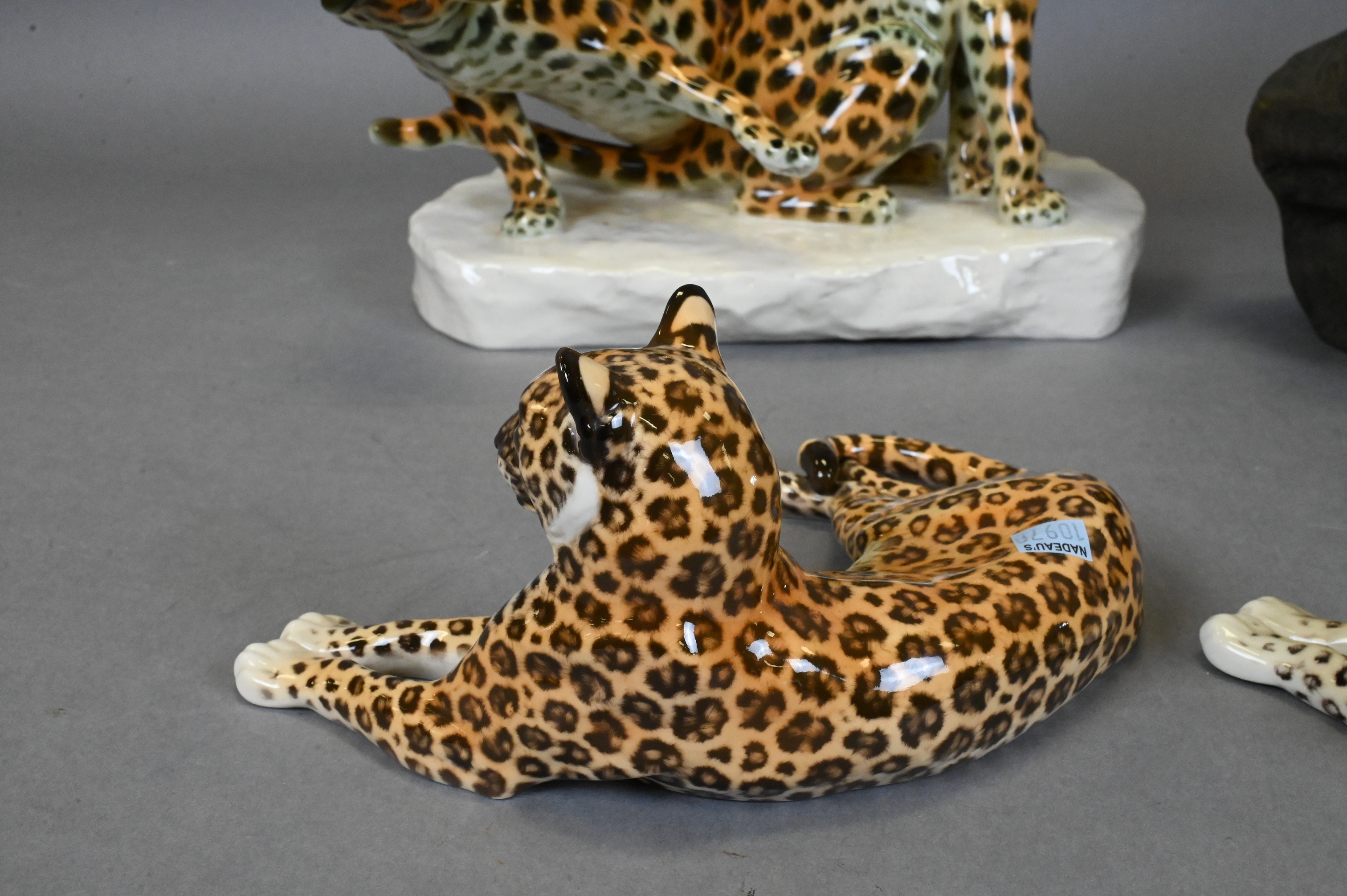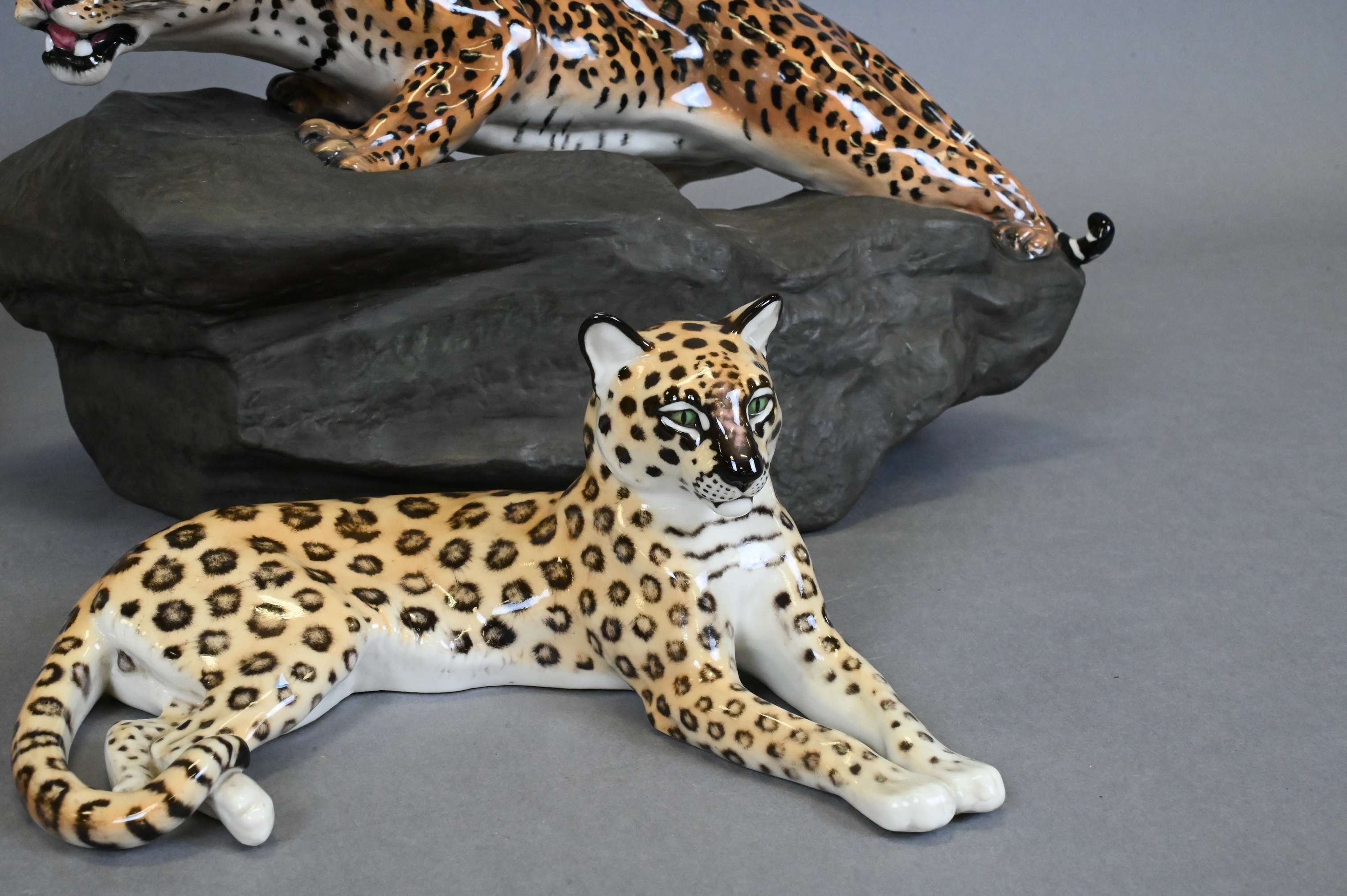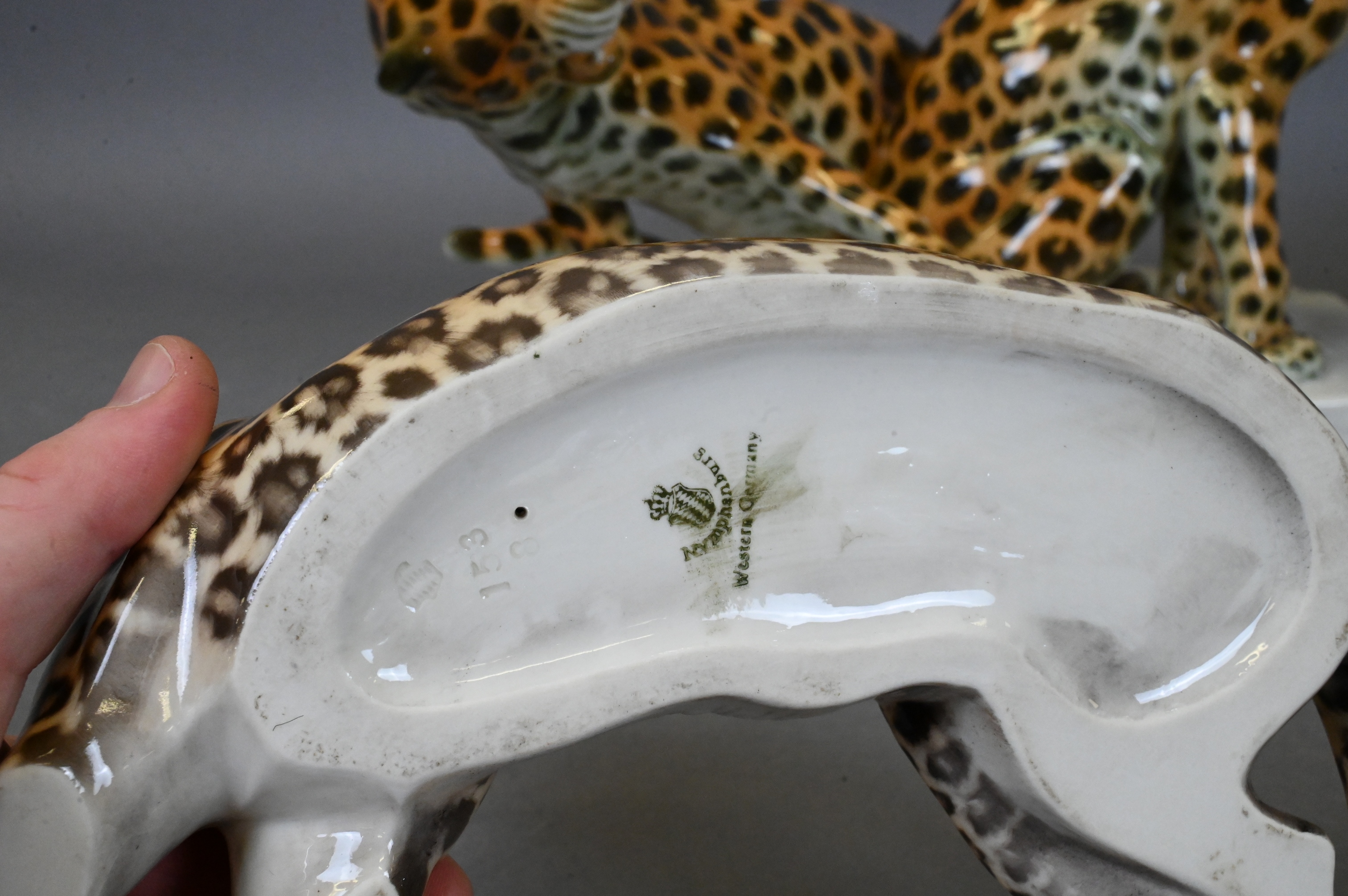 to include two Nymphenburg Porcelain Leopards, one marked Western Germany, length 11 inches, large Schwarzburger Werkstatten Germany sitting leopards figural group height 11 inches, length 15 inches, along with Charles Noke for Royal Doulton leopard on rock figure HN 2638, height 9 inches, length 16 inches