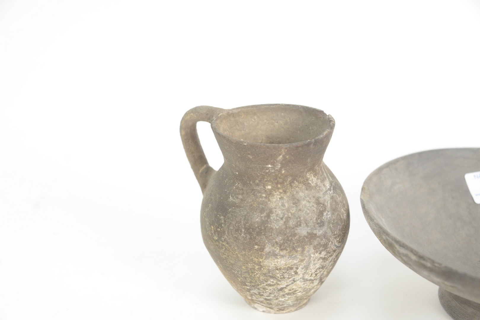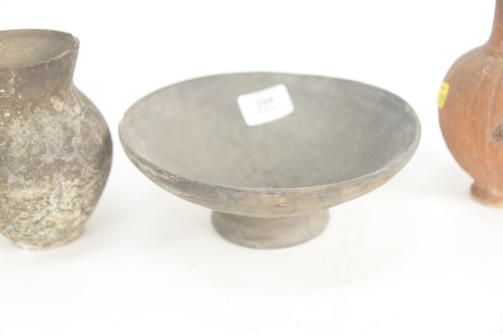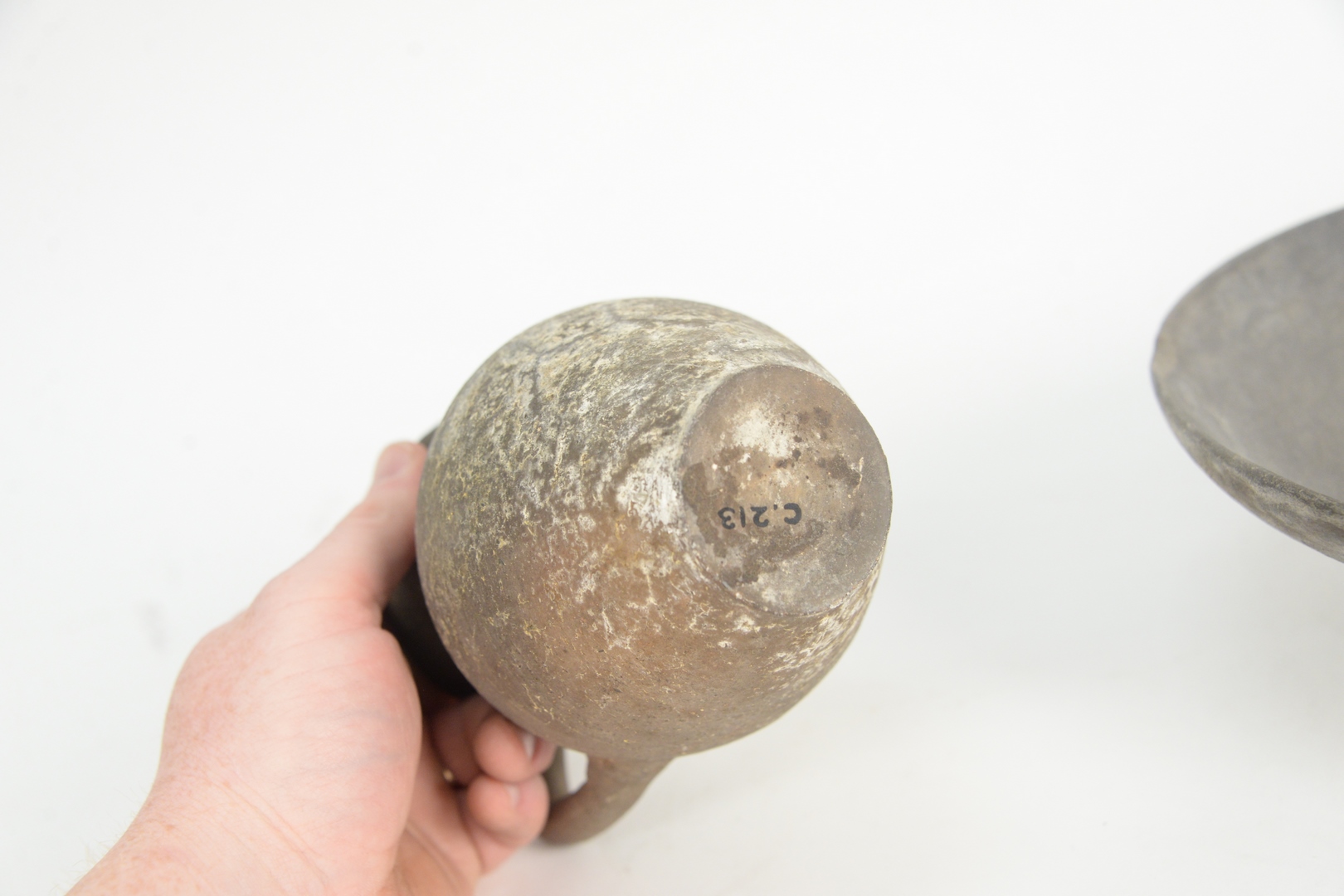 Group of Three Ancient Pottery Pieces, to include terracotta vessel with ribbed sides and handle, grey stone, height 6 3/4 inches along with footed bowl and a vessel with museum numbers on bottom, height 5 1/2 inches. Provenance: Part of Ariadne Galleries, New York collection, receipt from May 31, 1991.