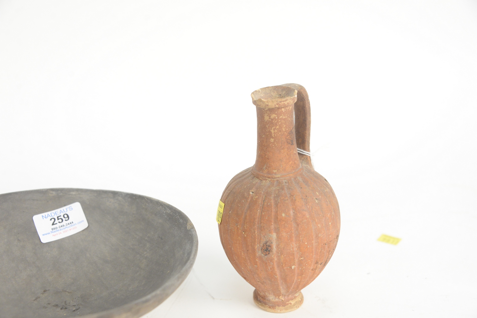 Lot 259: Group of Three Ancient Pottery Pieces, to include terracotta vessel with ribbed sides and handle, grey stone, height 6 3/4 inches along with footed bowl and a vessel with museum numbers on bottom, height 5 1/2 inches. Provenance: Part of Ariadne Gal