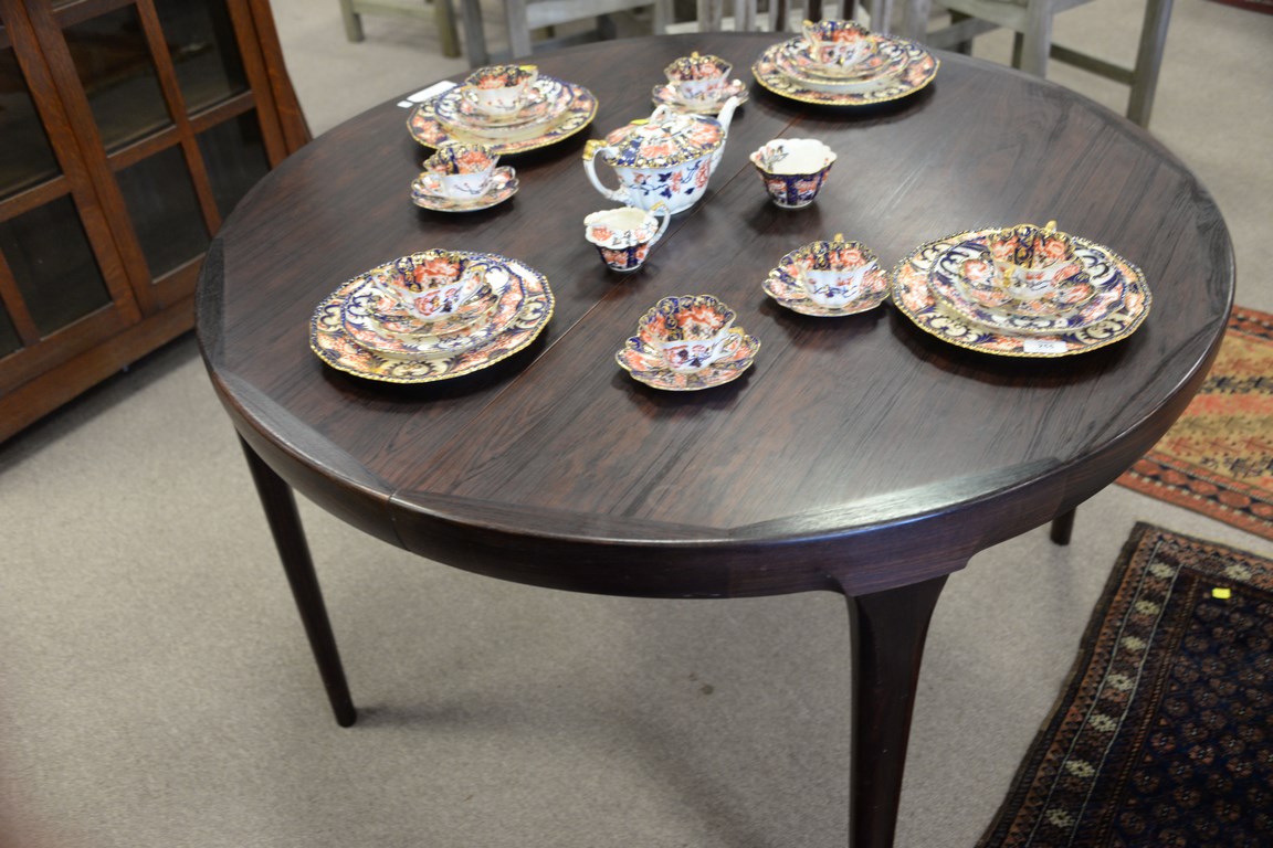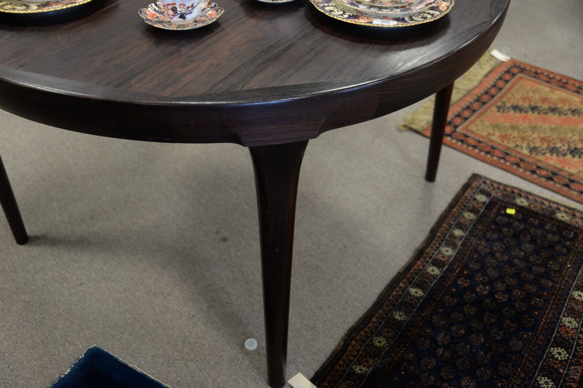 Lot 259: IB Kofod-Larsen rosewood table manufactured by Faarup Mobelfabrik with two 19 inch leaves, ht. 28 1/2 in. dia. 47 opens to 47 x 85