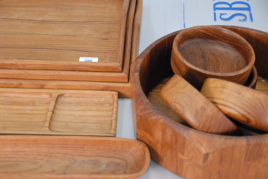 Lot 259: Large Mid-Century Danish wooden lot to include set of three teak trays and plexiglass tray, bowls, etc.