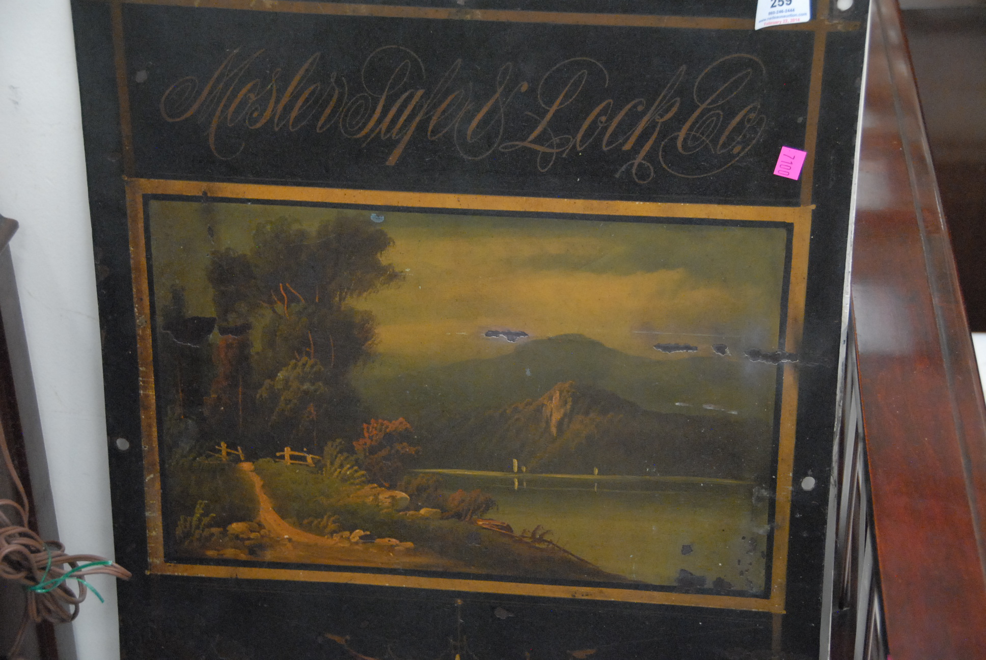 Painted iron sign Mosler Safe and Lock Co. with landscape panel, 43 x 21.