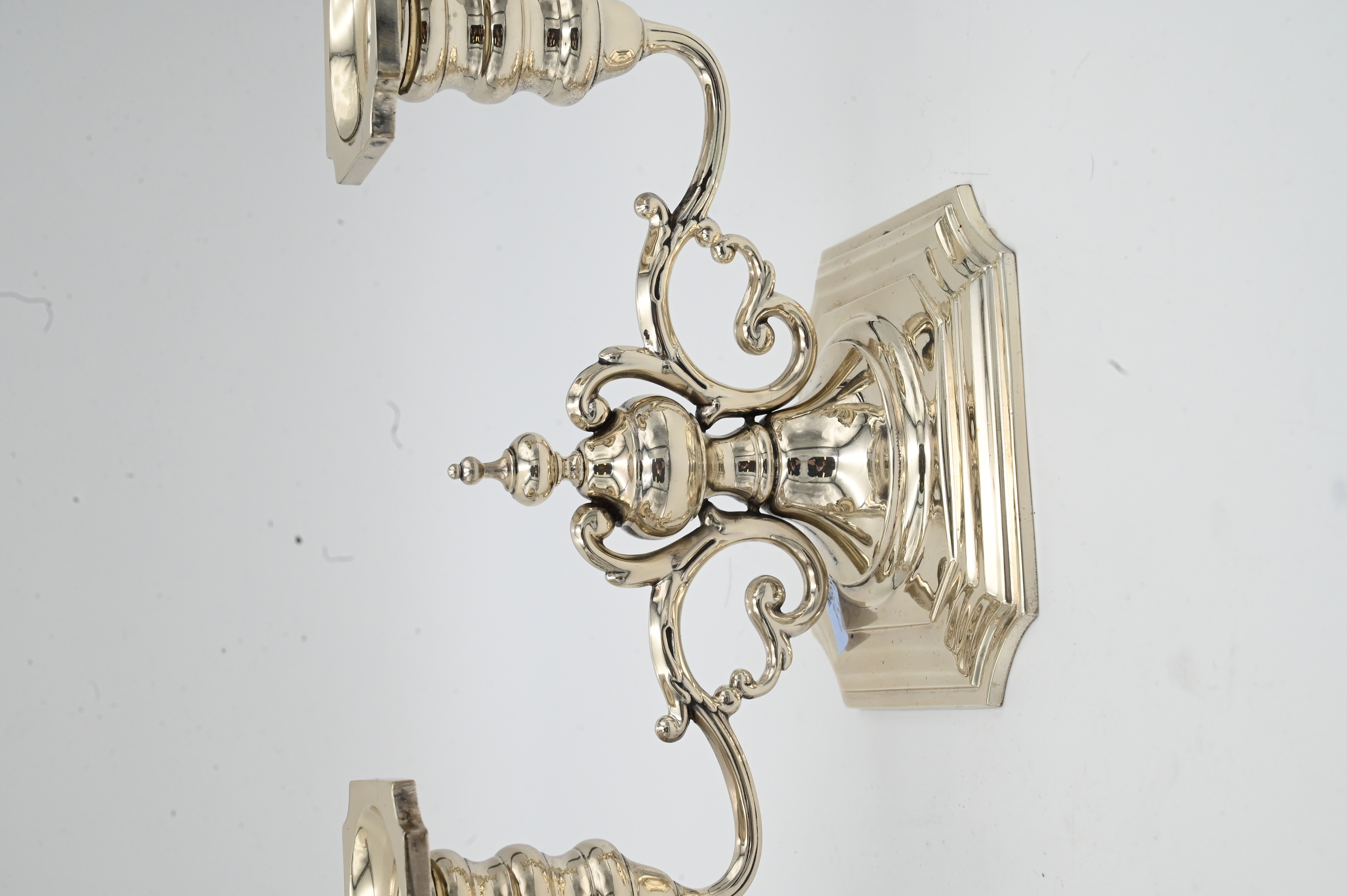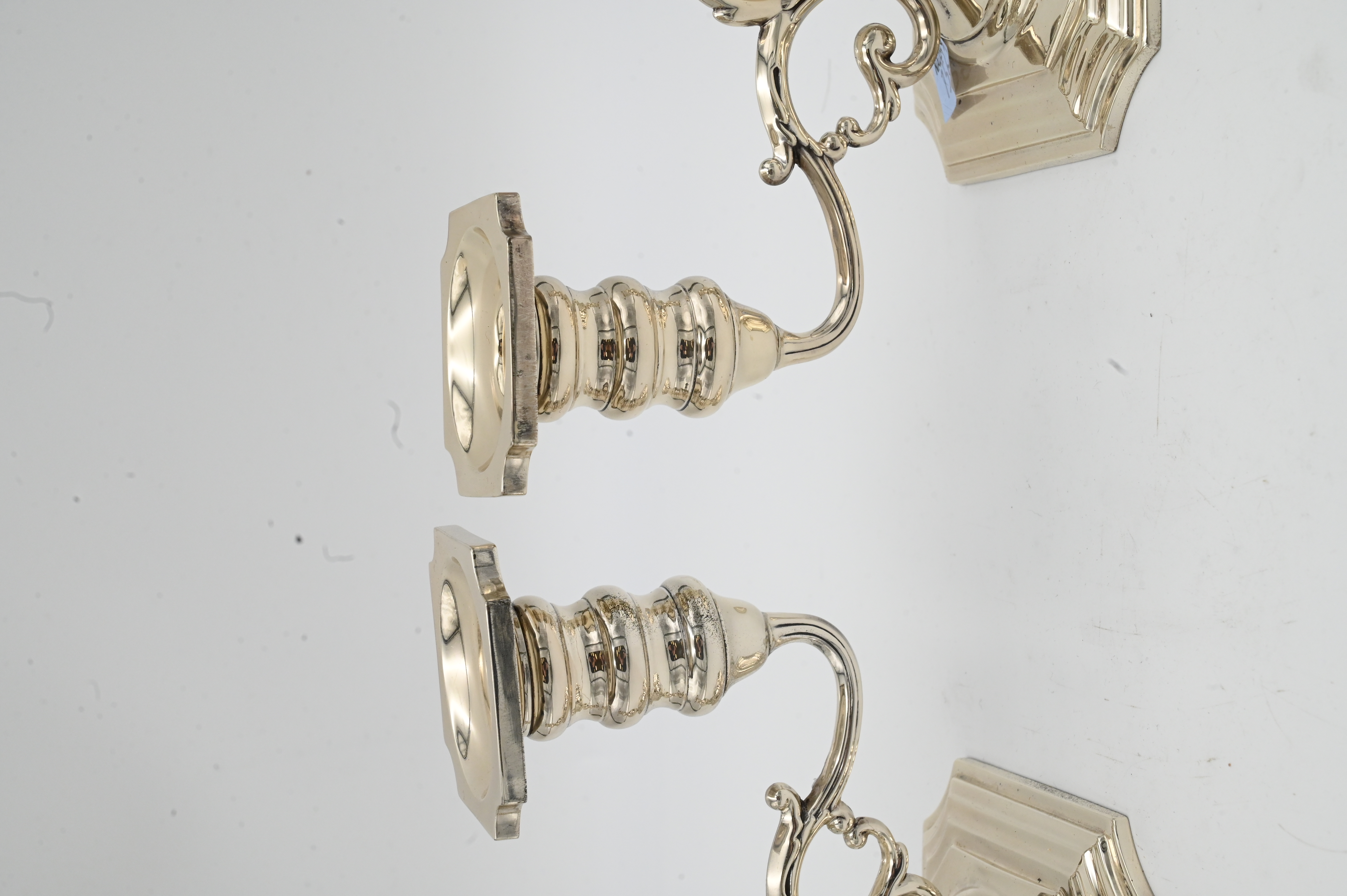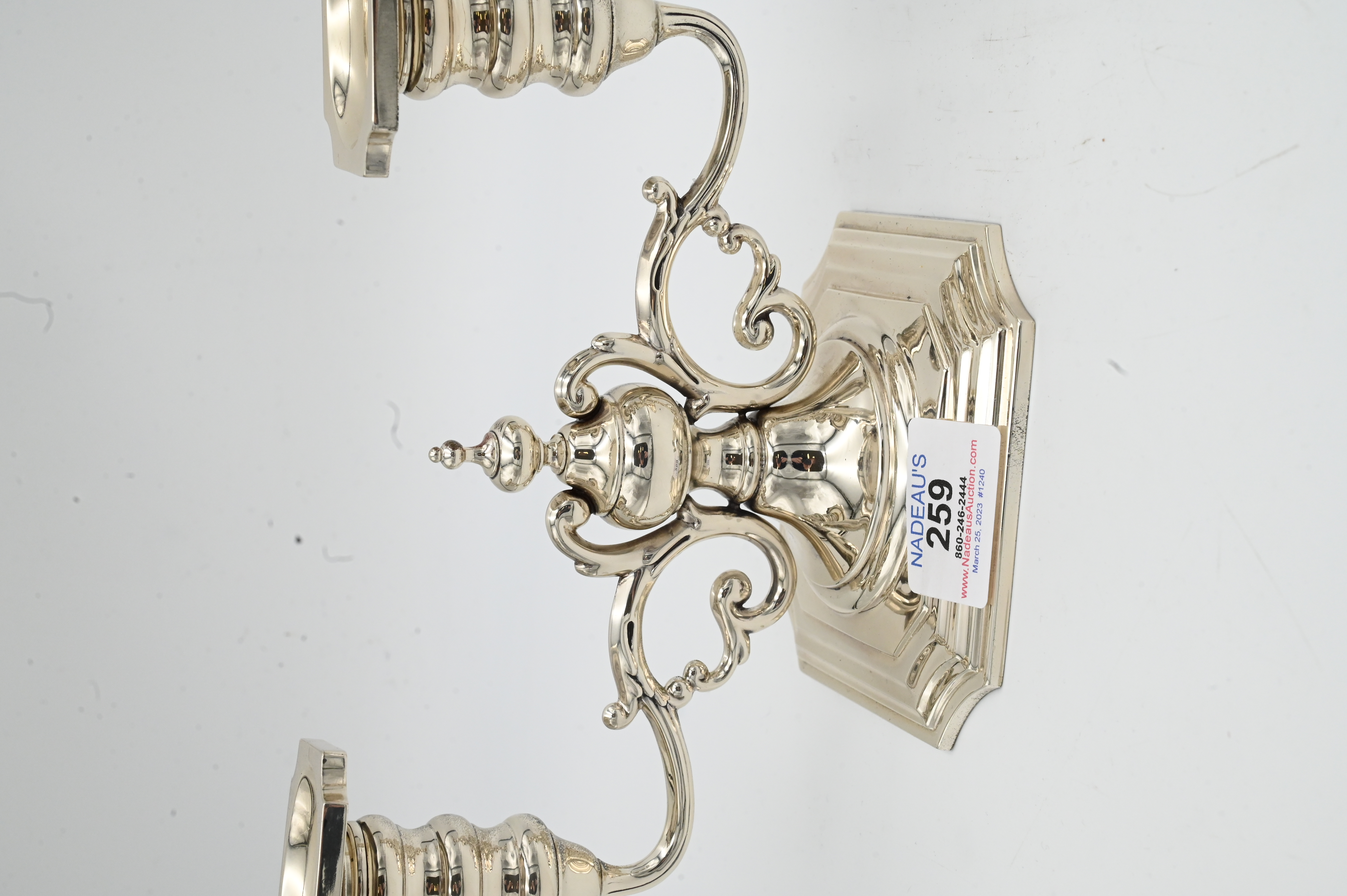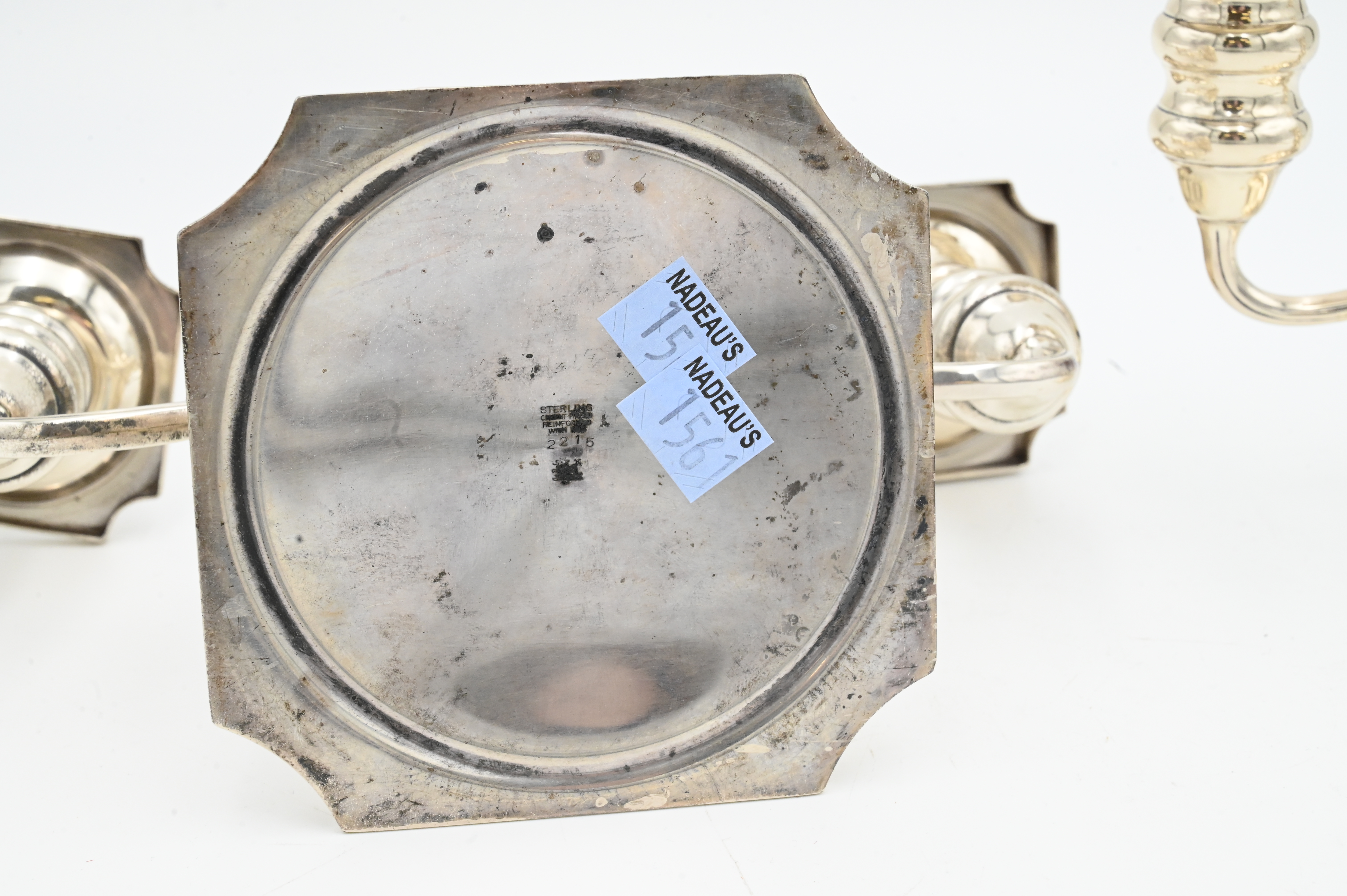 A Pair of Sterling Silver Candelabras, weighted, height 5 1/4 inches, width 10 inches.