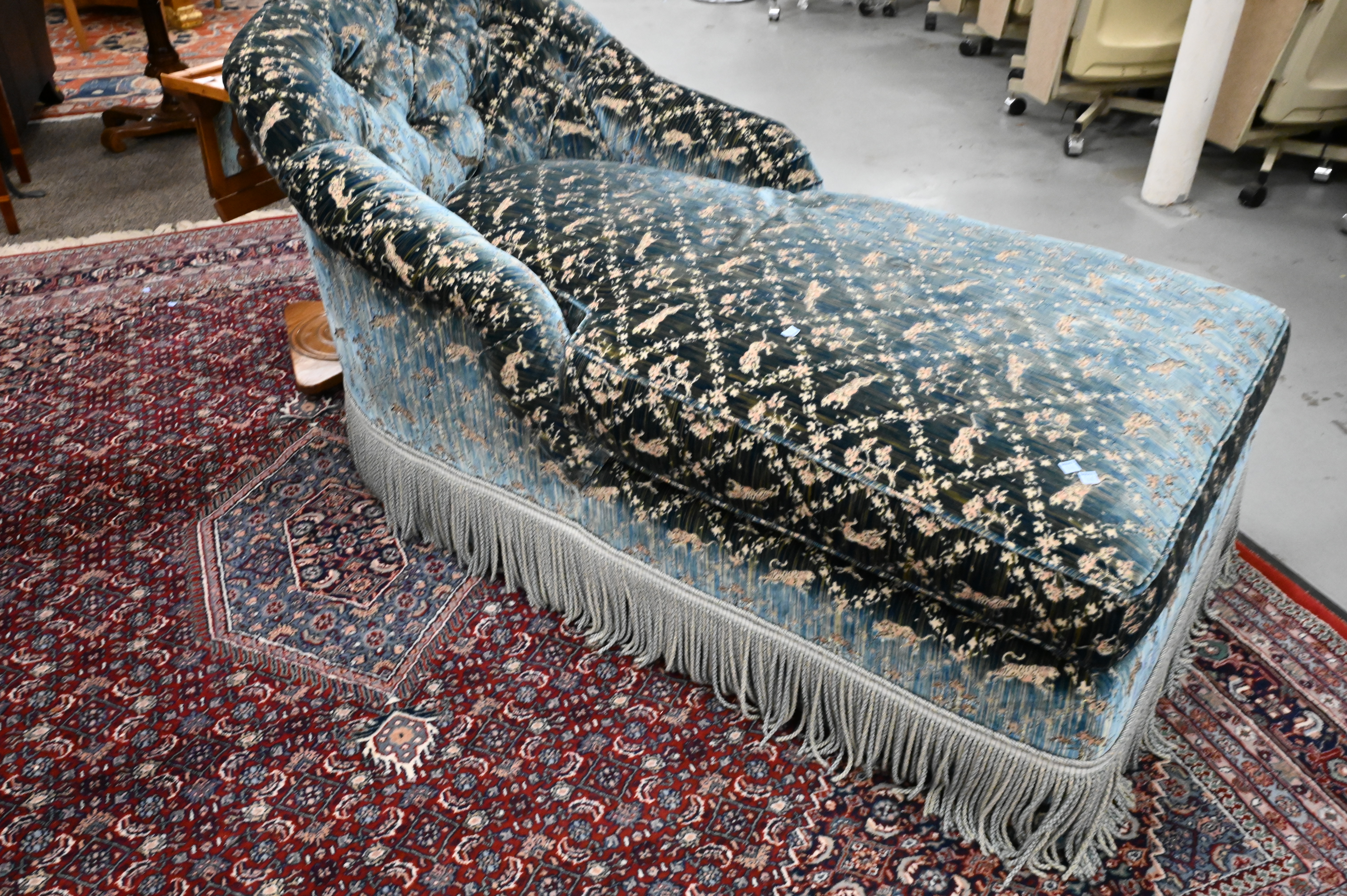 Scalamandre Sibtain Velvet Custom Upholstered Chaise Lounge, fabric having tigers and trees throughout, height 32 inches, width 32 inches, length 65 inches.