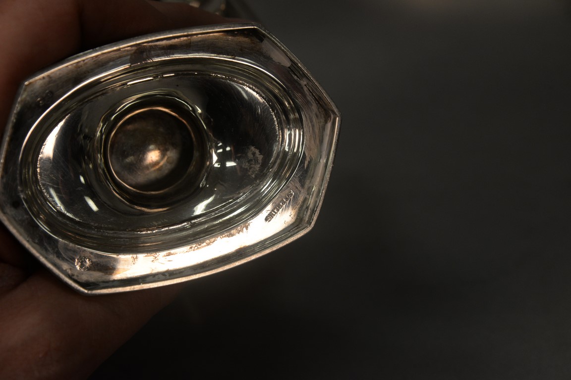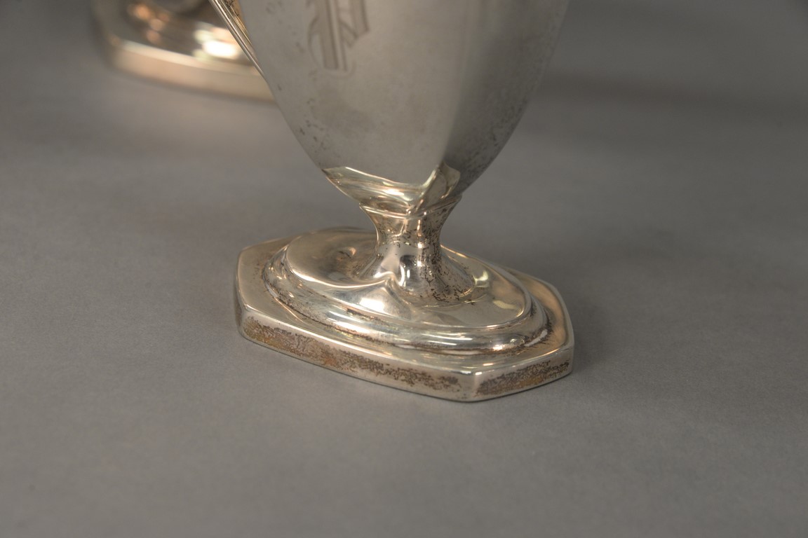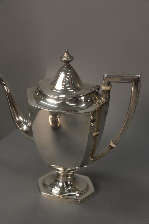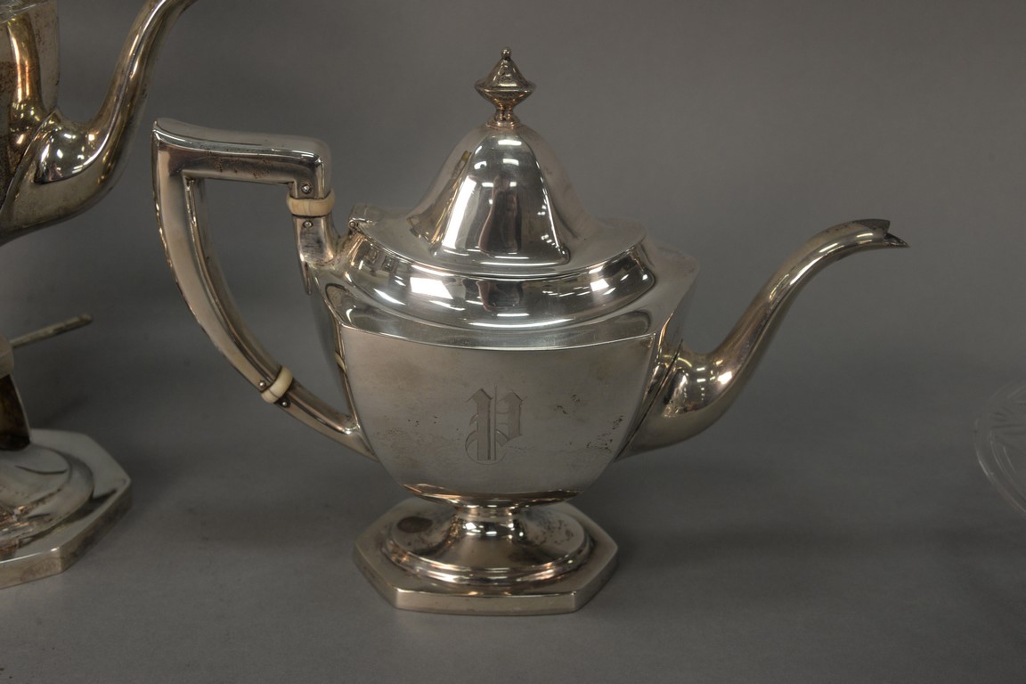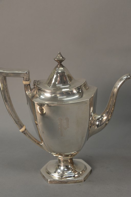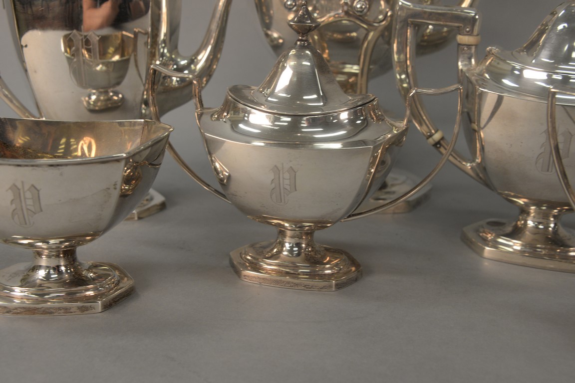 Six piece sterling silver tea and coffee set with tilting pot, coffee pot, teapot, sugar, creamer, and waste bowl.
