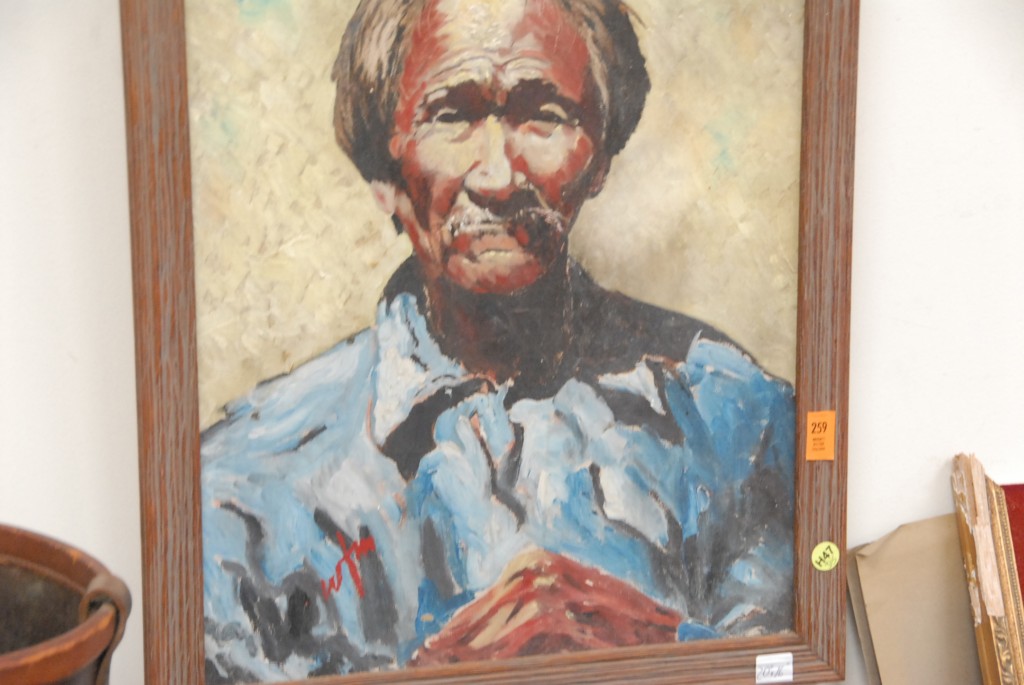 Three framed paintings N. Taylor water color Onions 9 1/2 x 13, an oil on canvas bust of a man 20 x 16, and a still life of fruit 15 x 18.