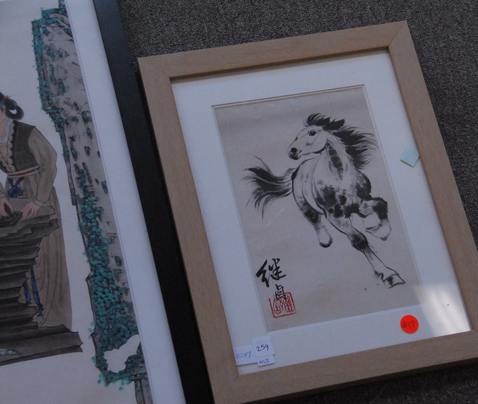 Lot 259: Three Oriental paintings watercolor of two Guanyin 25 x 16, watercolor of horse running 10 x 7, and watercolor of man sitting 2…