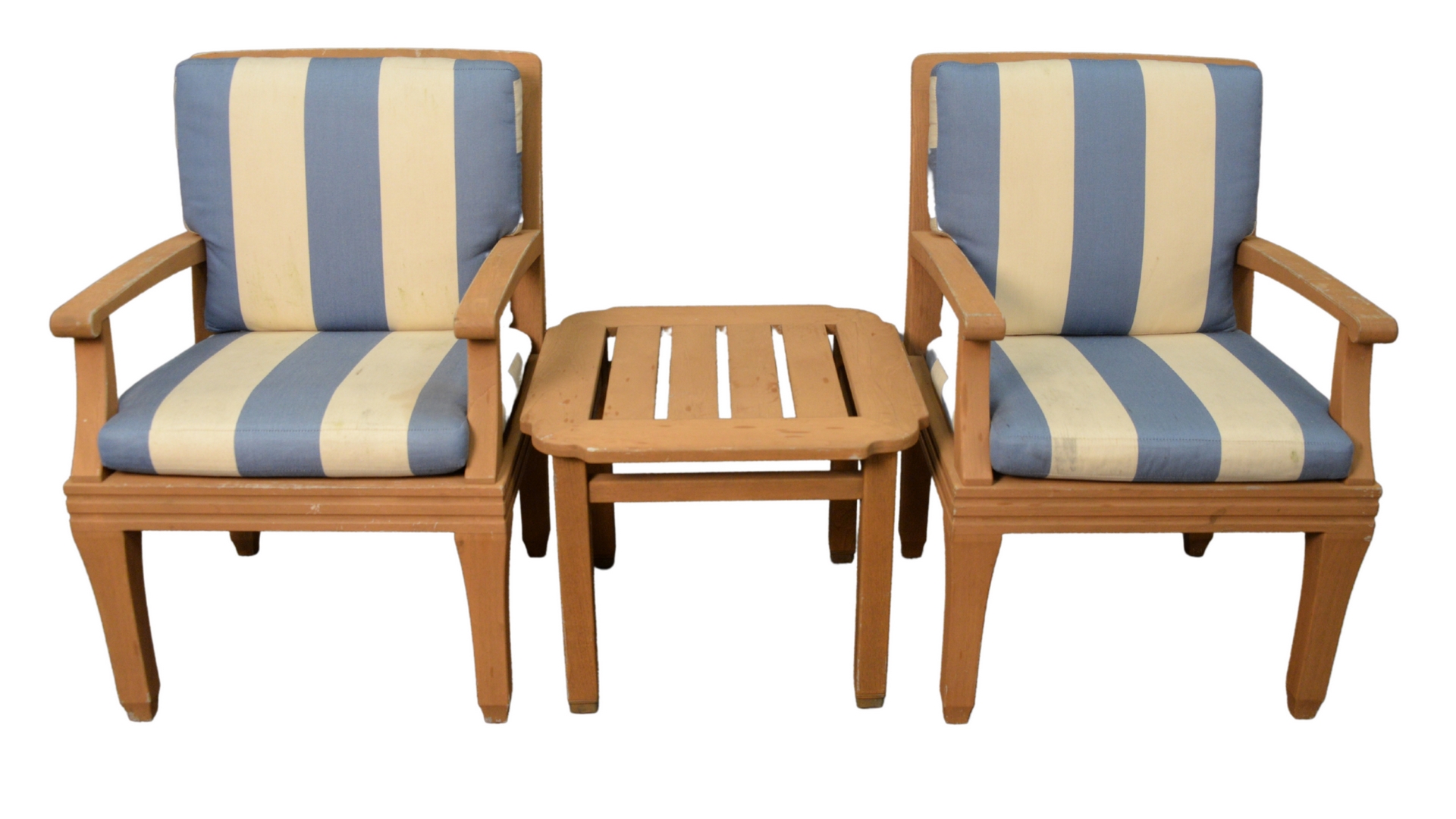 Lot 259: Three Piece Giati Designs Palazzio Outdoor Teak Set, to include two arm chairs along with a small stand.
