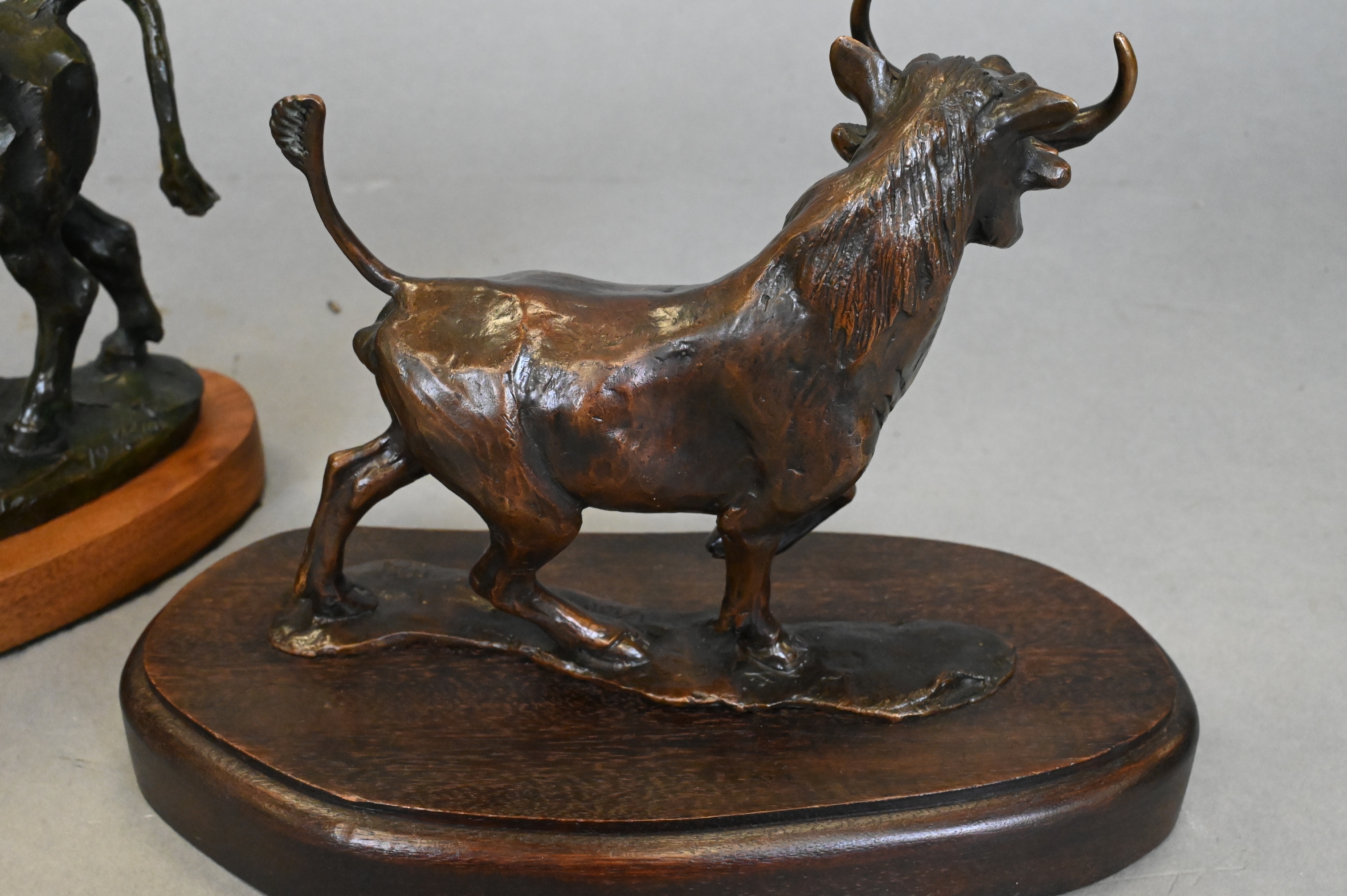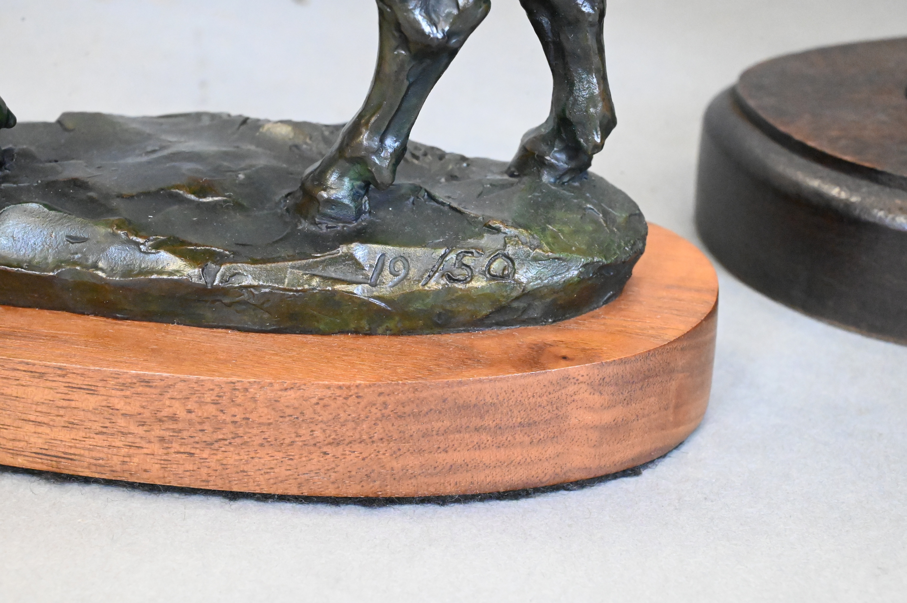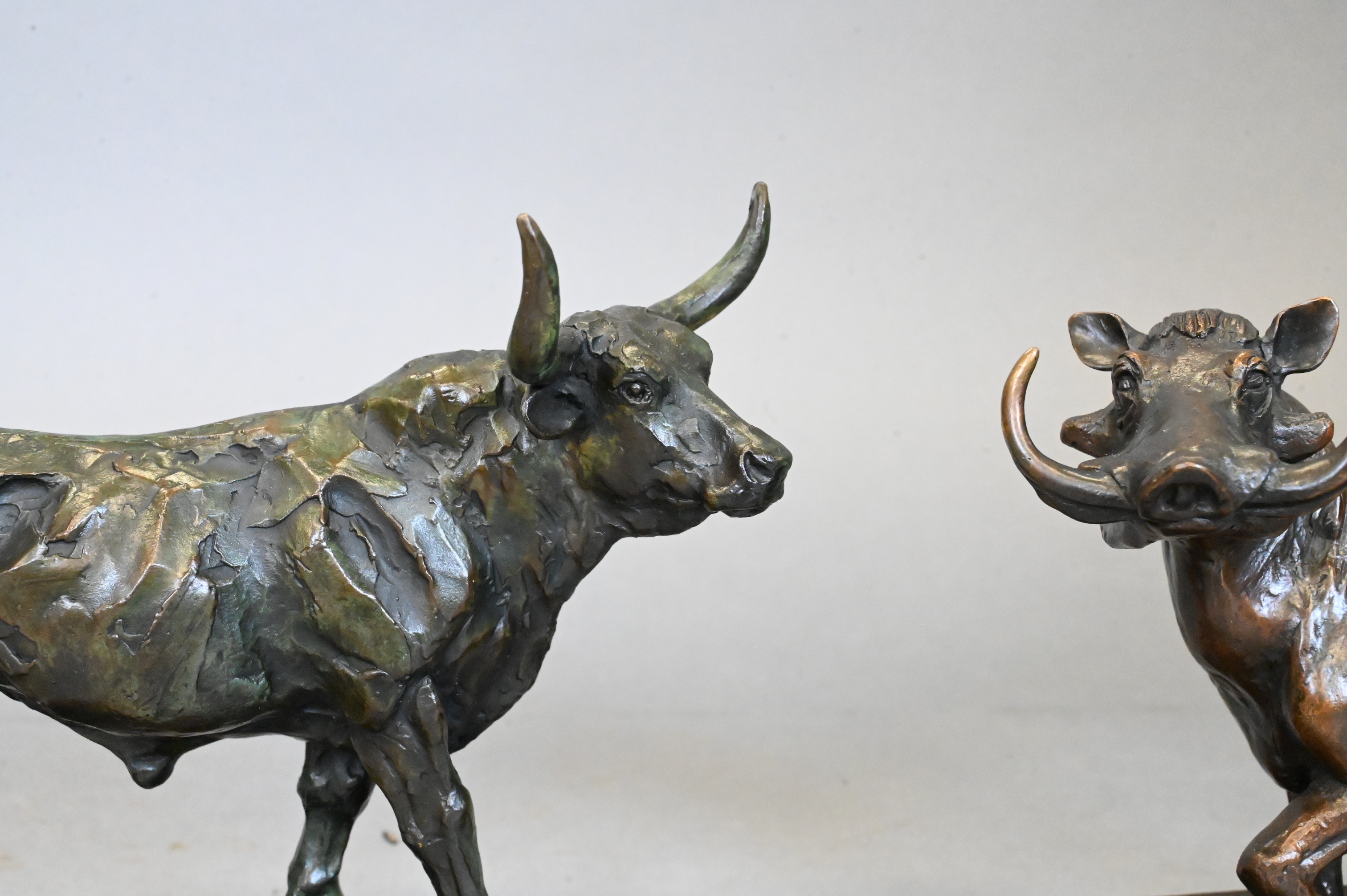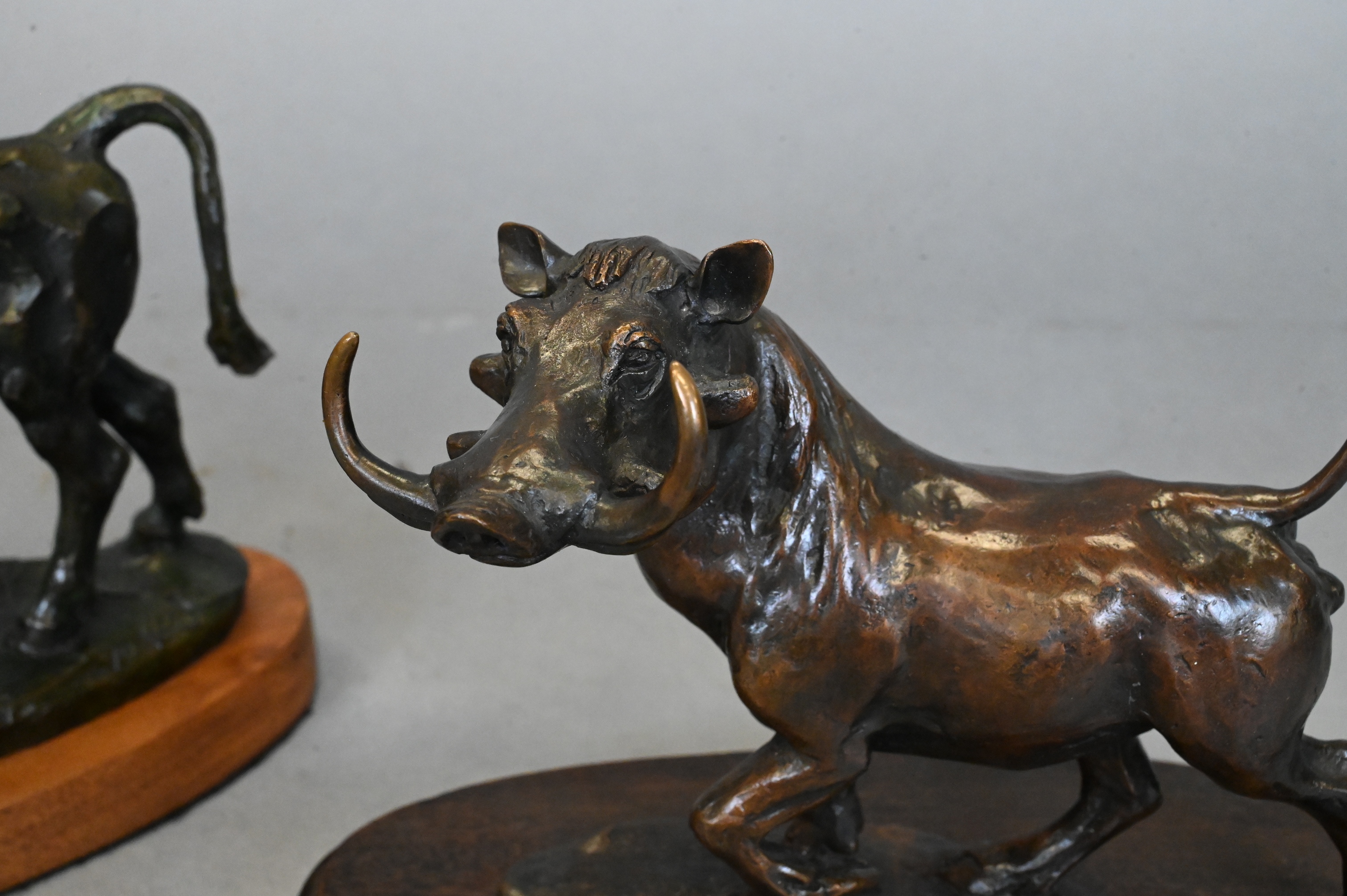 Bronze sculpture of a warthog in motion, modeled with expressive textured surface and mounted on an oval stained-wood plinth.