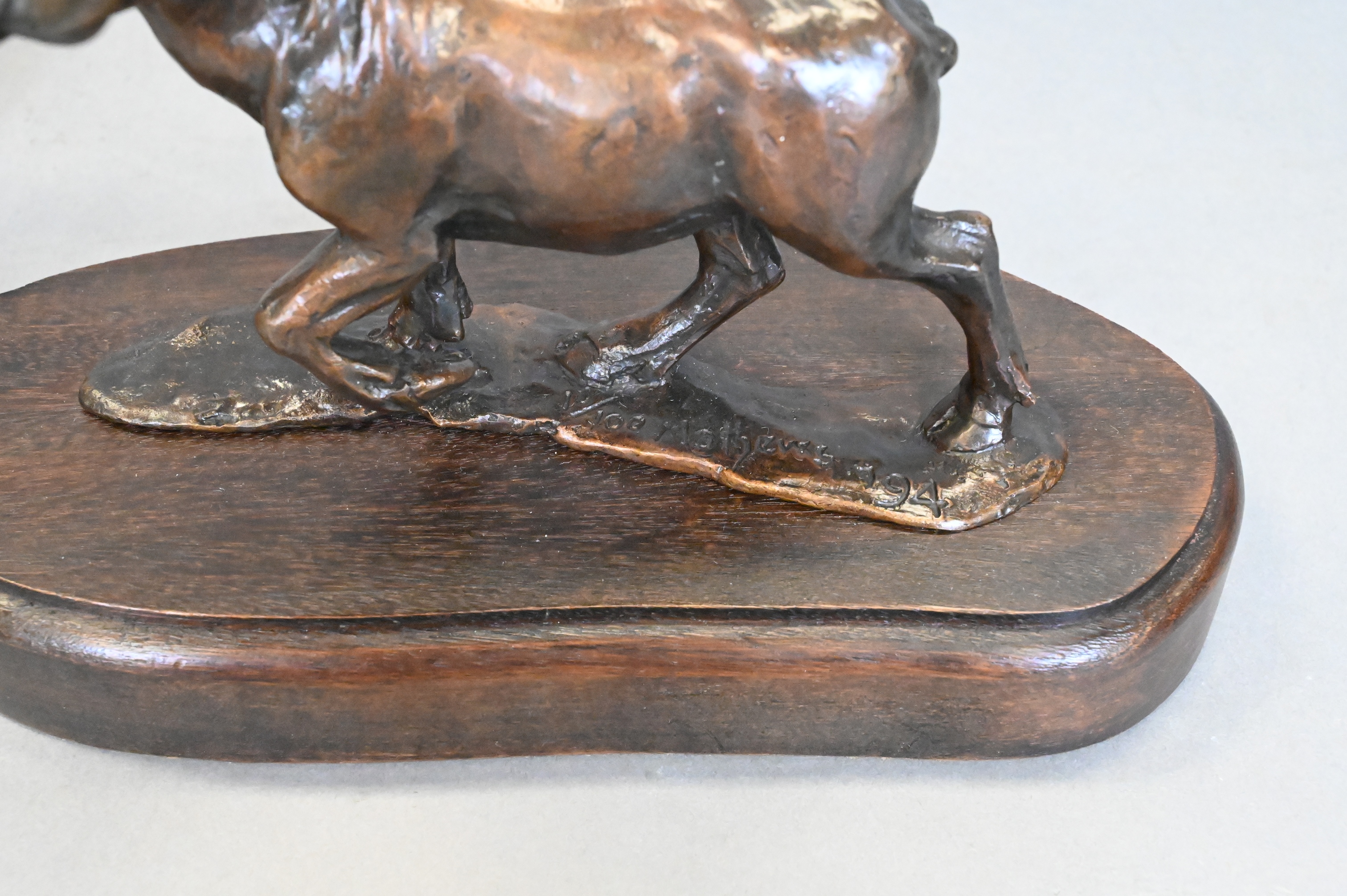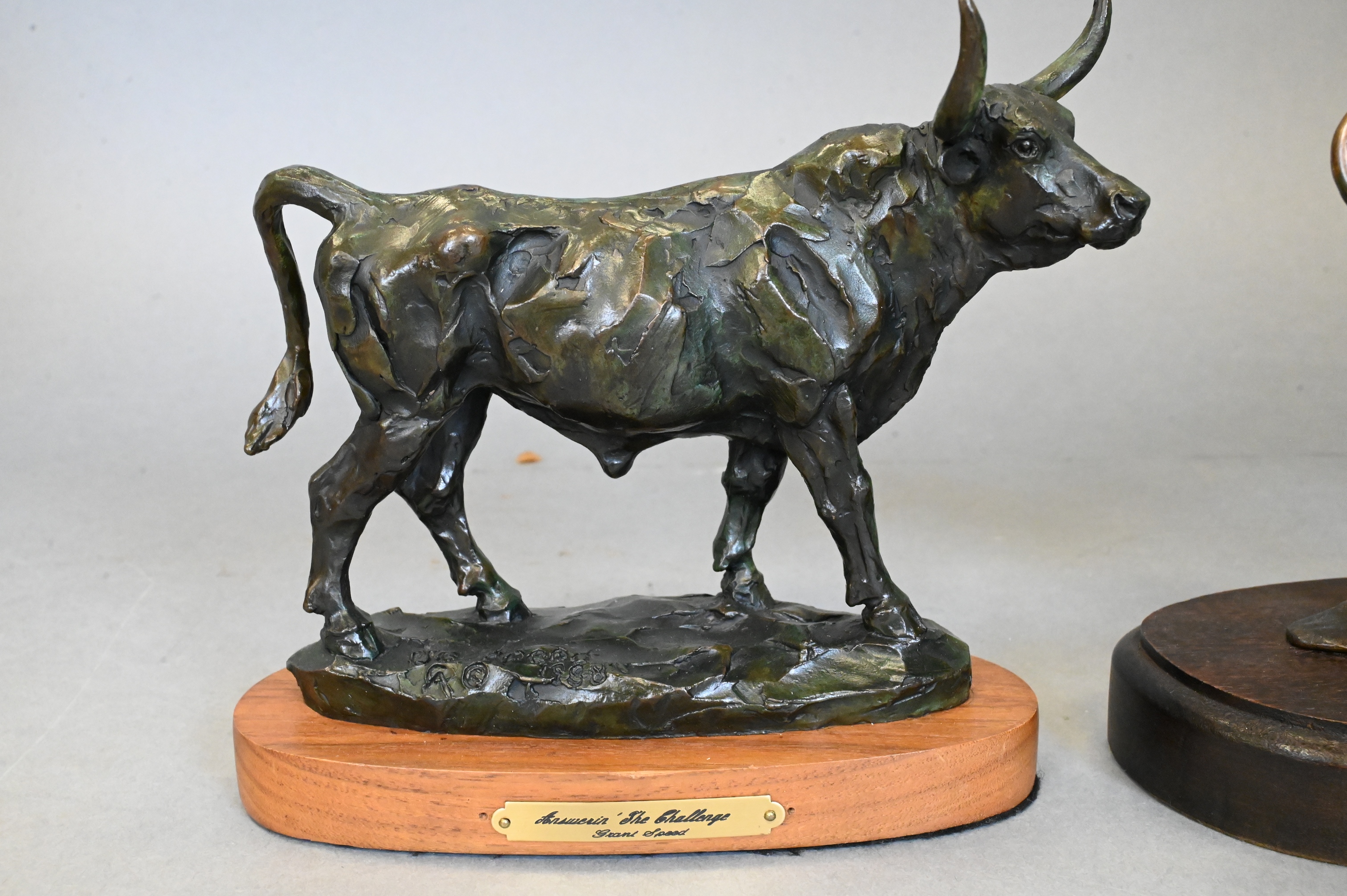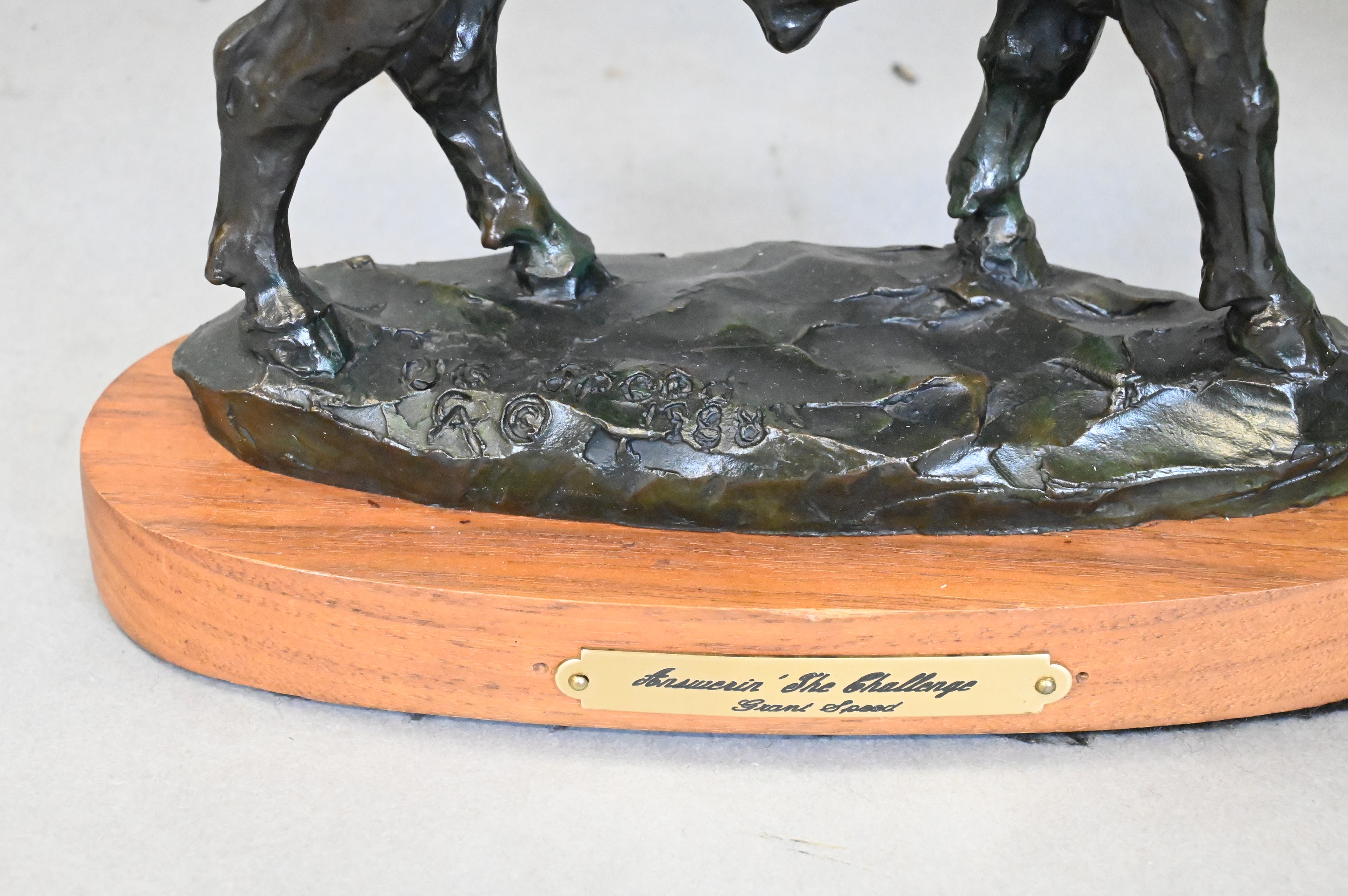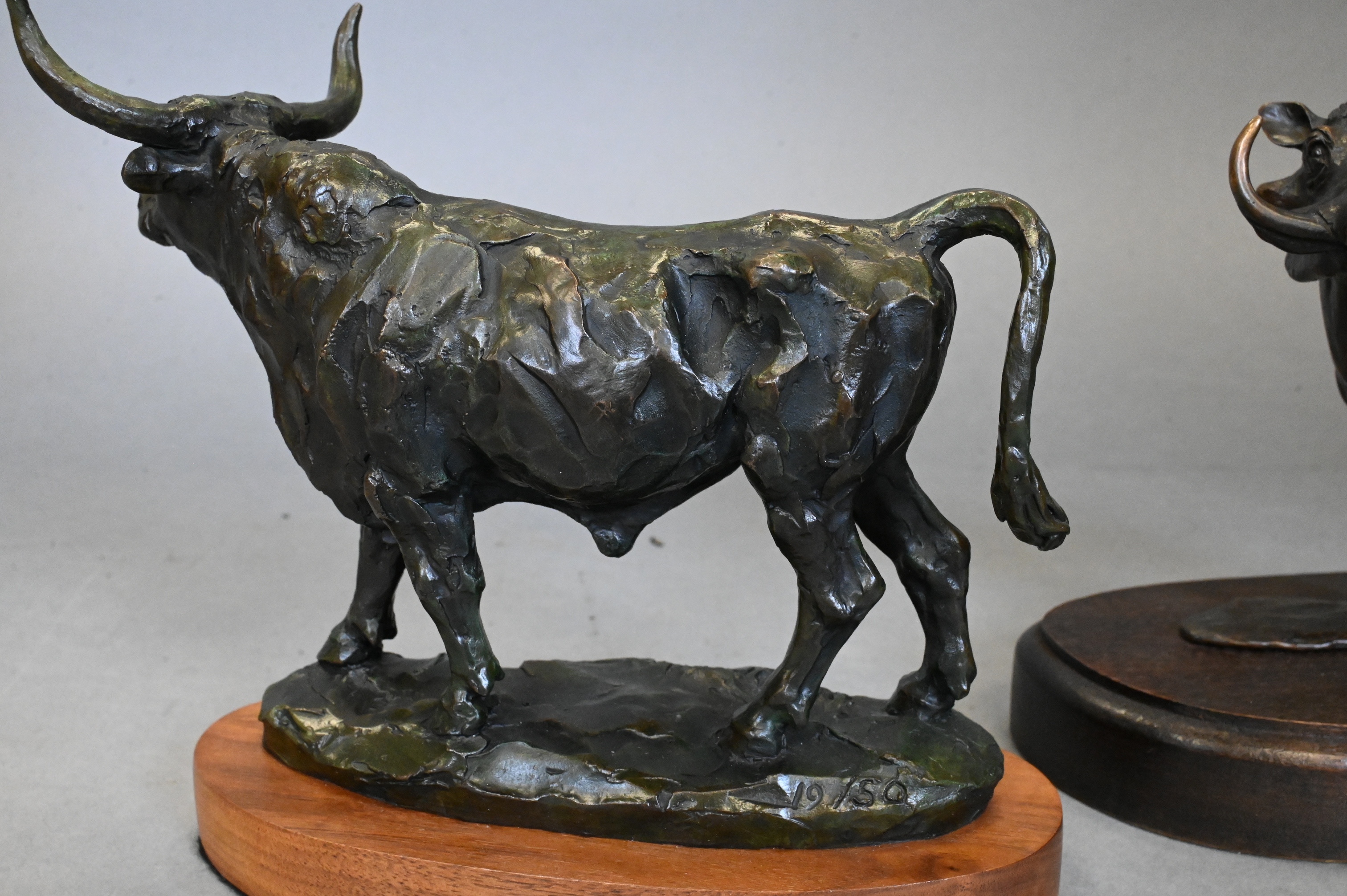 Bronze sculpture of a longhorn bull in stride, rendered with Speed’s characteristic textured modeling and mounted on an oval wood plinth with title plaque.