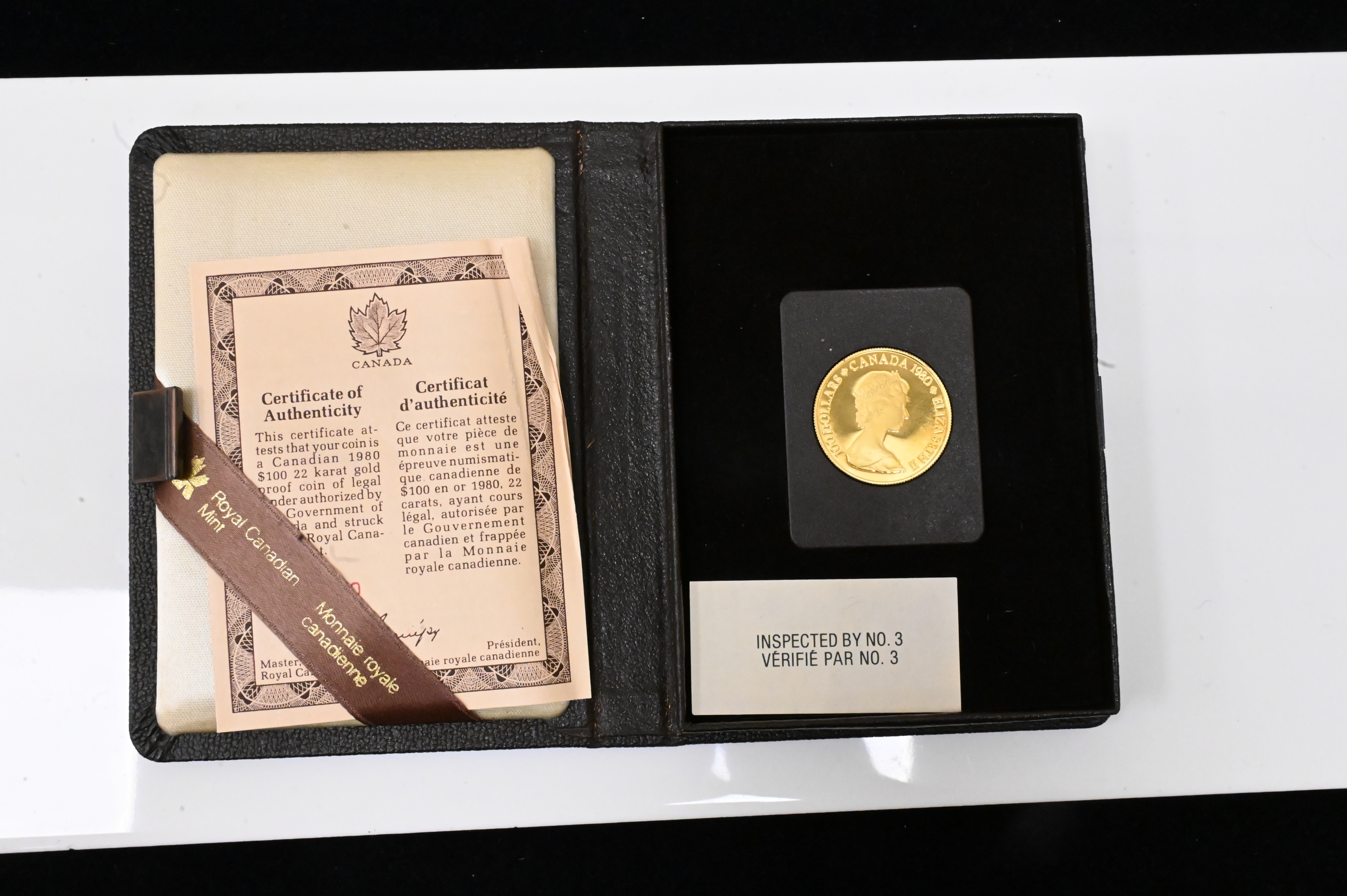 Two Canadian $100 22 Karat Gold Proofs, to include a 1980 Canadian $100 22 Karat Gold Proof, half ounce; along with a 1981 Canadian $100 22 Karat Gold Proof, half ounce; both with boxes, 1 oz total