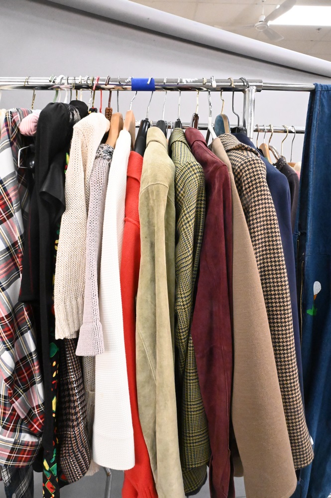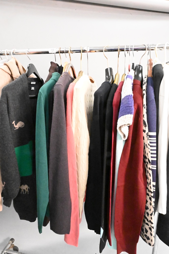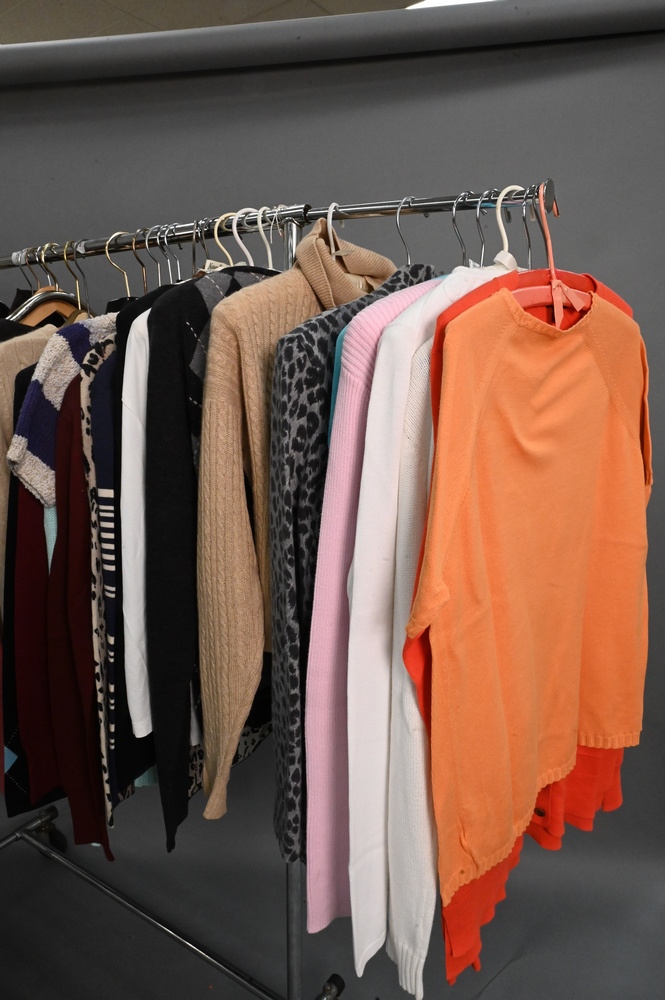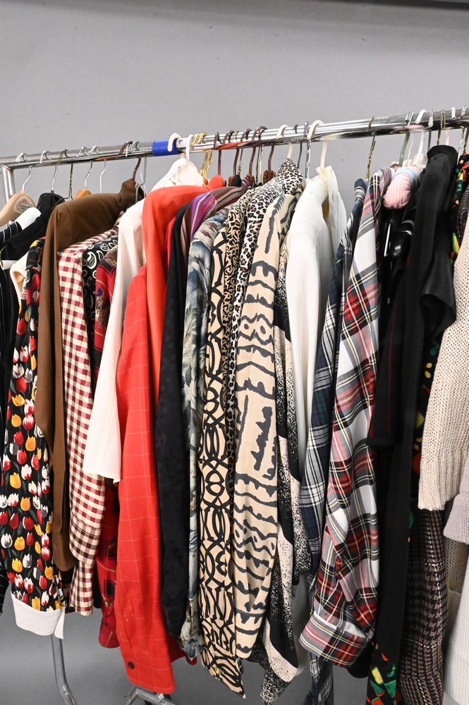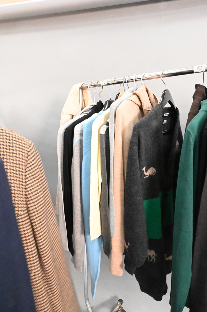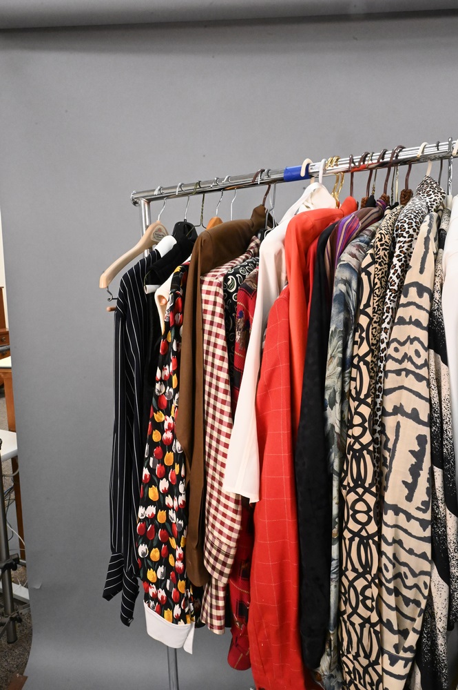 Lot 259: Two Racks of Vintage Women’s Clothing, to include sweaters, blazers, and blouses from Brooks Brothers, Rewe, Jean-Louis Scherrer, Sa…