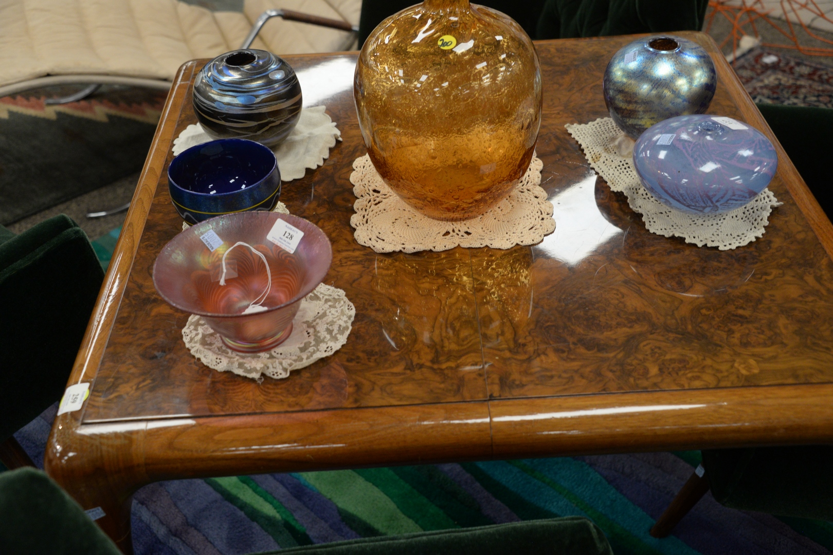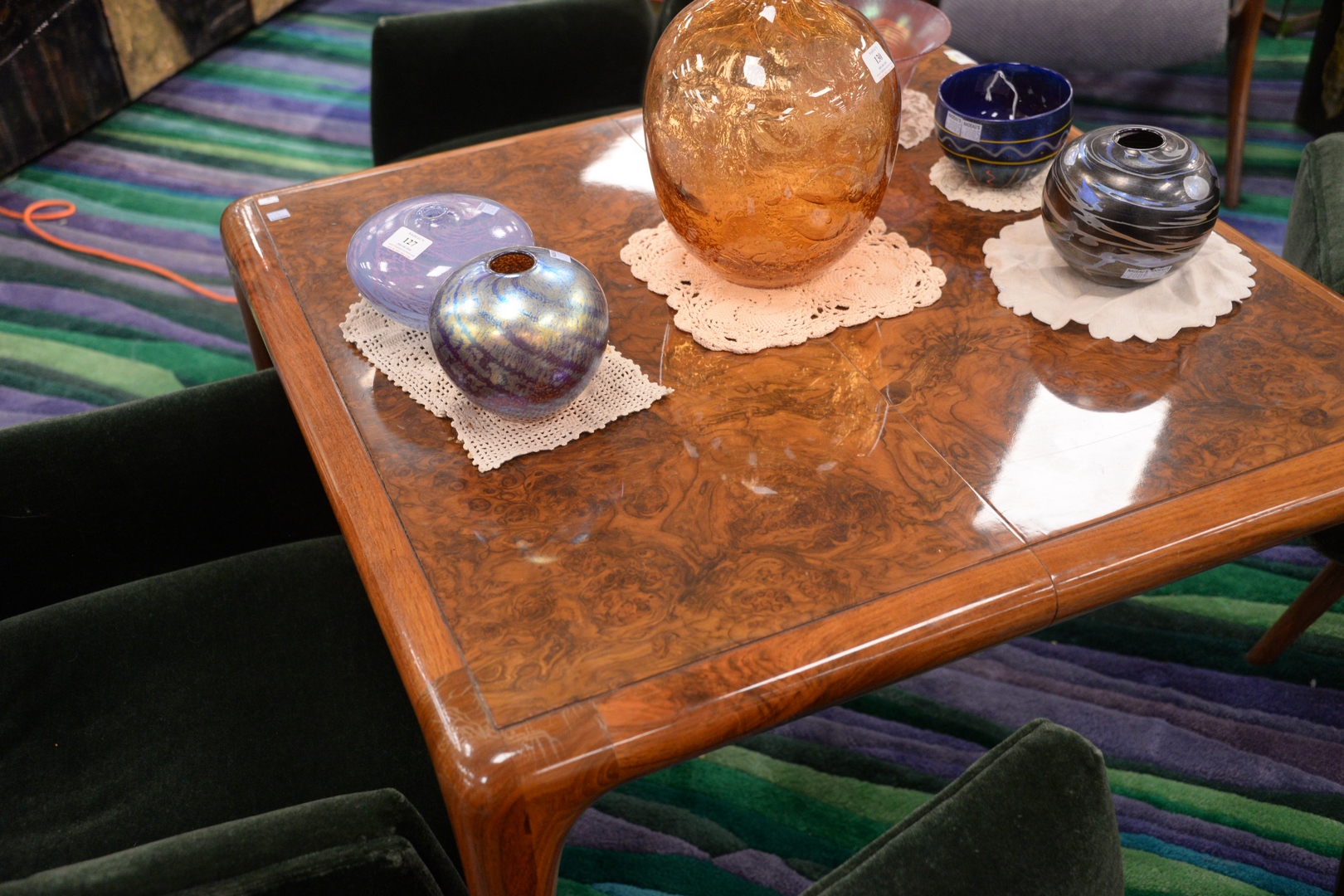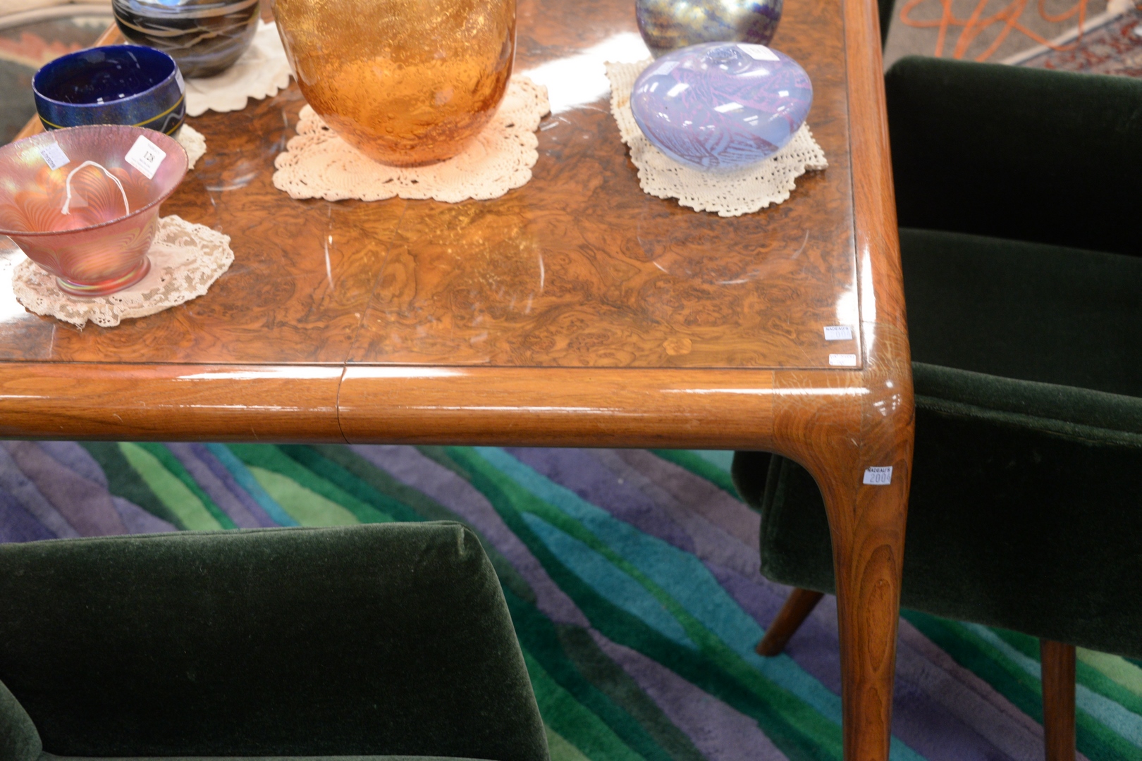 Lot 259: Vladimir Kagan Card Table, having burled top with walnut base, stamped Kagan on bottom, with one 27 3/4 inch leaf, height 28 inches, top 34″ x 34″, open 34″ x 61 3/4″. Provenance: The Estate of Alina Roisen, Park Avenue, New York.