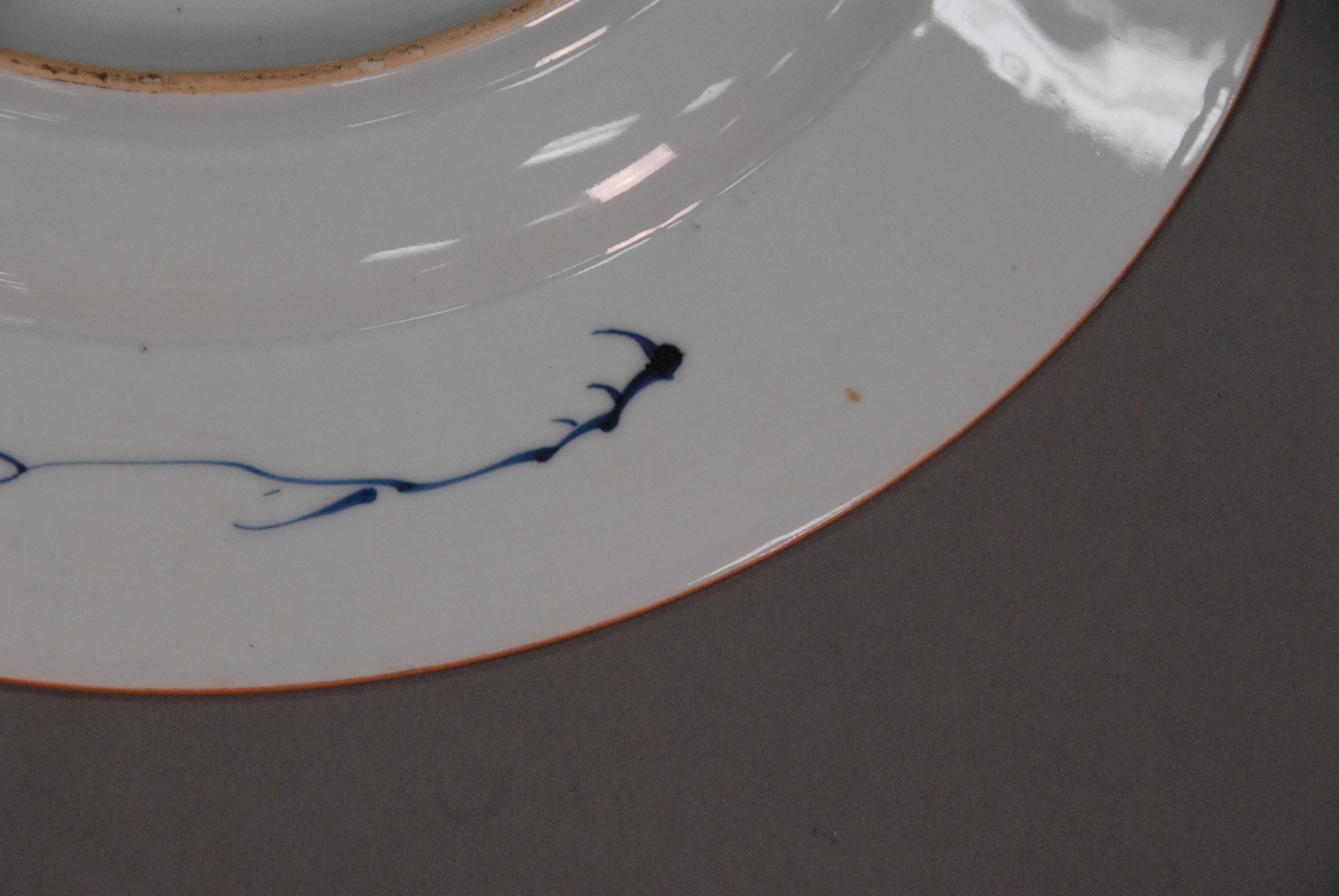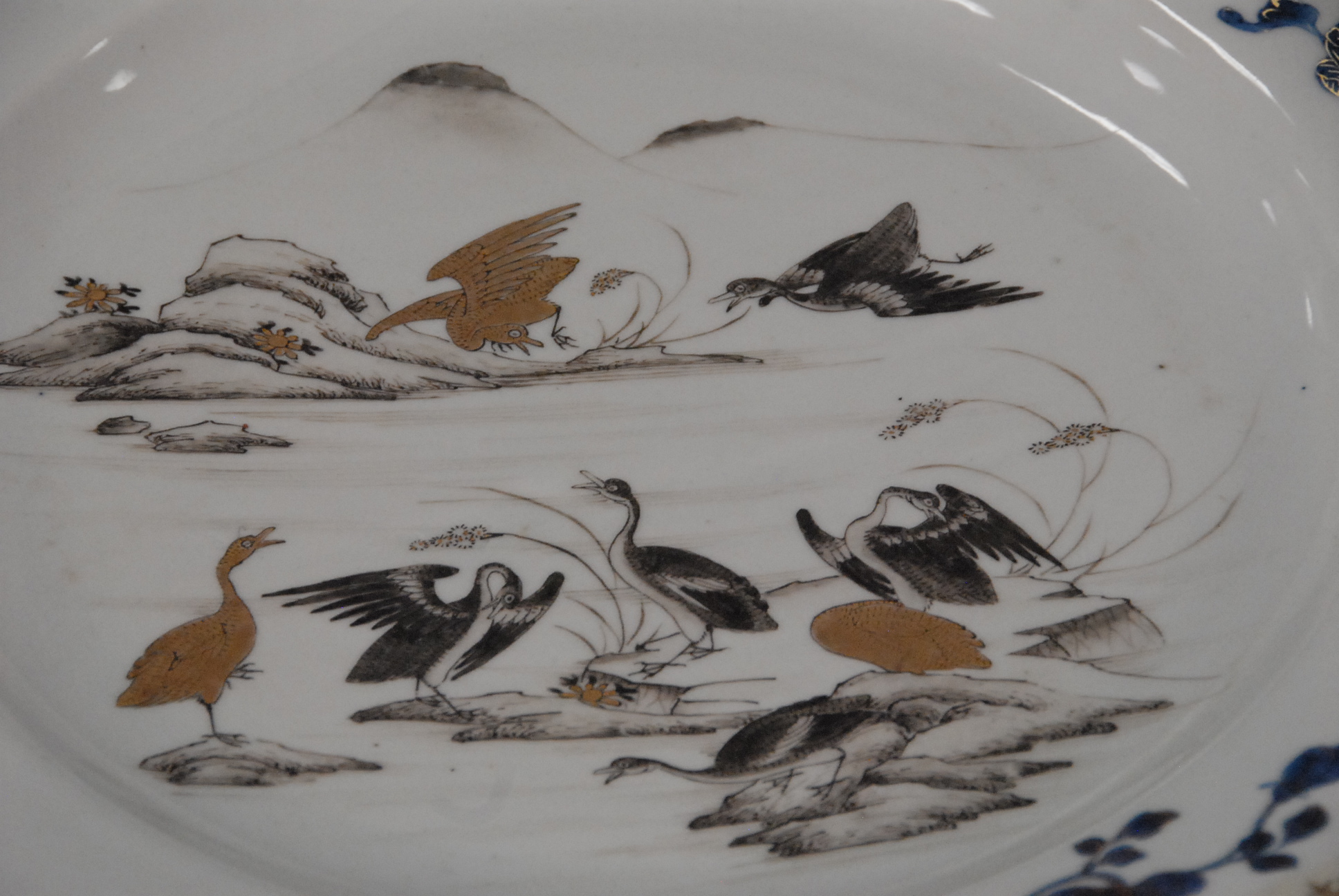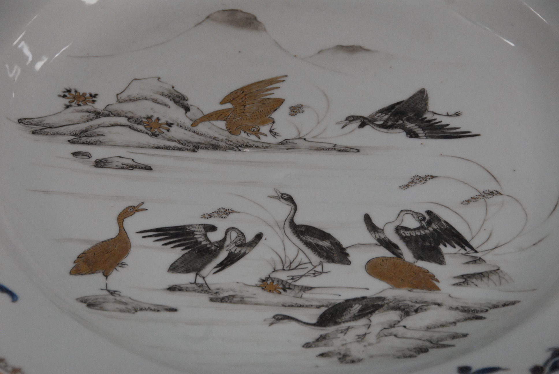 A rare pair of blue, gold, and black saucer / dishes having a wild flower border and a group of ducks in the center, probably 17th century, repaired.