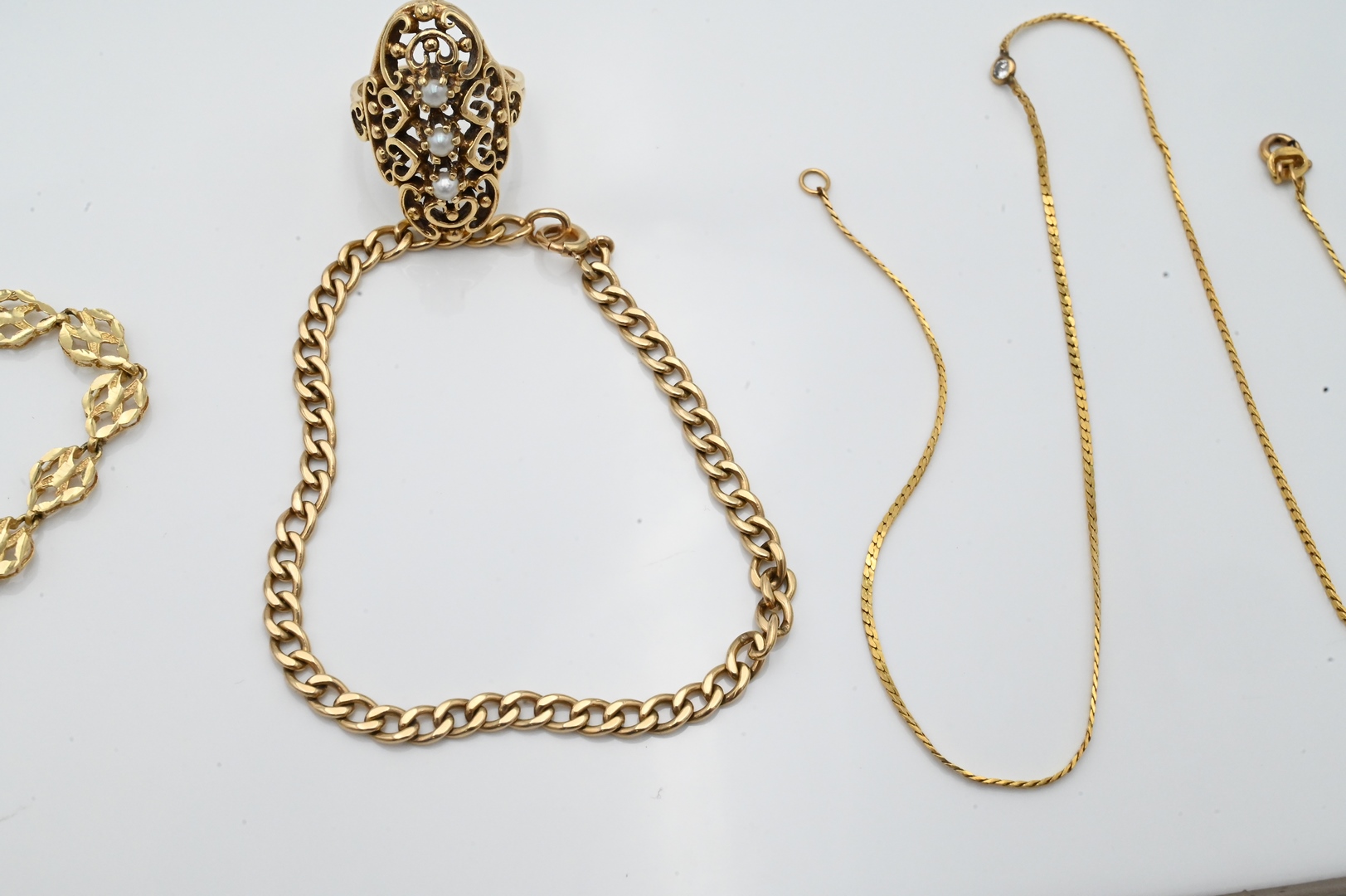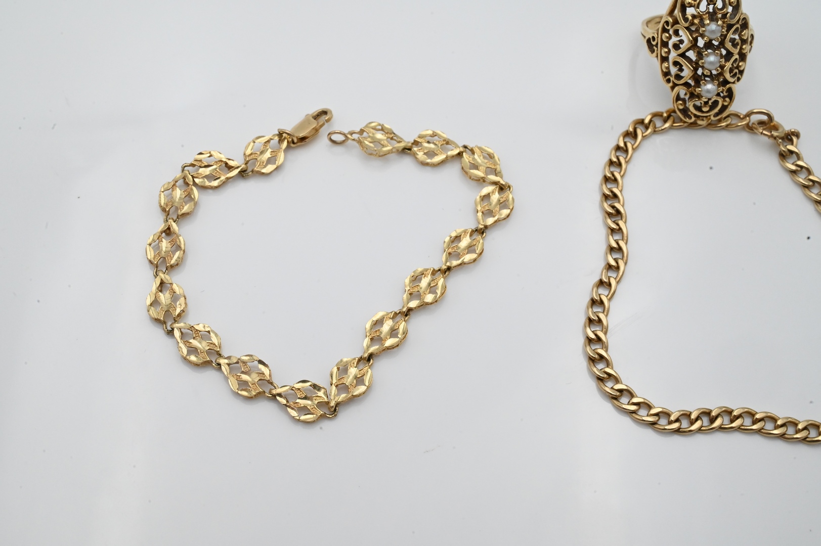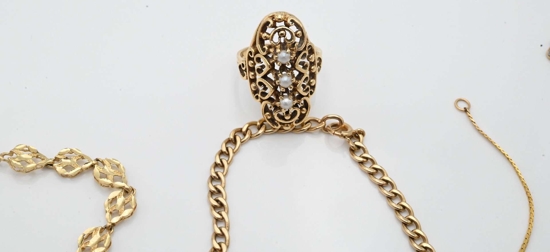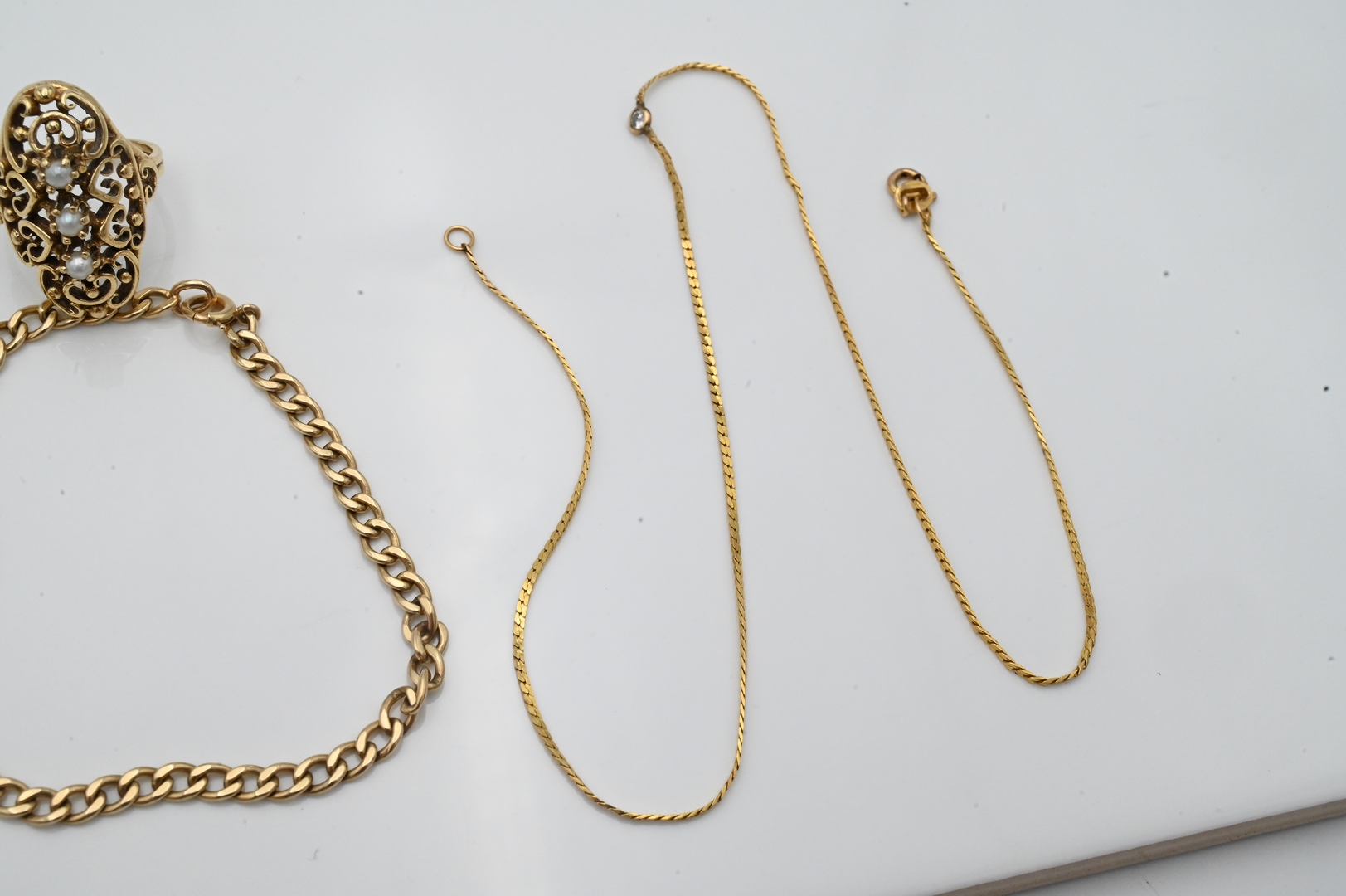 Four Piece Lot, to include a 14 karat gold flat necklace having small diamond, two 14 karat gold bracelets, along with a 14 karat gold ring set with three pearls; 21.7 grams.