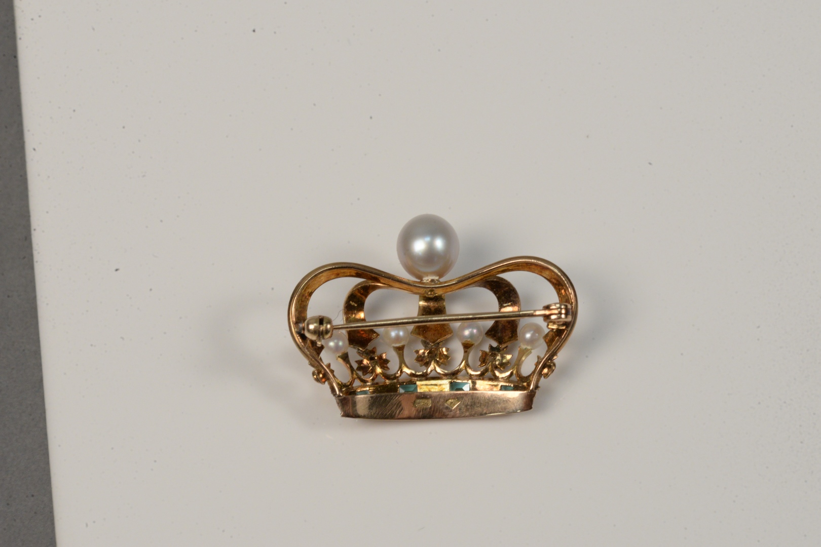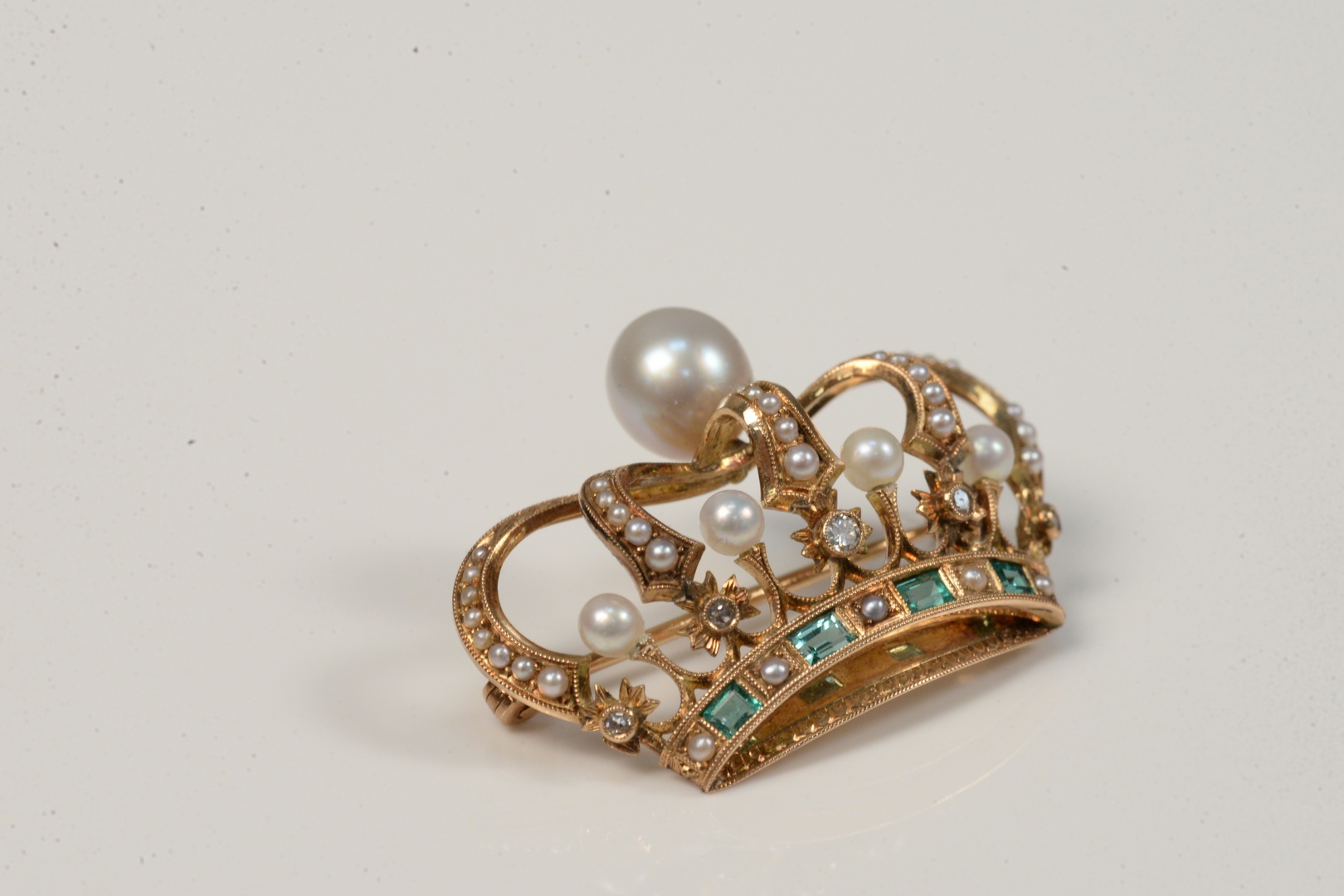 14 Karat Gold Crown Brooch set with pearls and green stones width 1 3/8 inches 5.8 grams