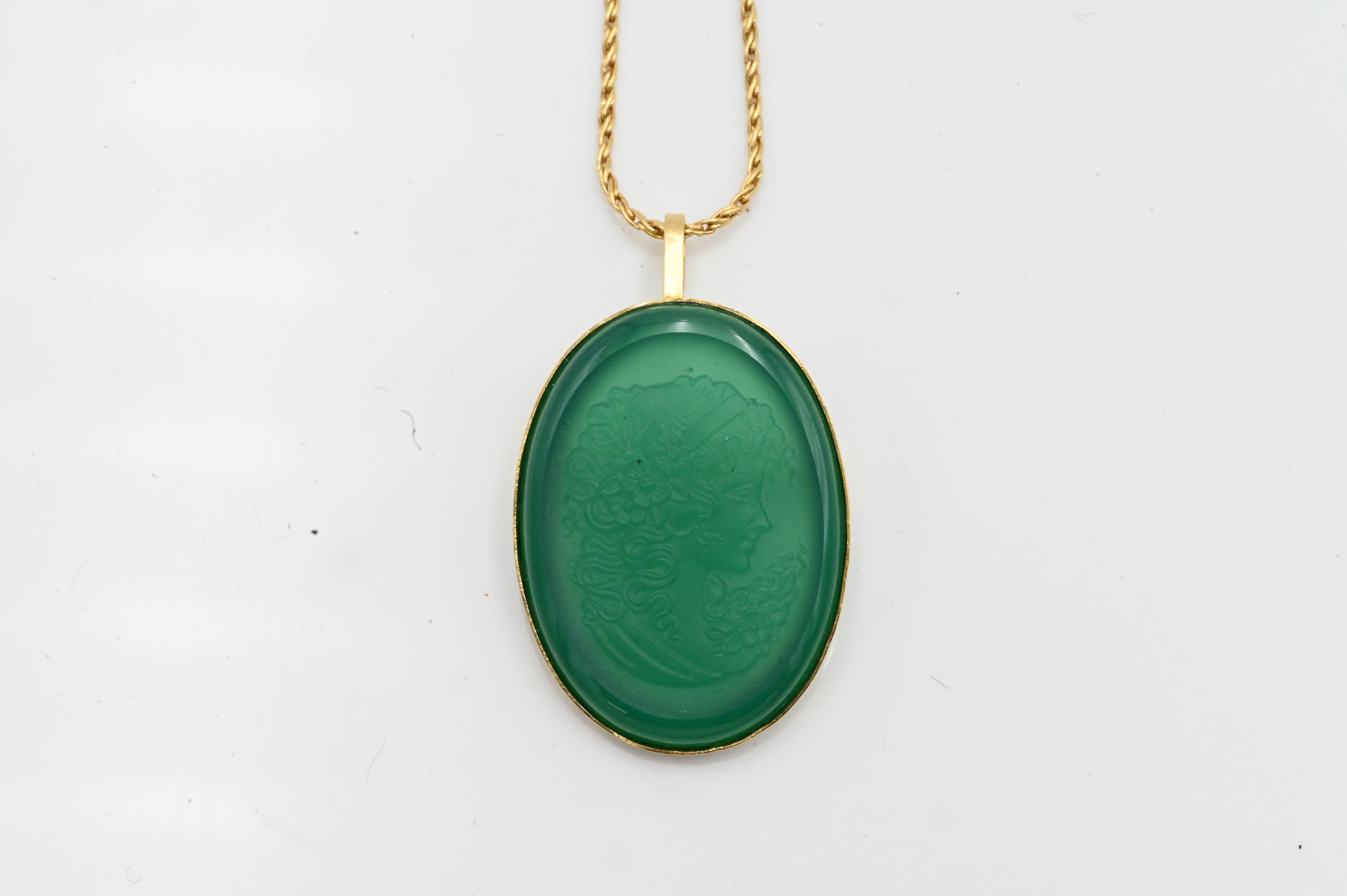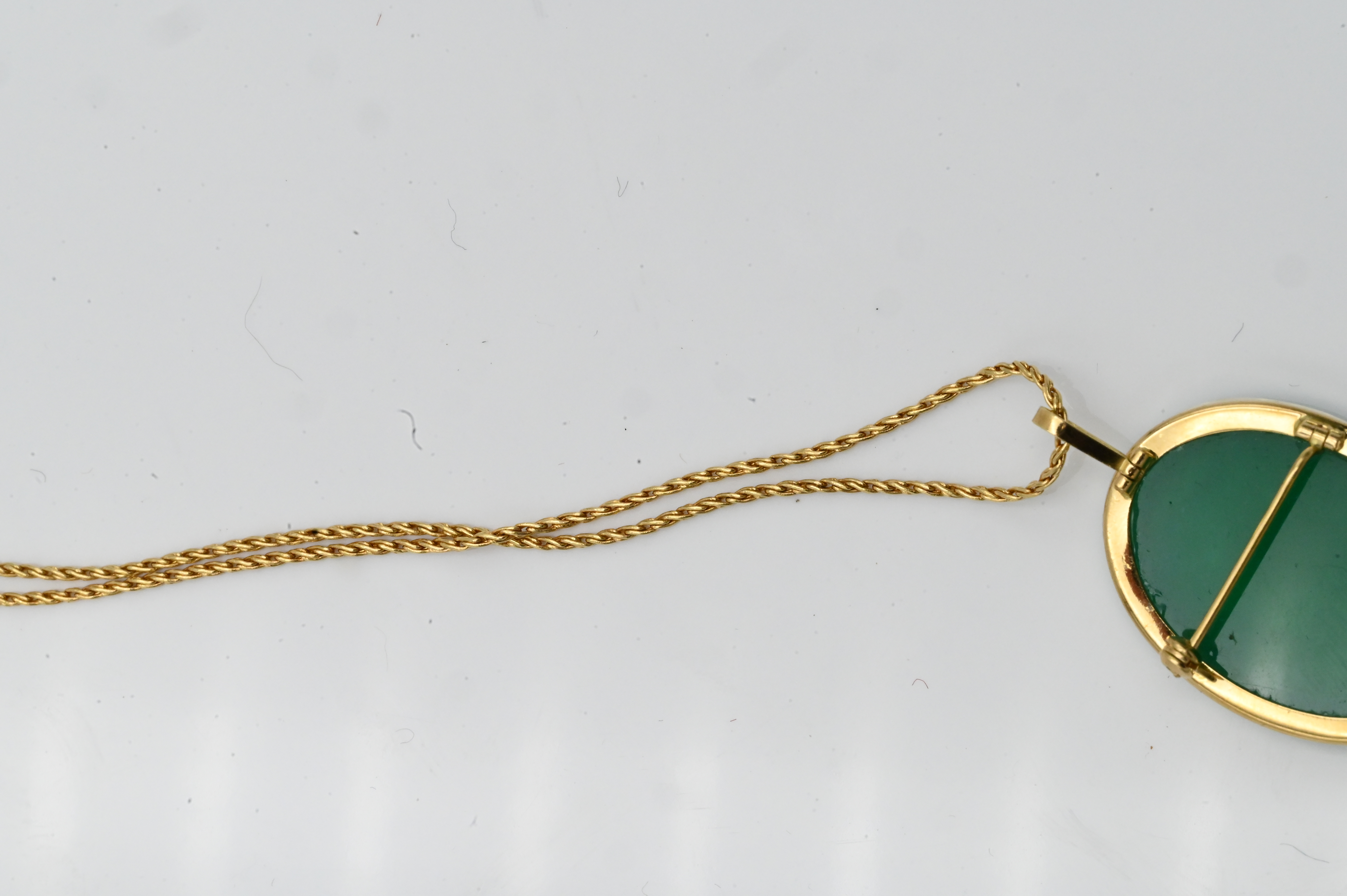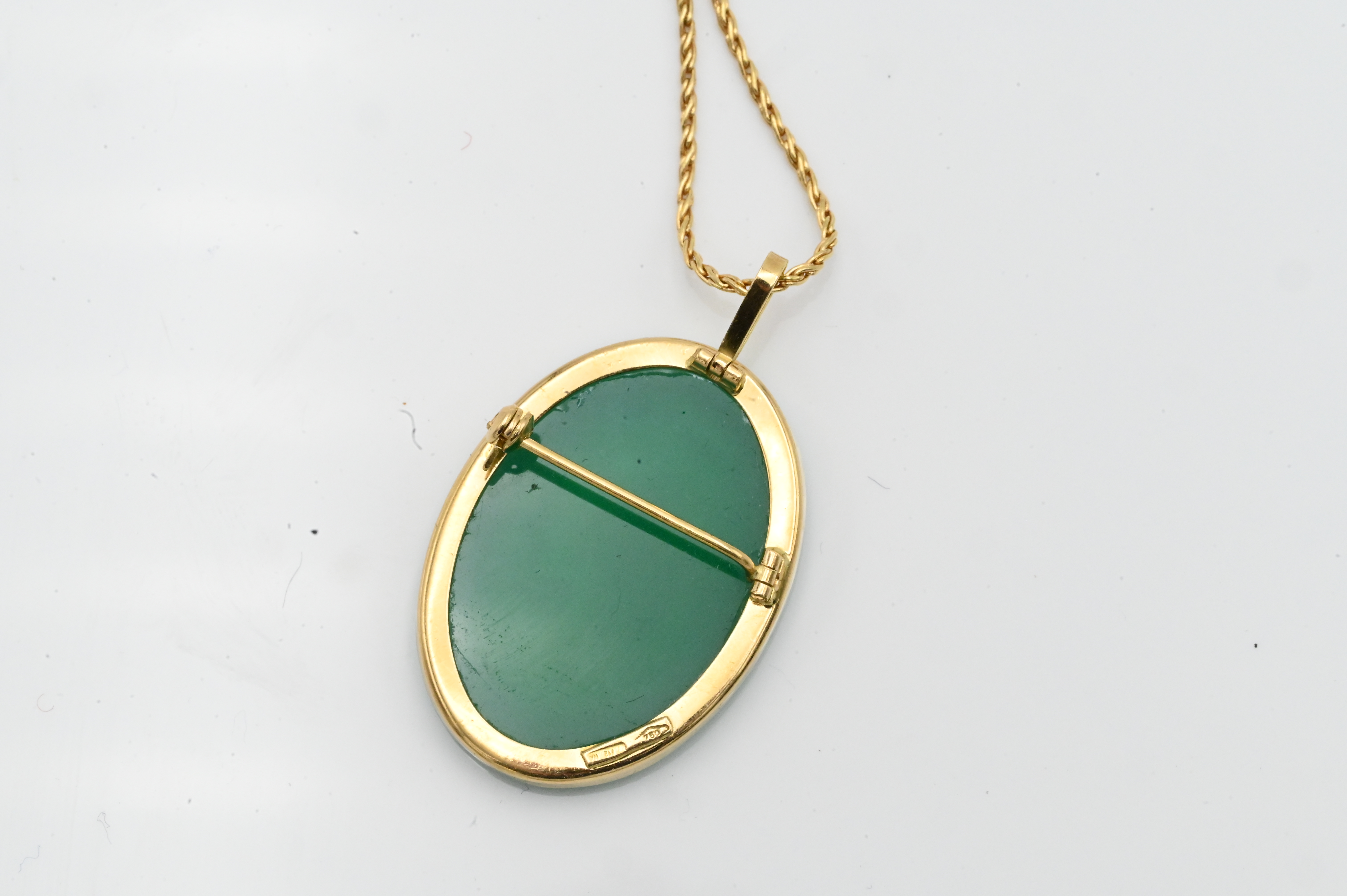 14 Karat Yellow Gold Necklace, having 18 karat yellow gold mounted green cameo, 9.7 grams total weight.